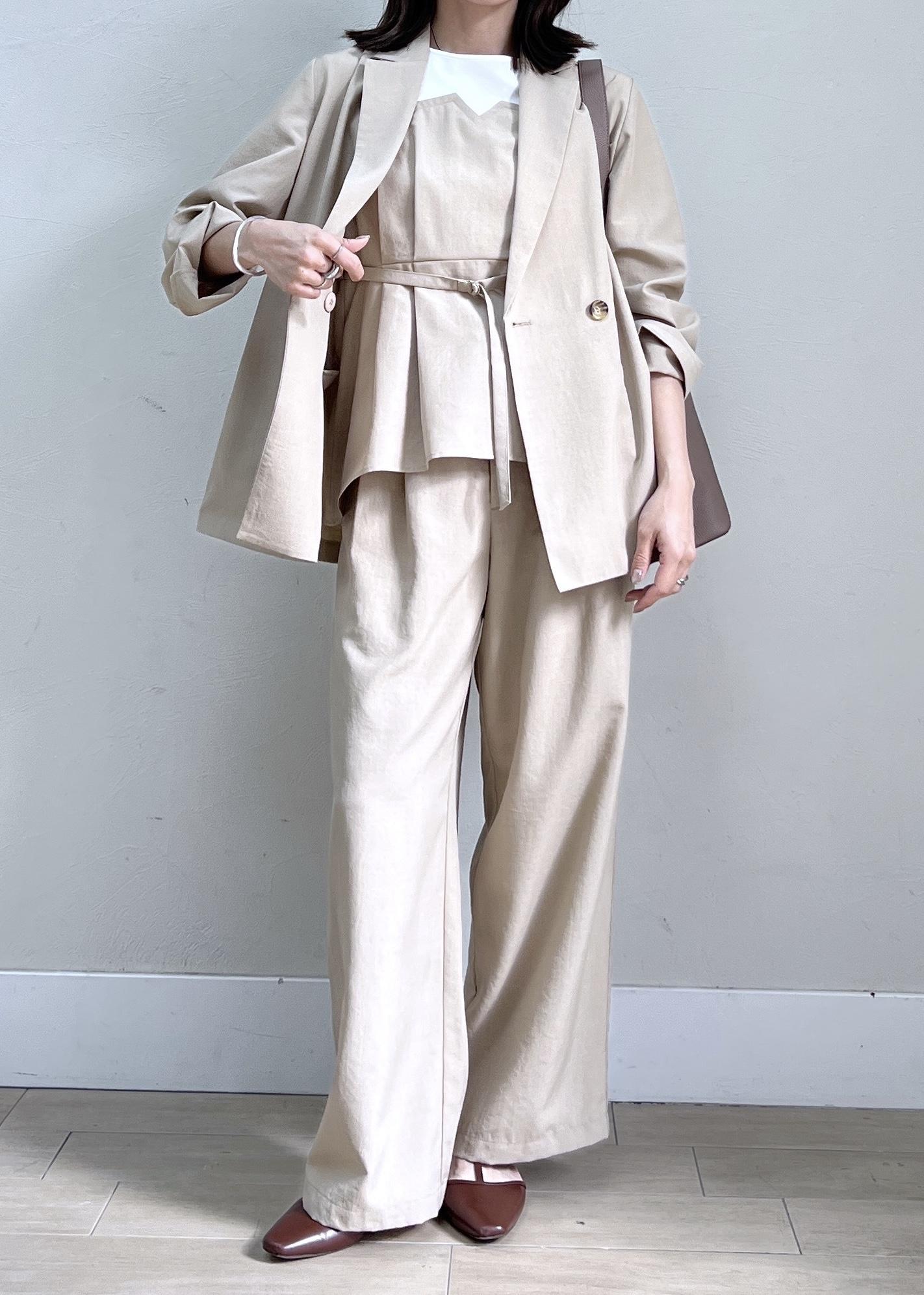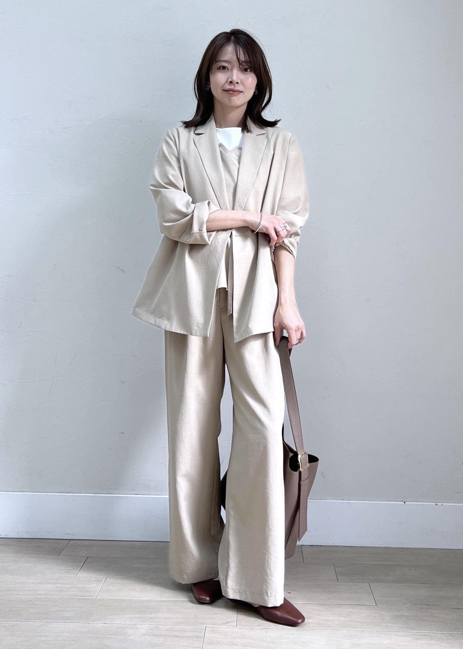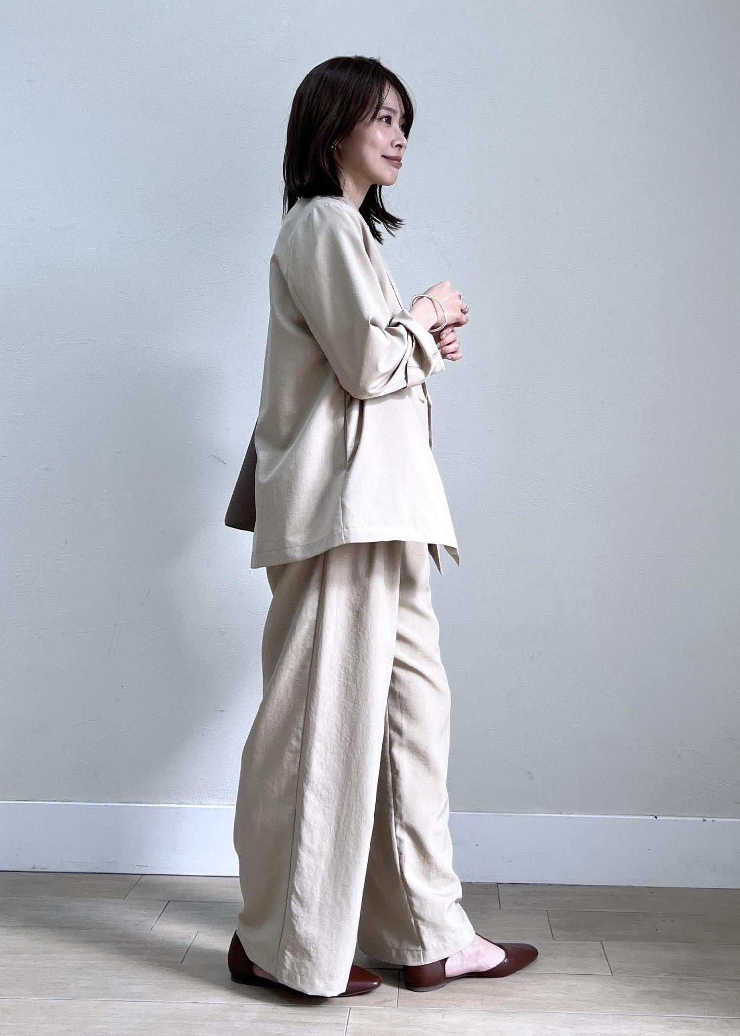 さらっとした肌触りのリネンライクのセットアップは、春夏のきれいめスタイルにおすすめ。
