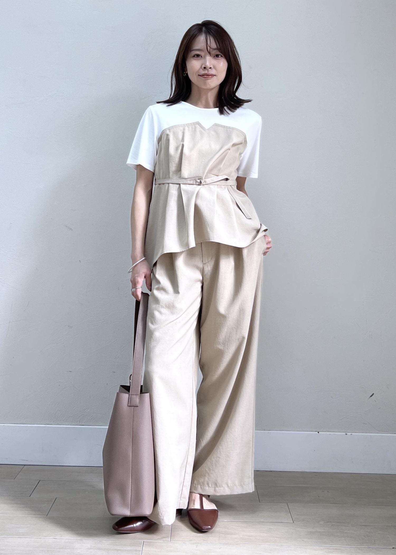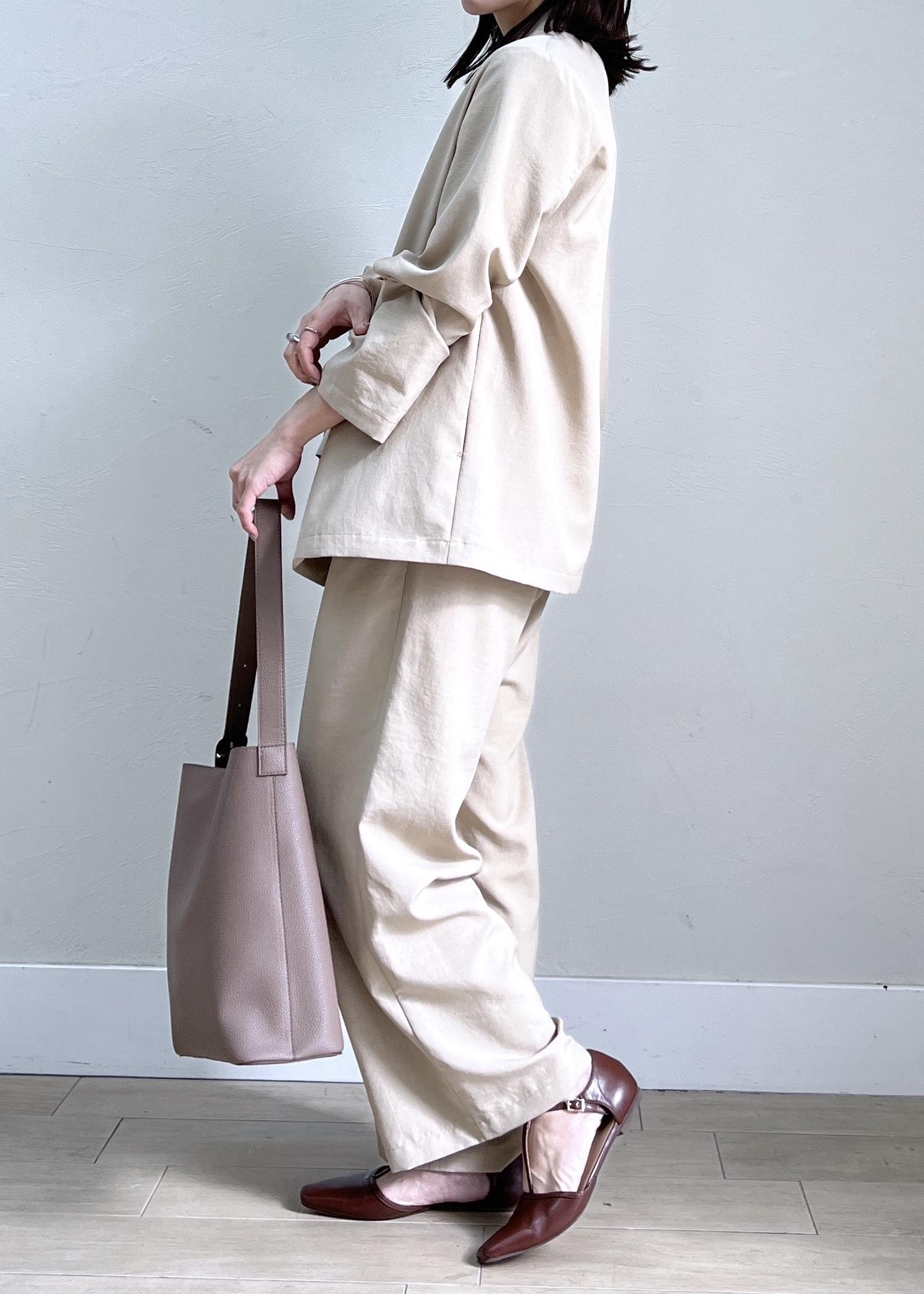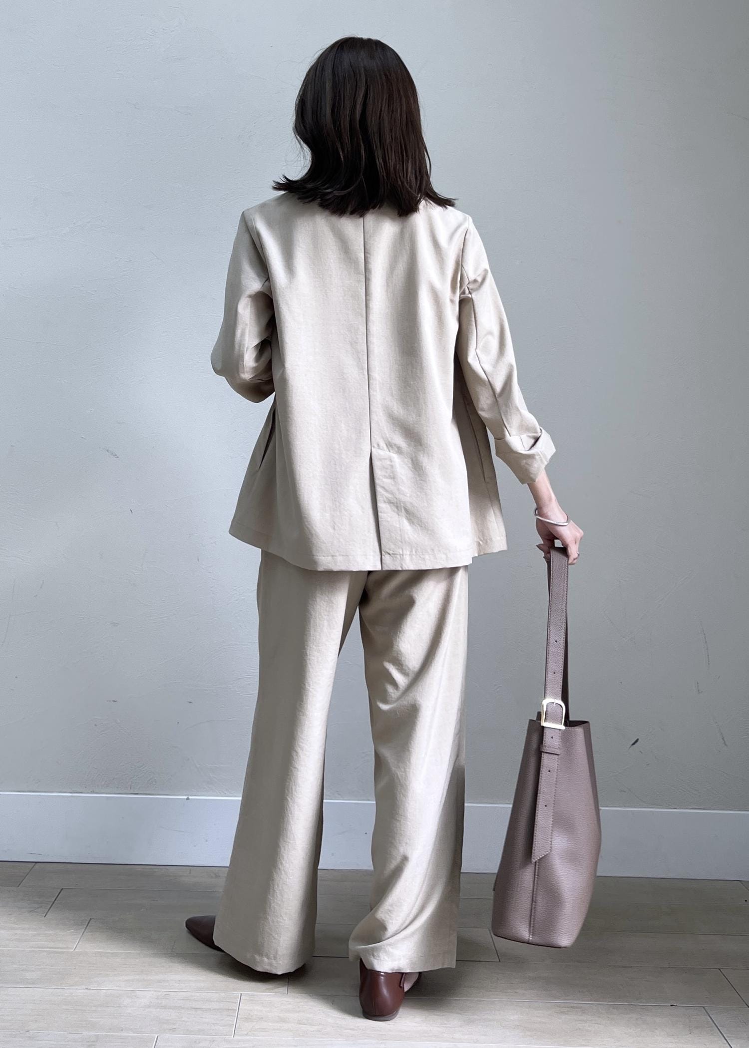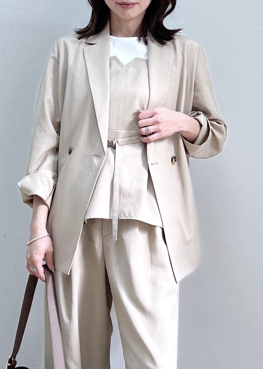 さらっとした肌触りのリネンライクのセットアップは、春夏のきれいめスタイルにおすすめ。