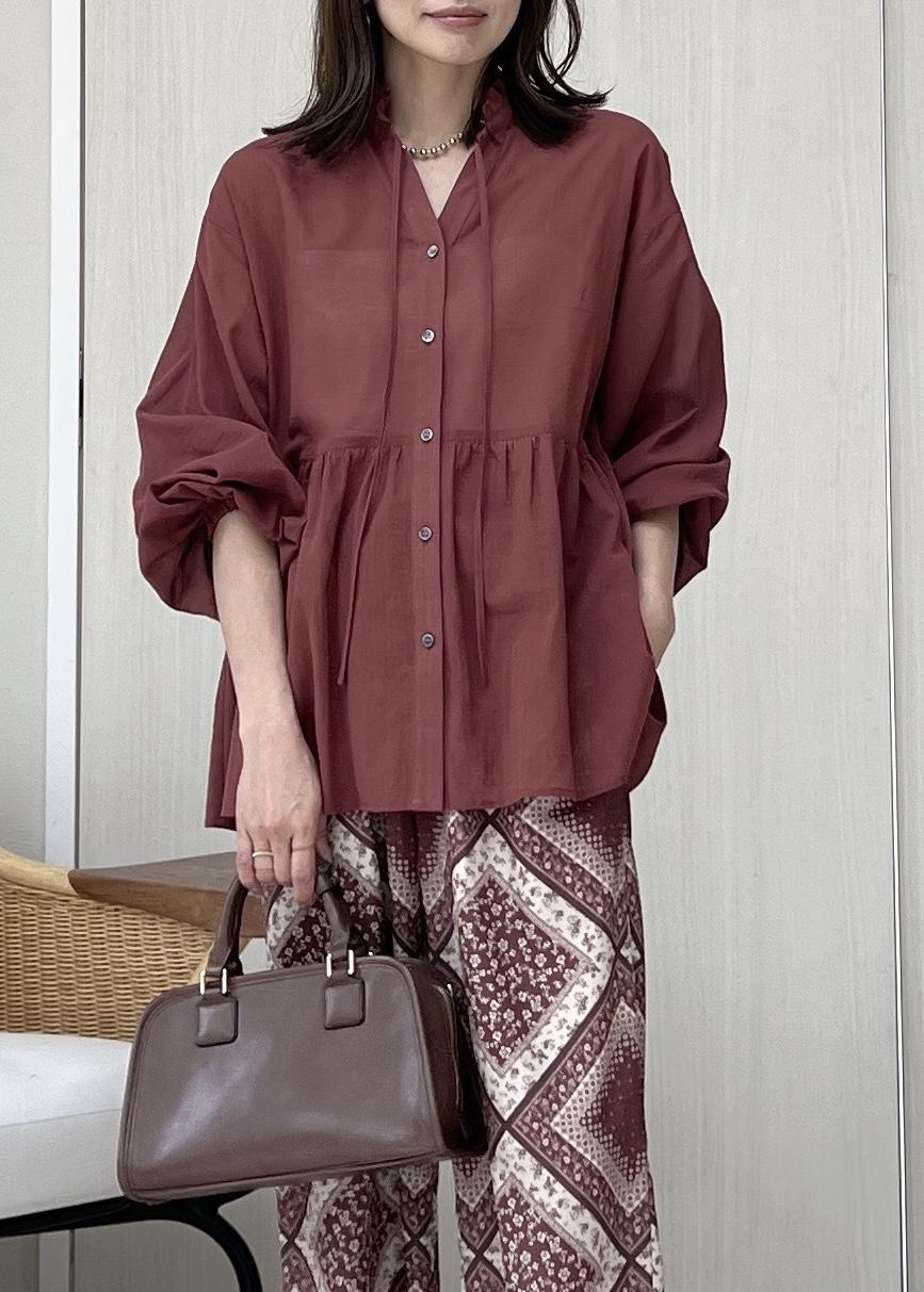 ROPÉ PICNICお着軽シャツシリーズ コットンボイルスタンドフリルシャツ/接触冷感・通気性ダークブラウン / F¥4,994レビュー柔らかく軽い綿素材で、全体的にやや透け感のある生地感。