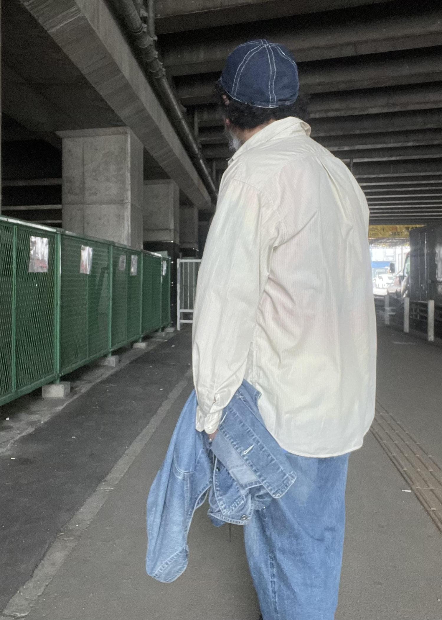 上品な高密度ストライプ生地に、あえてワークウェアで使われる太番手糸の巻縫いを採用。ほどよいパッカリングが生まれ、表情に奥行きをプラスしています。