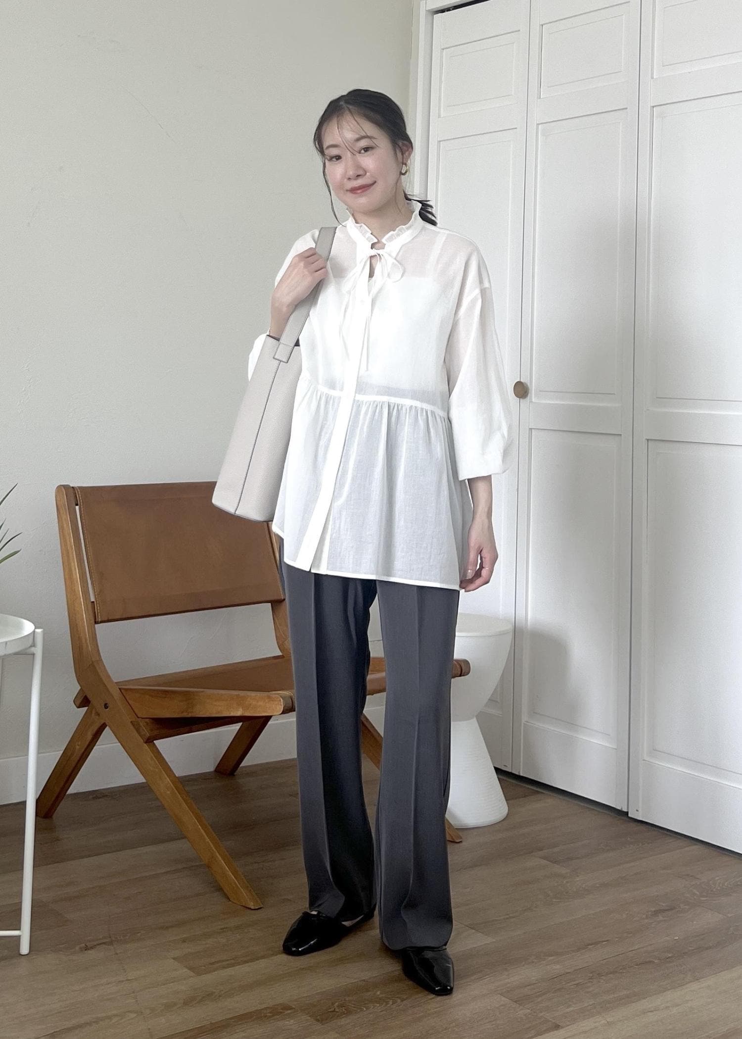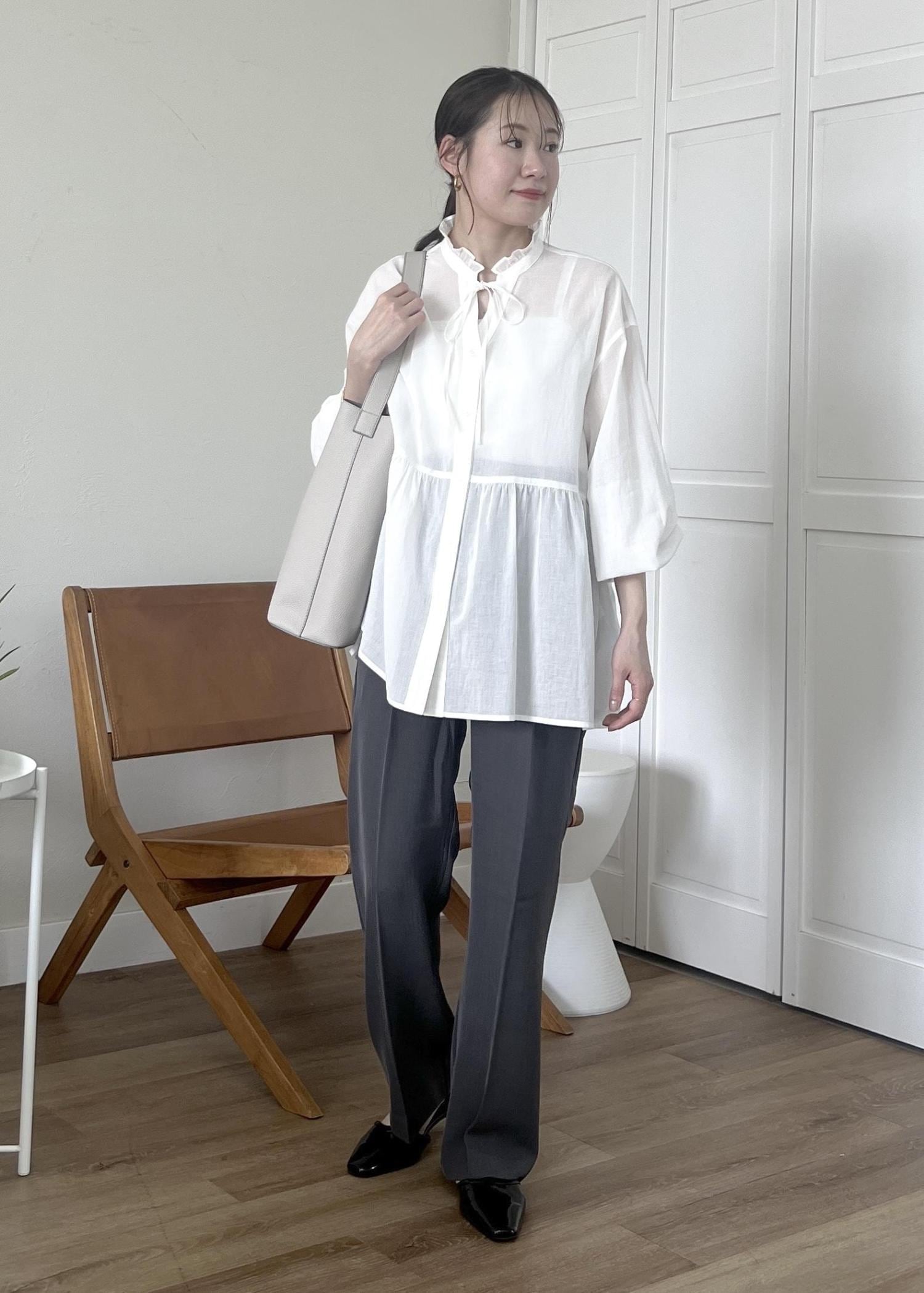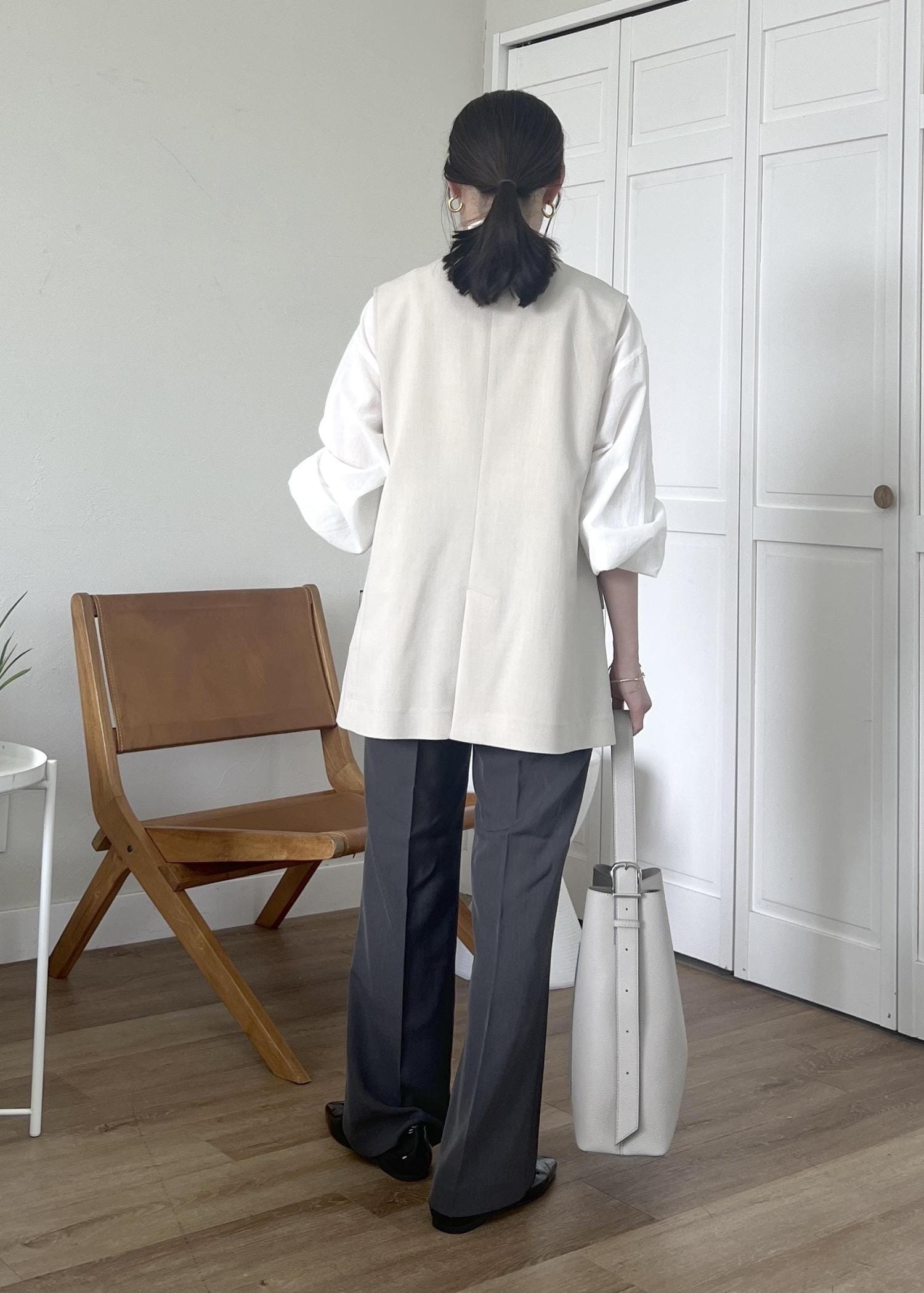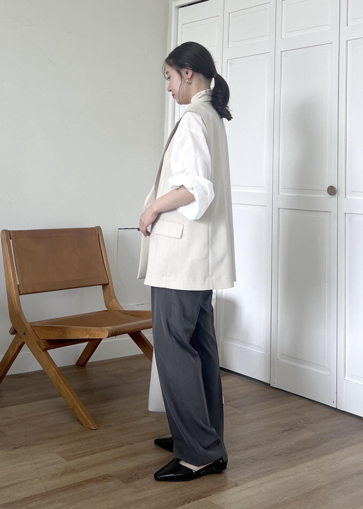ペプラムのコットンシャツにベストを合わせて、トレンド感のあるお仕事コーデに。