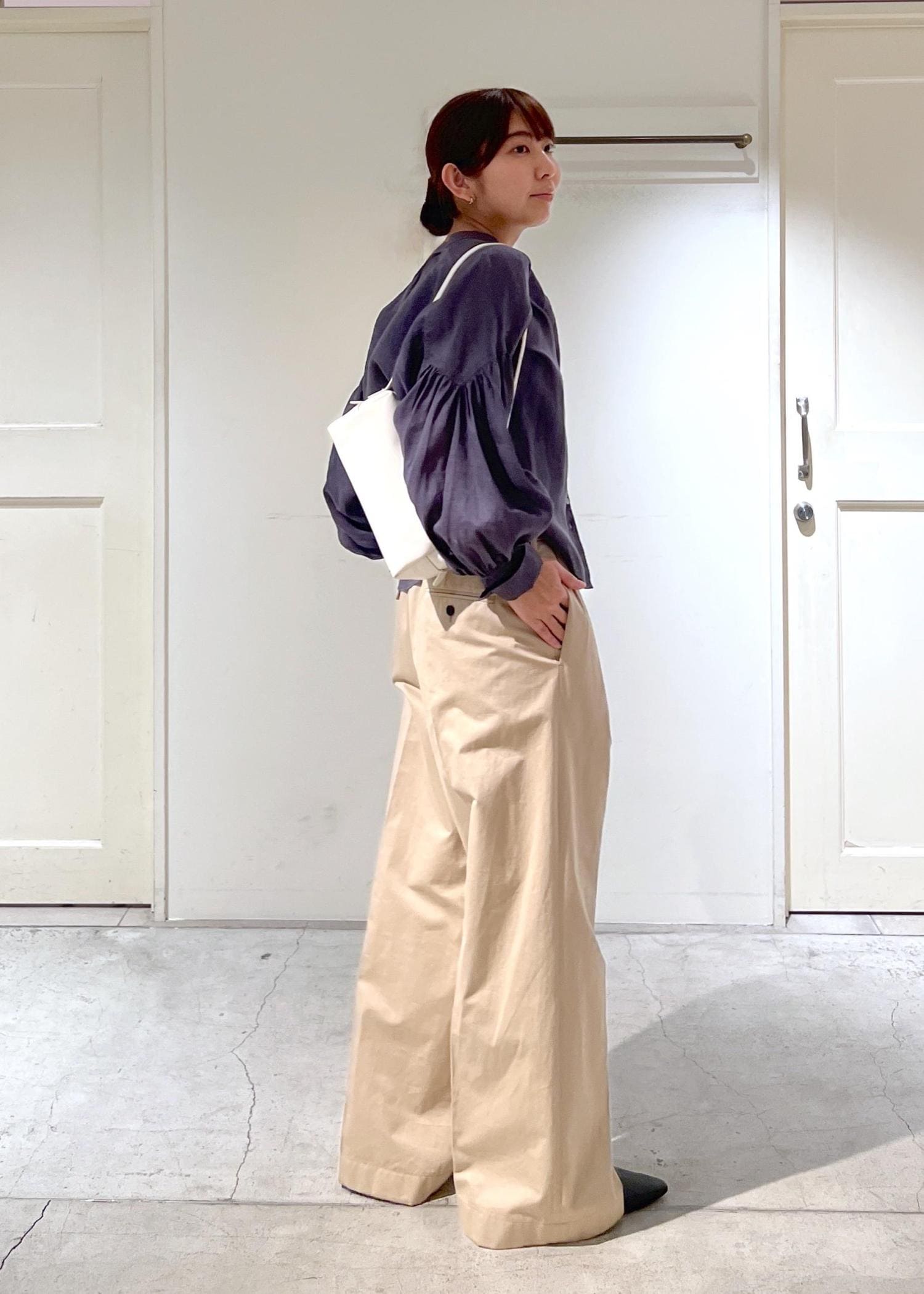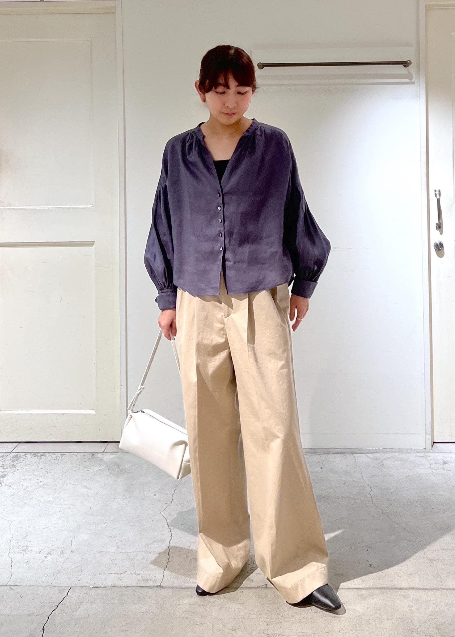 SALON adam et ropéリネンスキッパーギャザーブラウス / GENTLE LINEN 新色追加グレー / F¥22,000レビュー丈はやや短めでパンツのウエストにかかるほど。