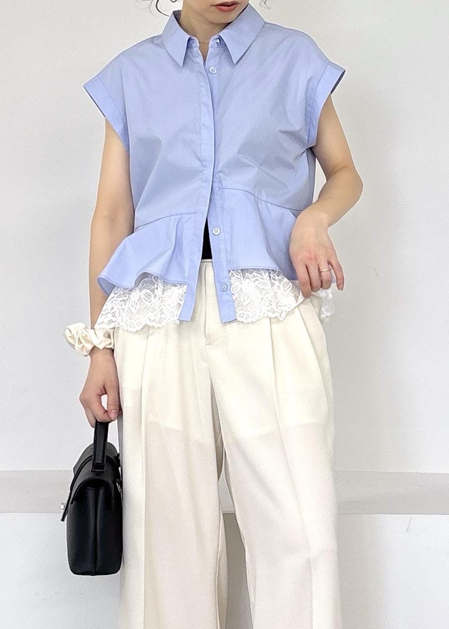 NEW! 予約VISレイヤードレースヘムシャツサックス / F¥5,929レビューレースヘムが今年らしい大人可愛いシャツ♪ドッキング仕様、レースがアクセントでトレンド感◎さらっとした着心地で締め付け感を感じない、けれど切り替えでスタイルup見えするデザインが夏着映えします。全体的に程よくゆとりがあり、着丈は腰くらいの長さでした。