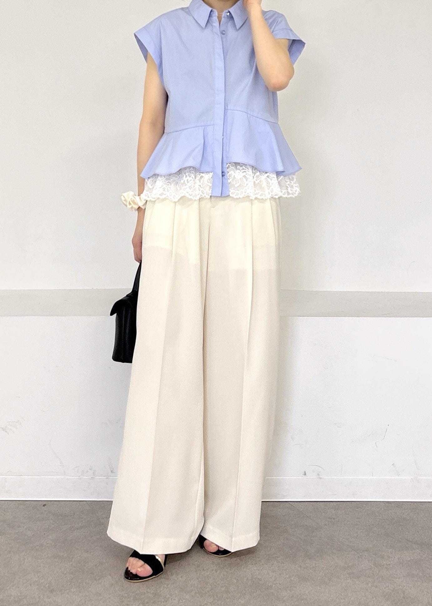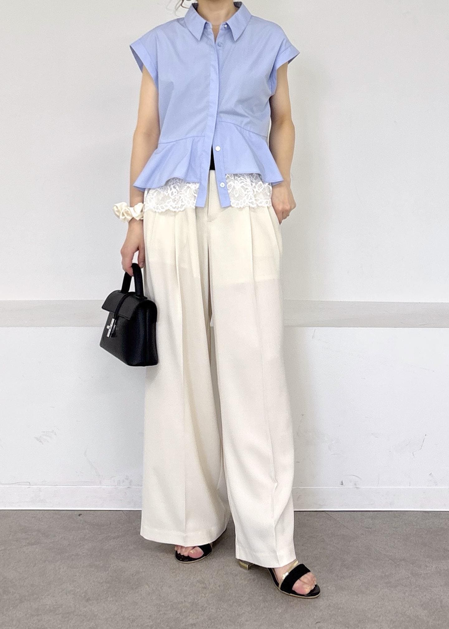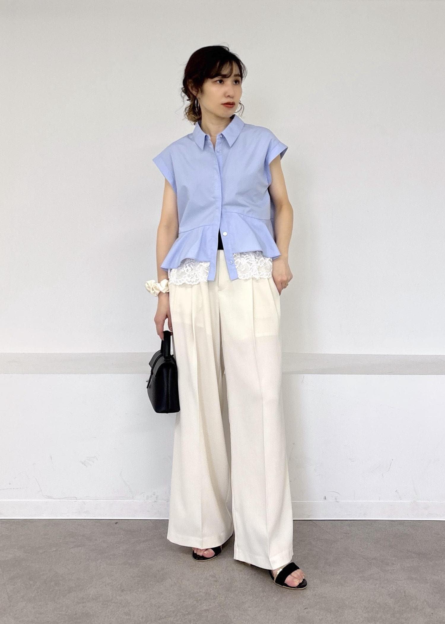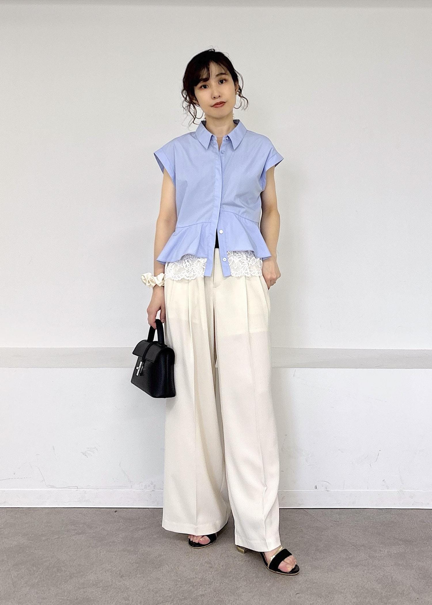 今年らしいレースヘムシャツをポイントに、ワイドパンツにヒールサンダルでスッキリ合わせたきれいめカジュアル♪サックスとホワイトの爽やかな色合わせが暑さを感じる日々を涼しく感じられる、好印象スタイルです。夏オススメのオフィスカジュアルコーデ。
