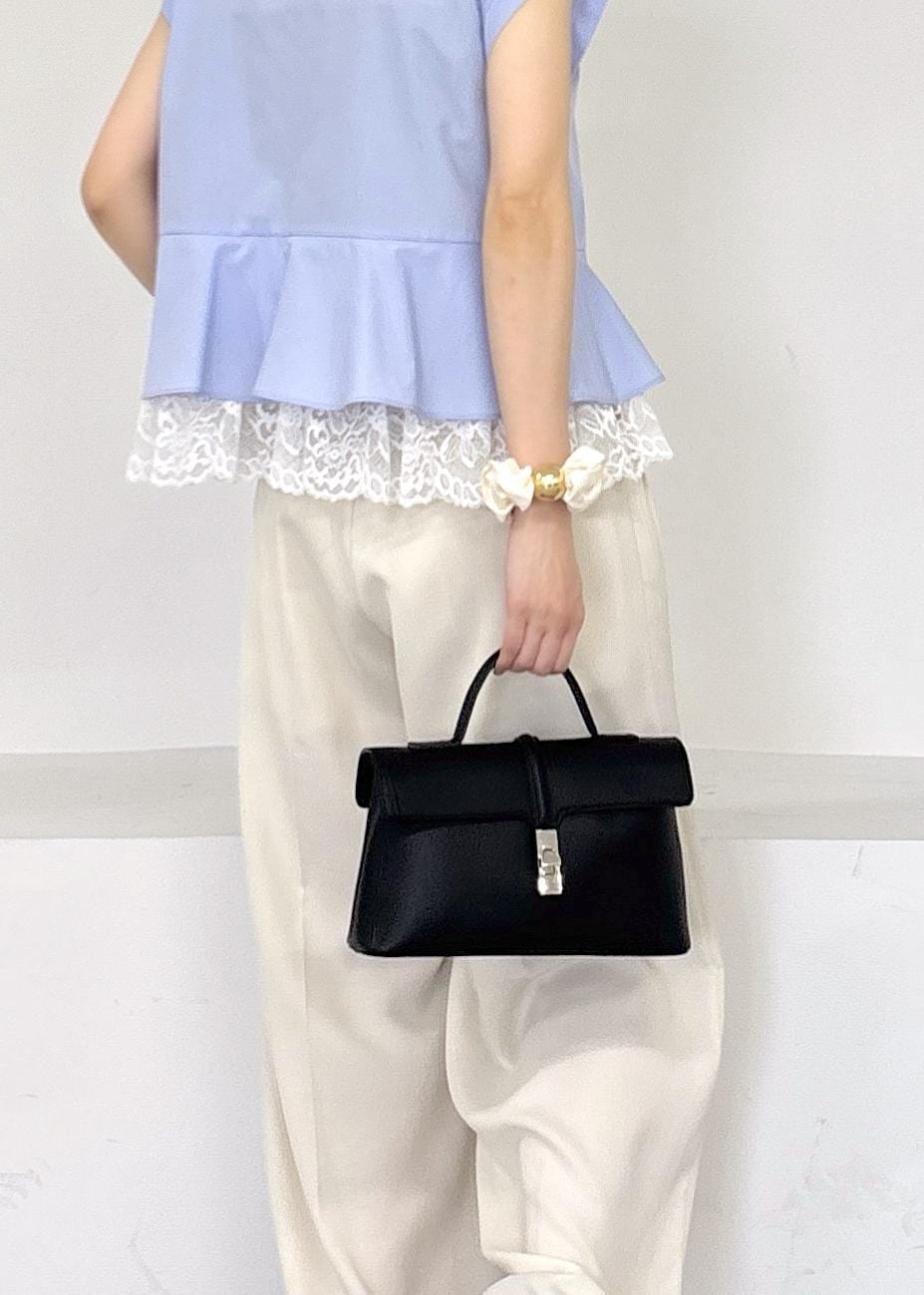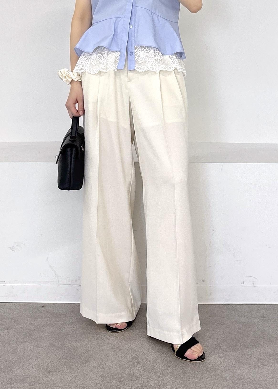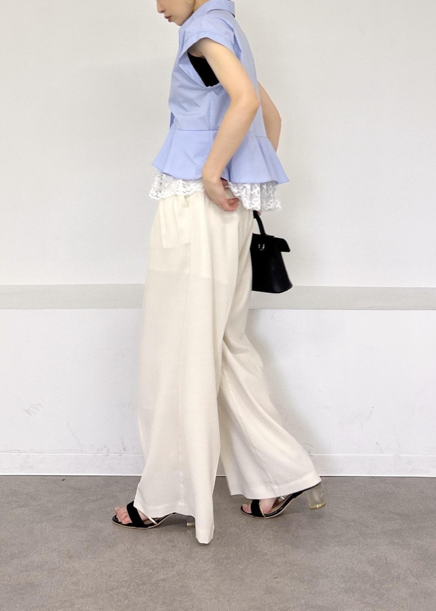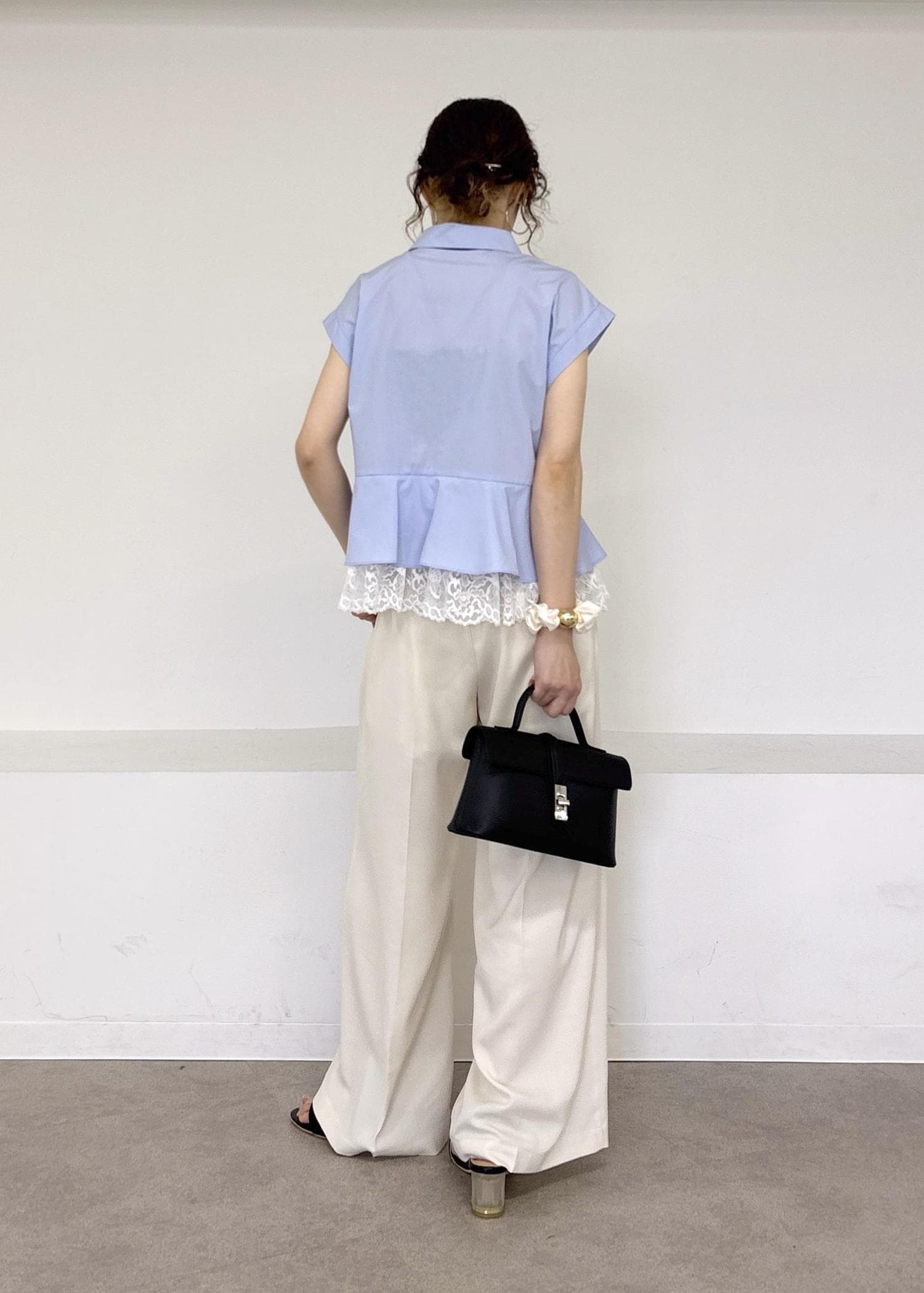 今年らしいレースヘムシャツをポイントに、ワイドパンツにヒールサンダルでスッキリ合わせたきれいめカジュアル♪サックスとホワイトの爽やかな色合わせが暑さを感じる日々を涼しく感じられる、好印象スタイルです。夏オススメのオフィスカジュアルコーデ。