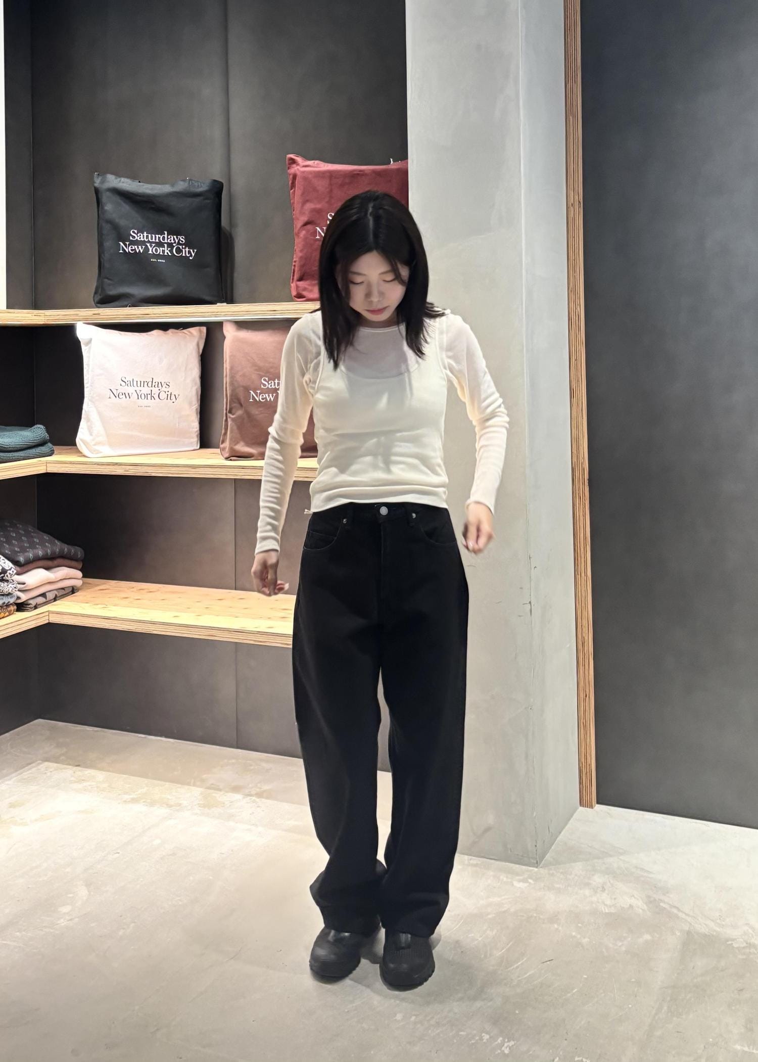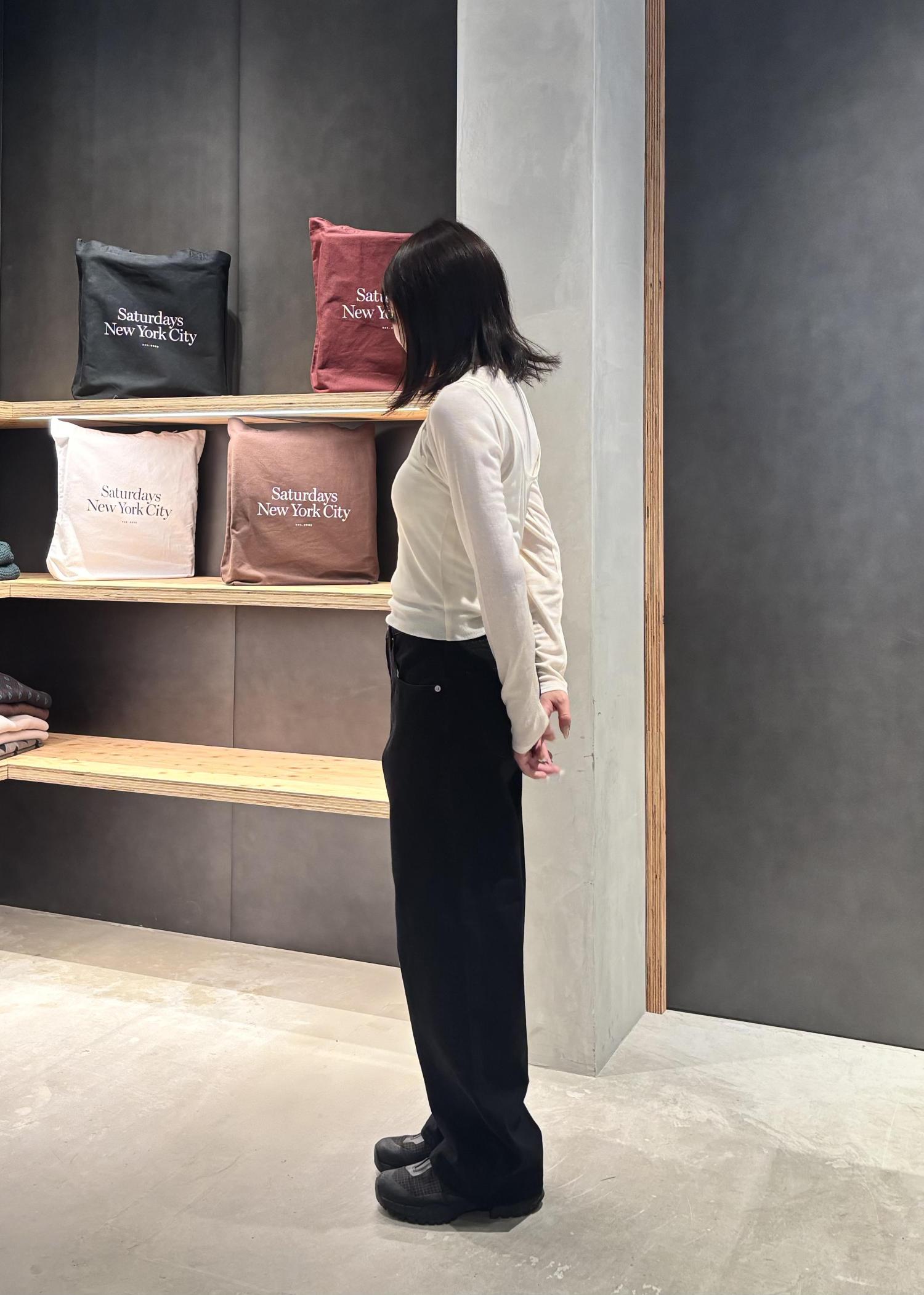 ワイドストレートのリラックスしたサイズ感ではあるものの絶妙な丈感と落ち着いた加工感が大人のシルエットになっています。
