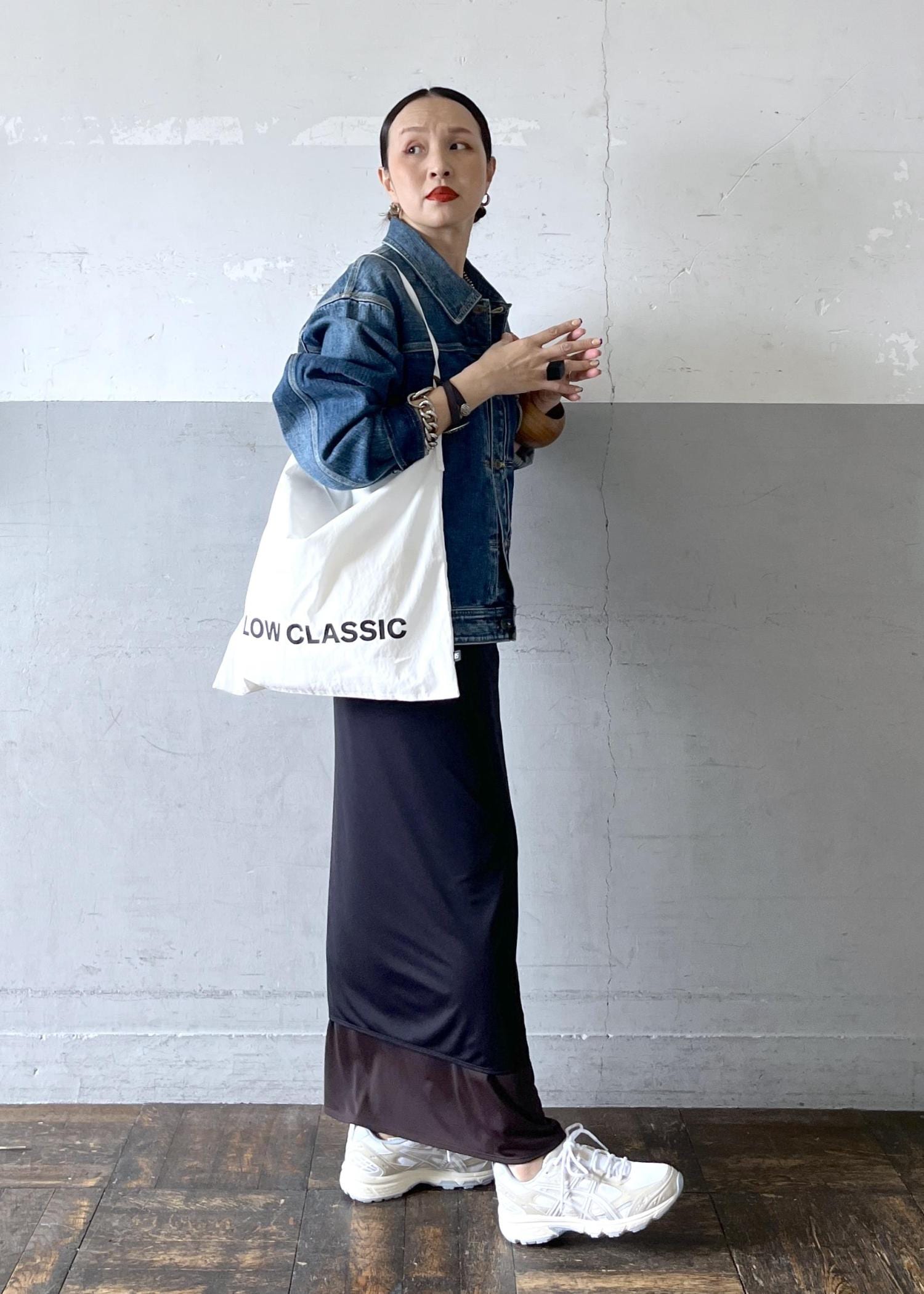 レイヤードデザインのロングスカートを合わせたシンプルスタイル。