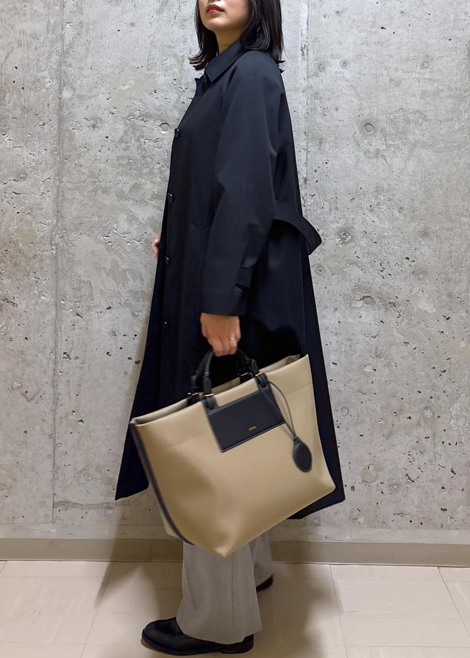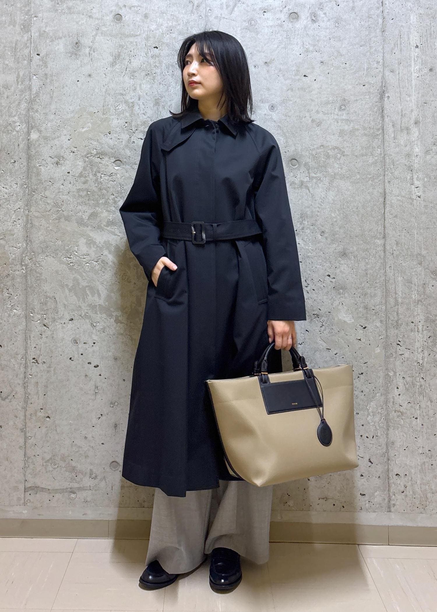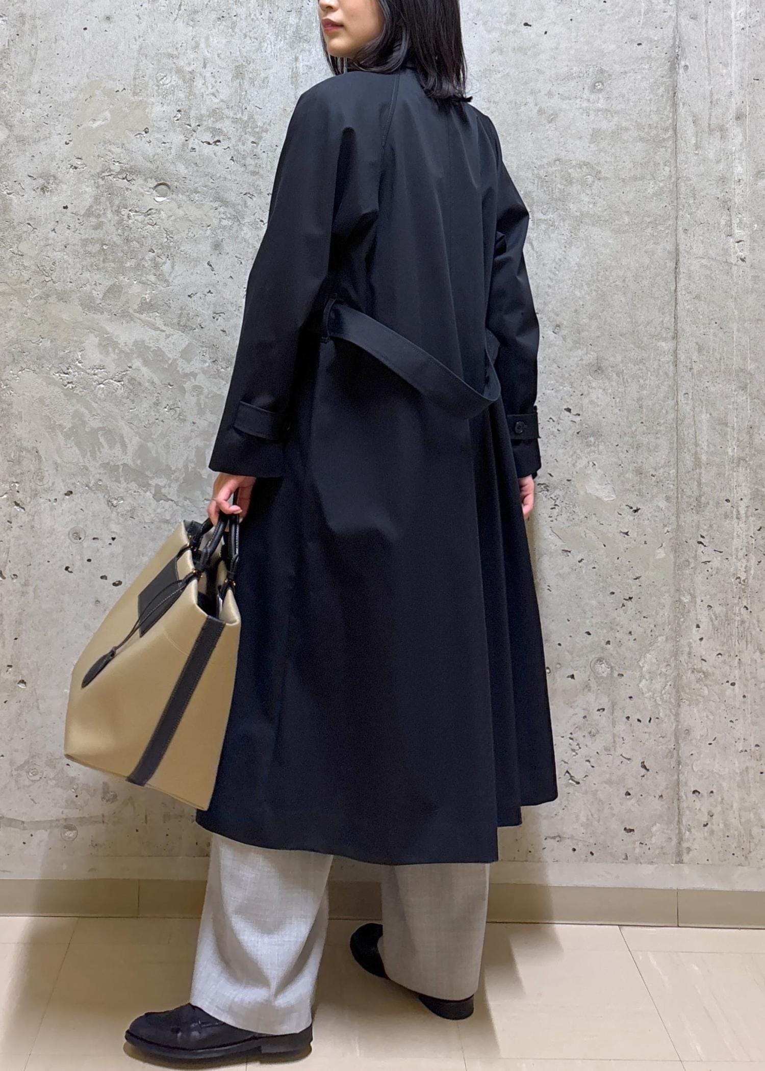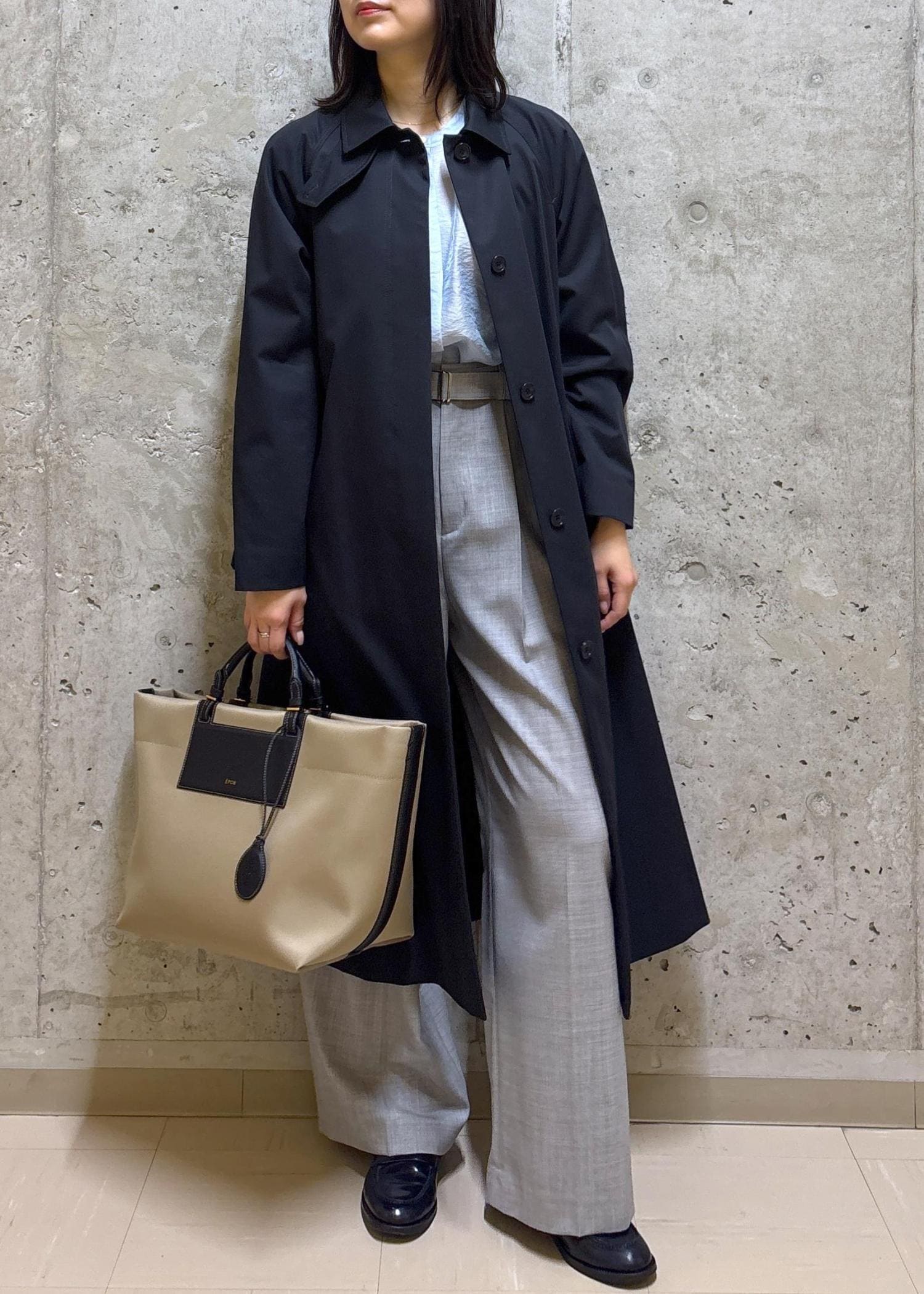 かっちりしすぎないステンカラーコートに、