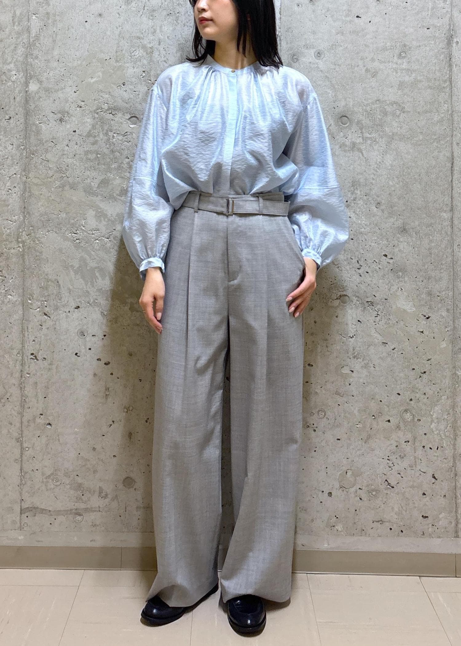 襟や袖口に細かいギャザーが入っていて、全体的にふんわりと空気をはらんだシルエットが抜け感があってお洒落です。