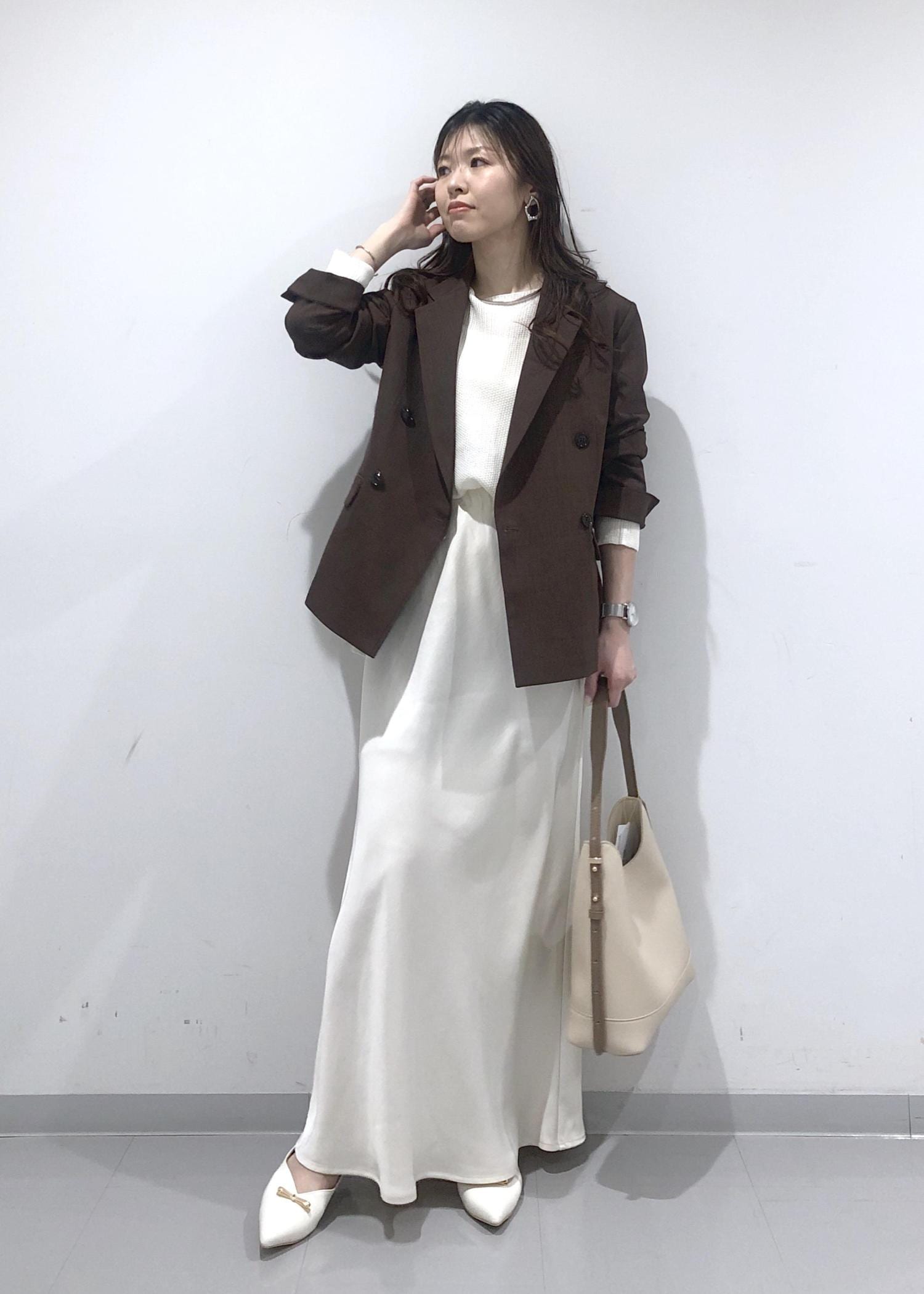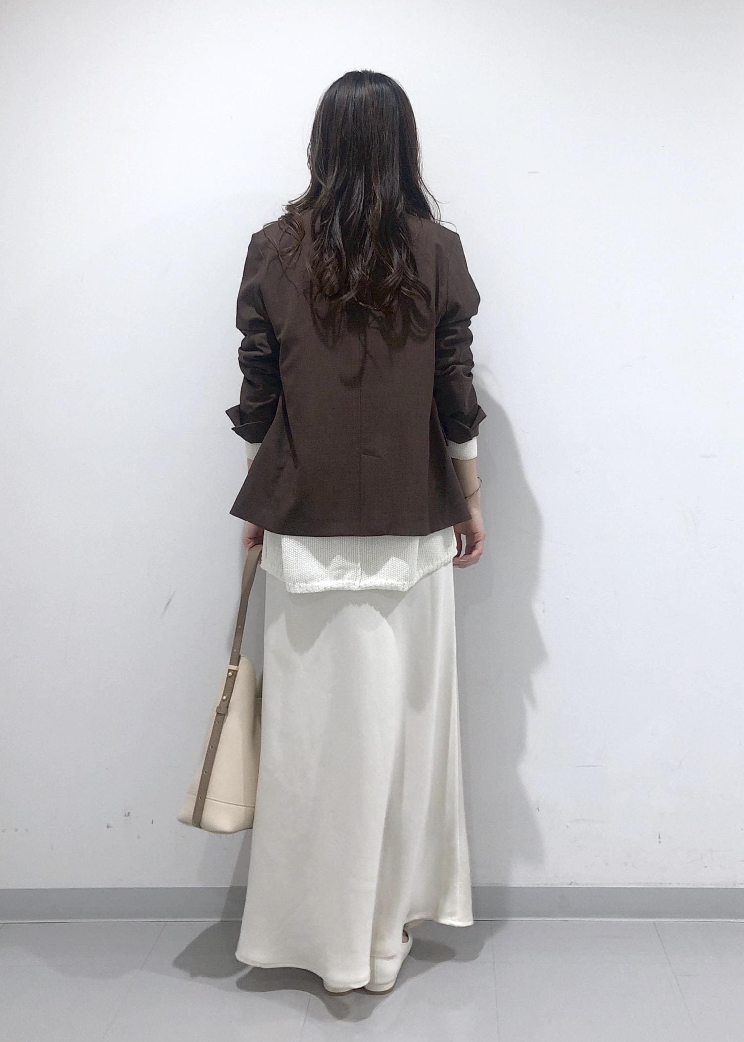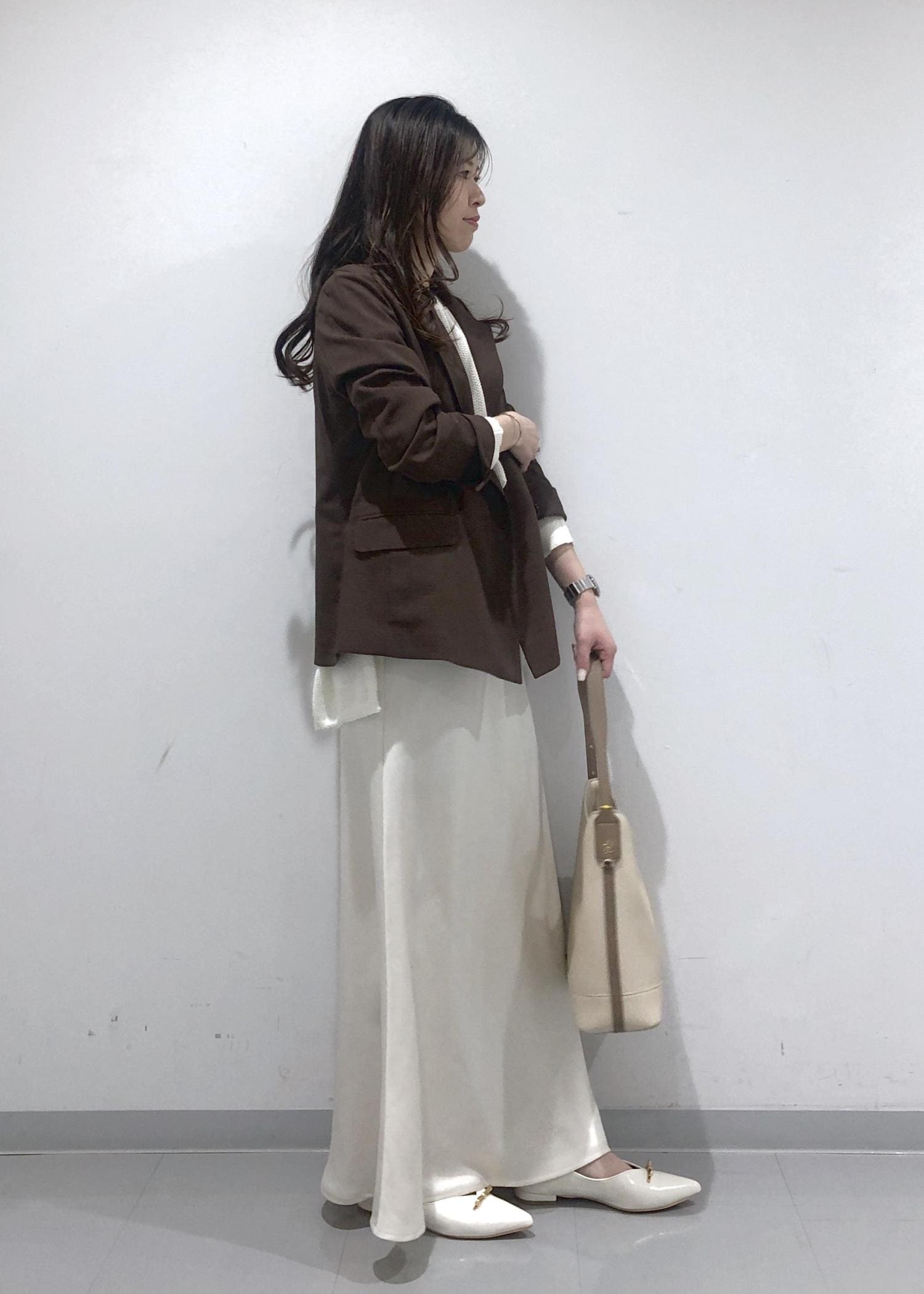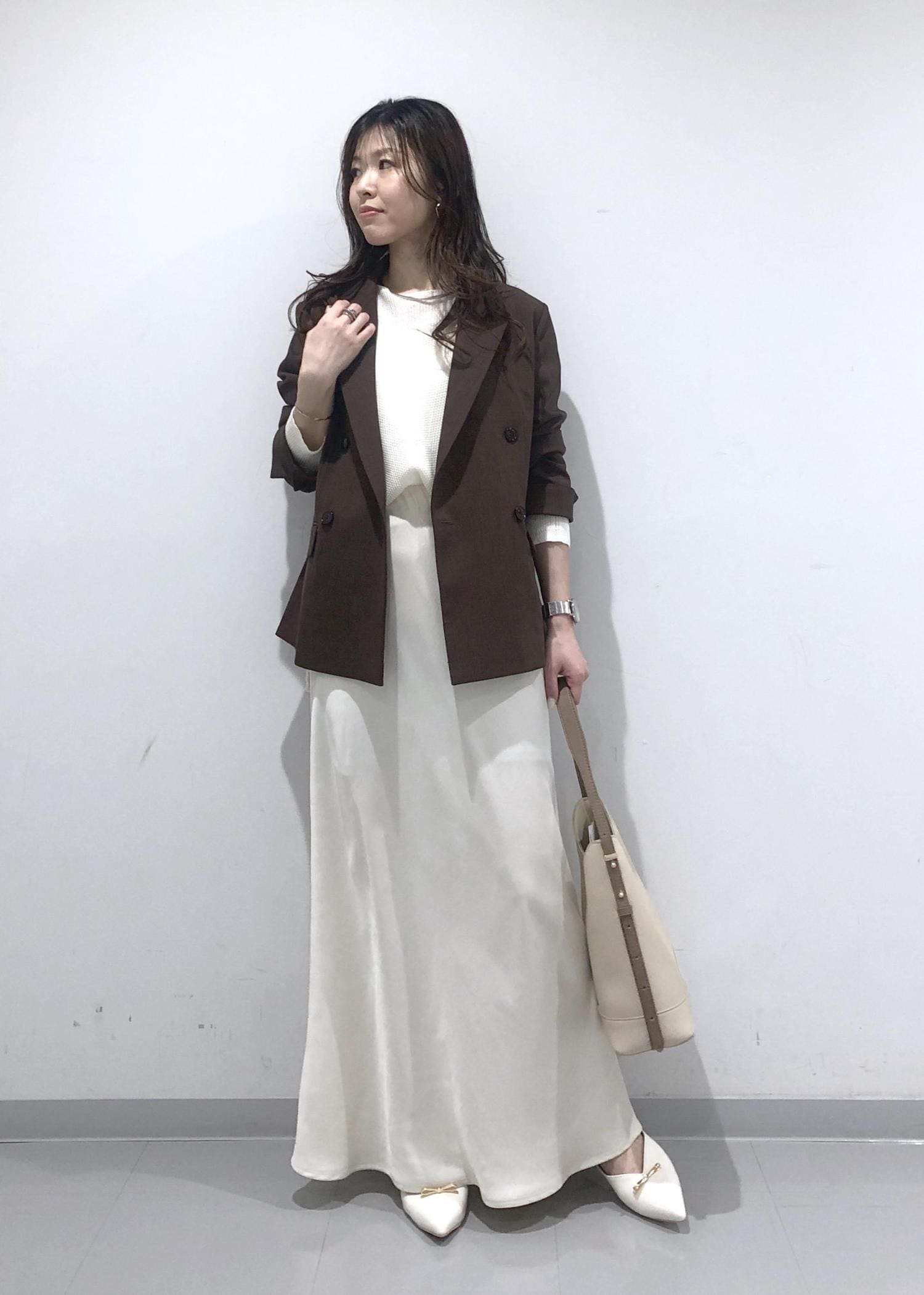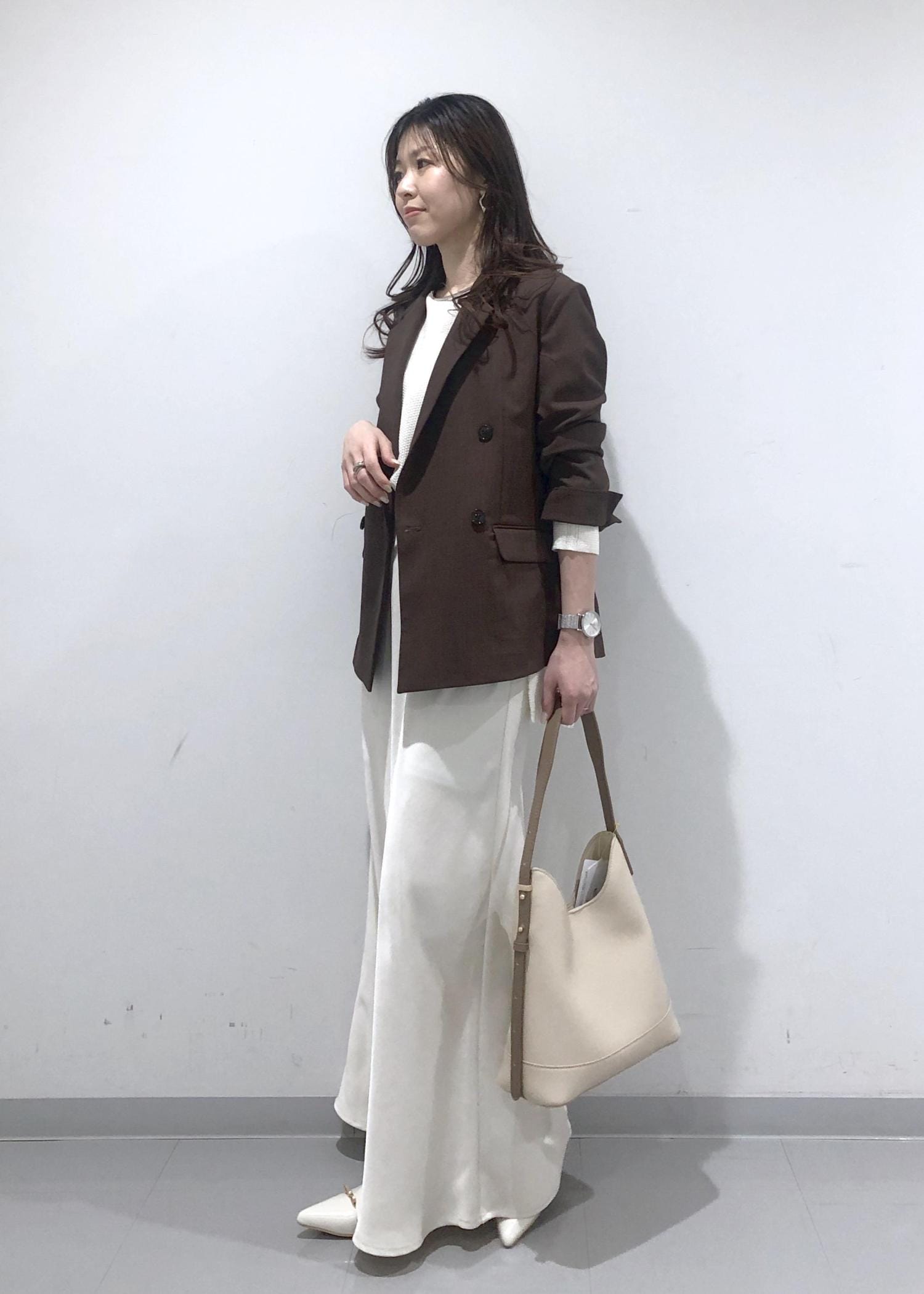 ホワイトのきれいめワントーンコーデに、名古屋限定モデルのブラウンジャケットを羽織り、リラックス感ある中にもきちんと感ときれいめな印象がプラスされます!