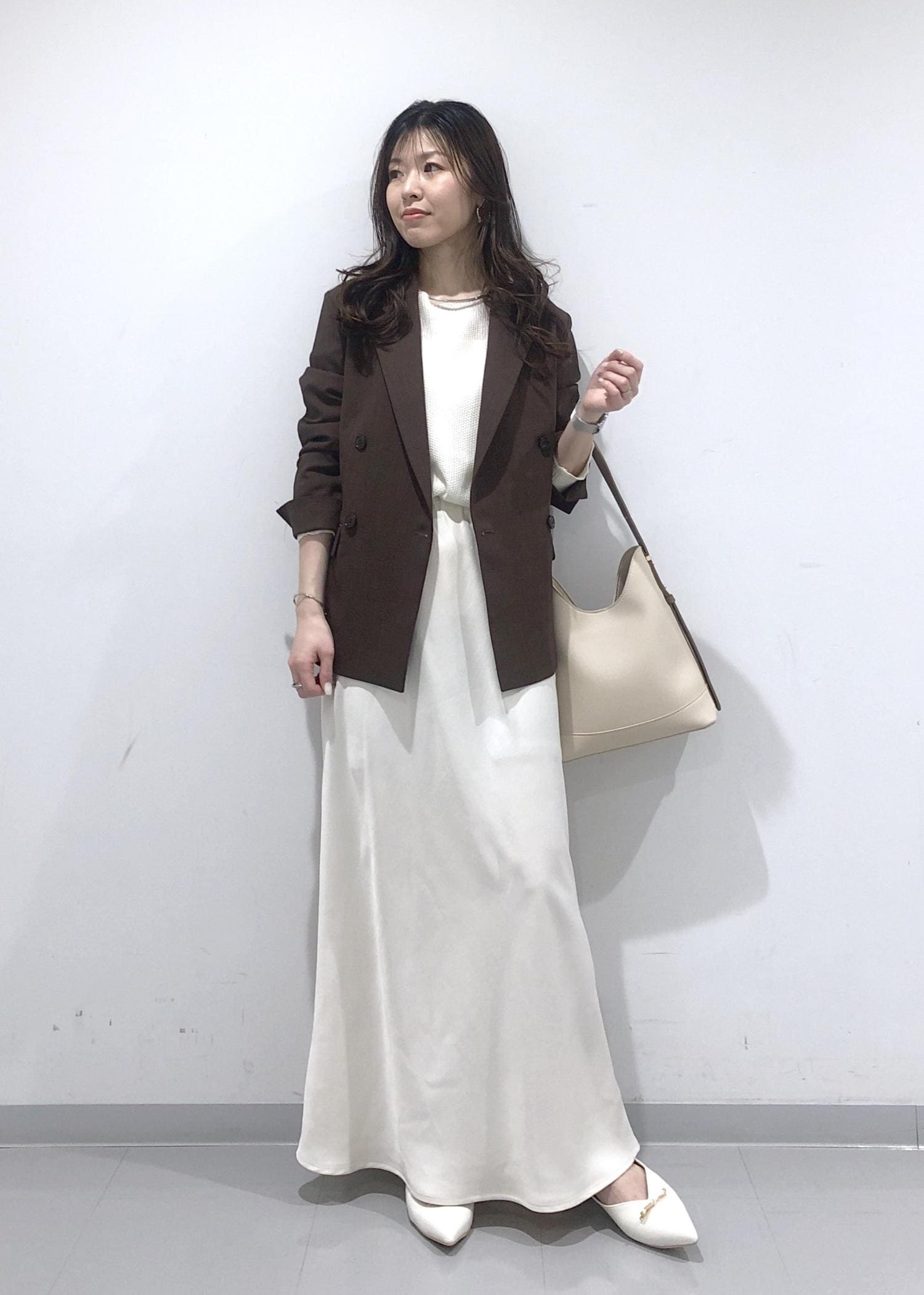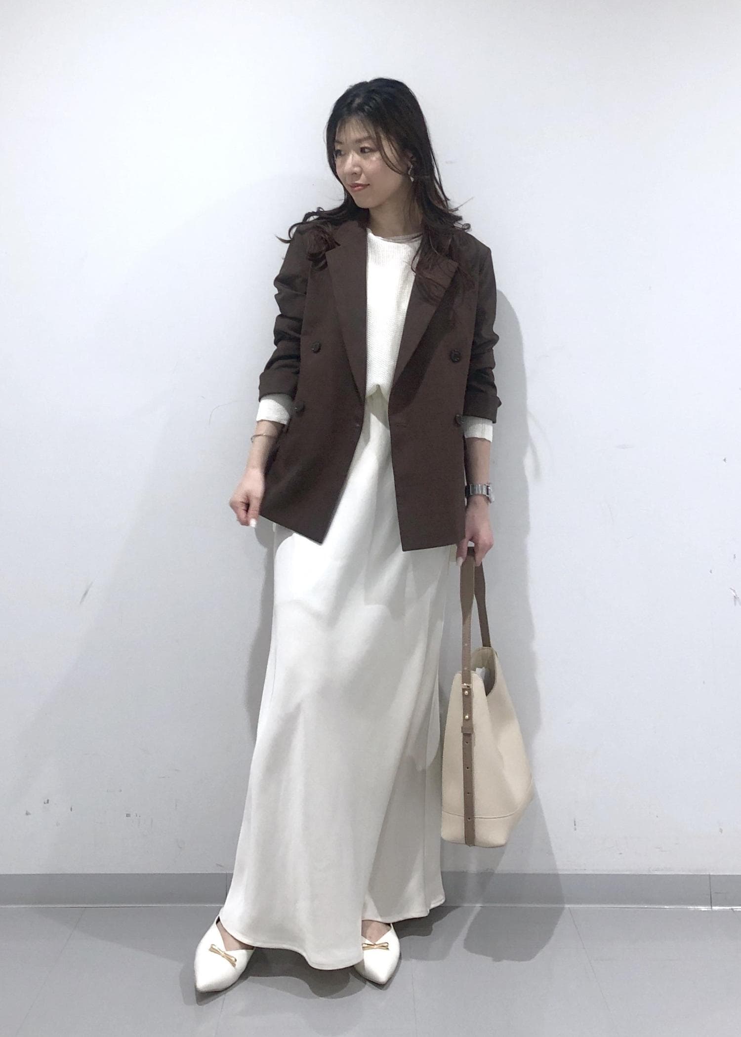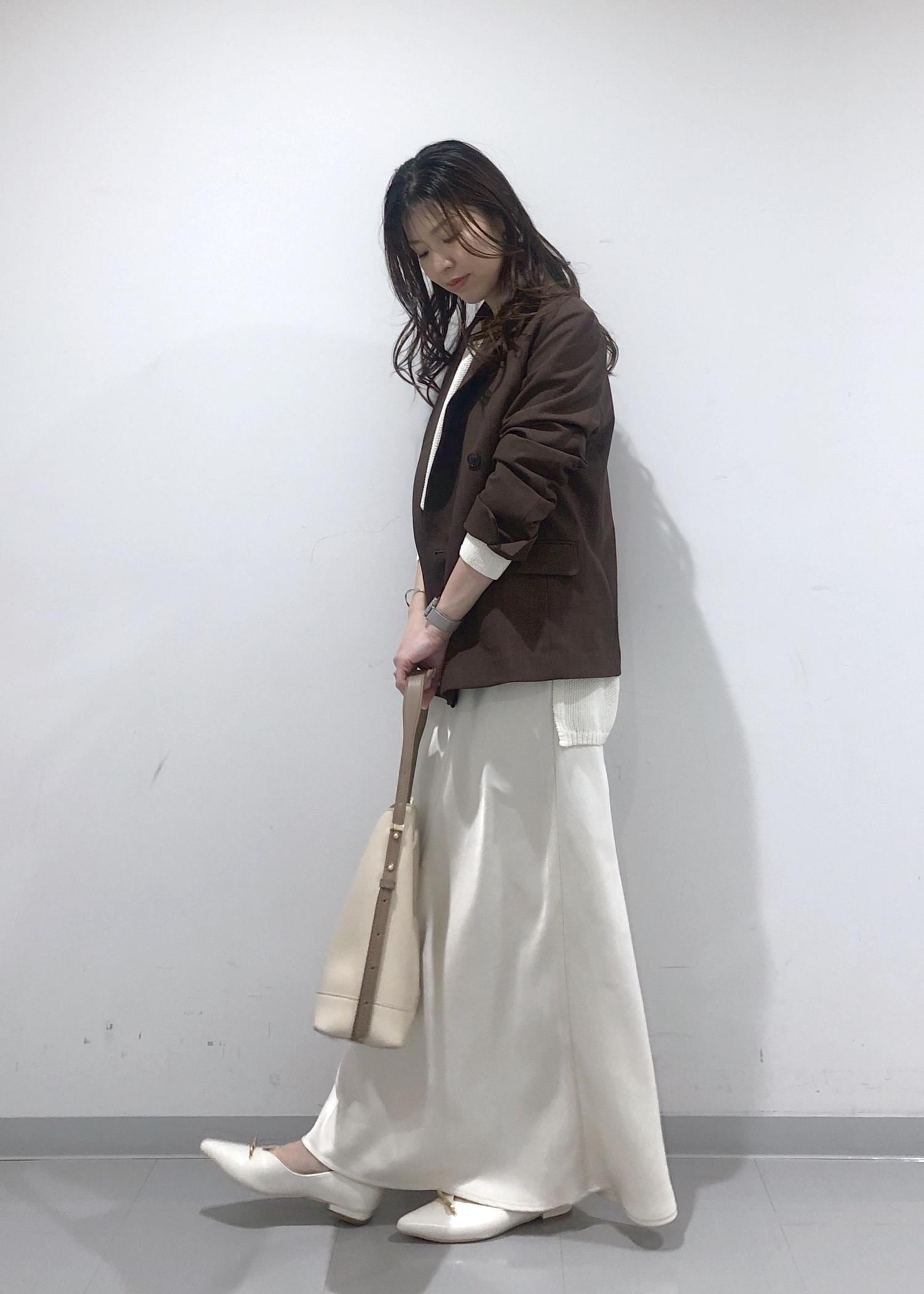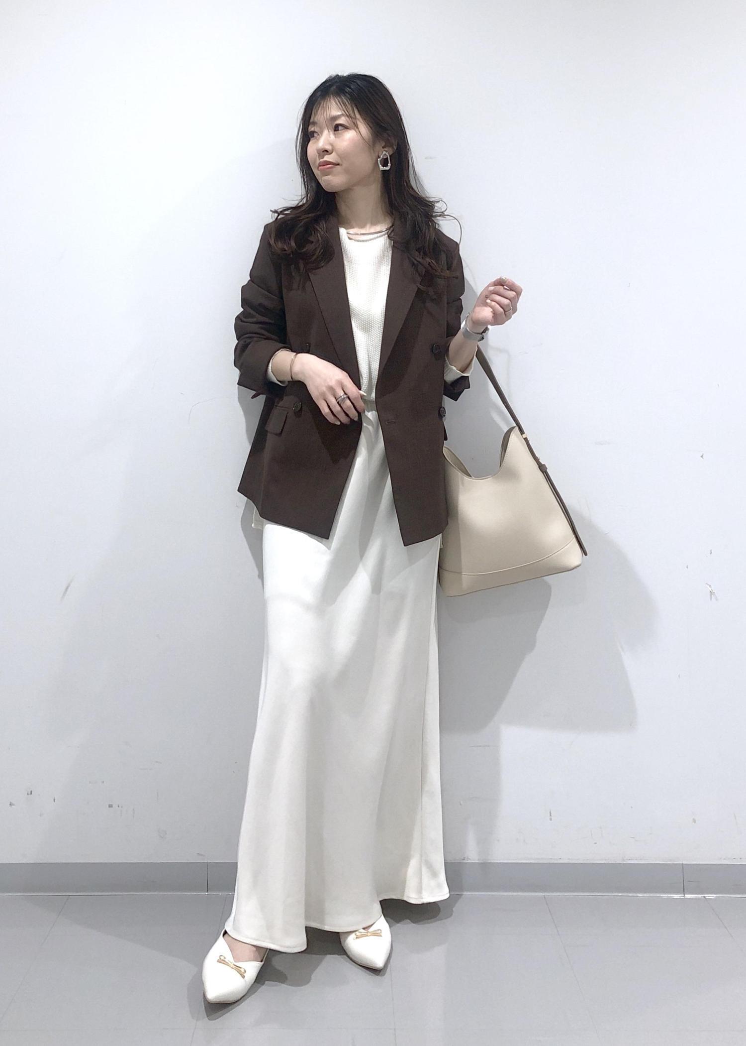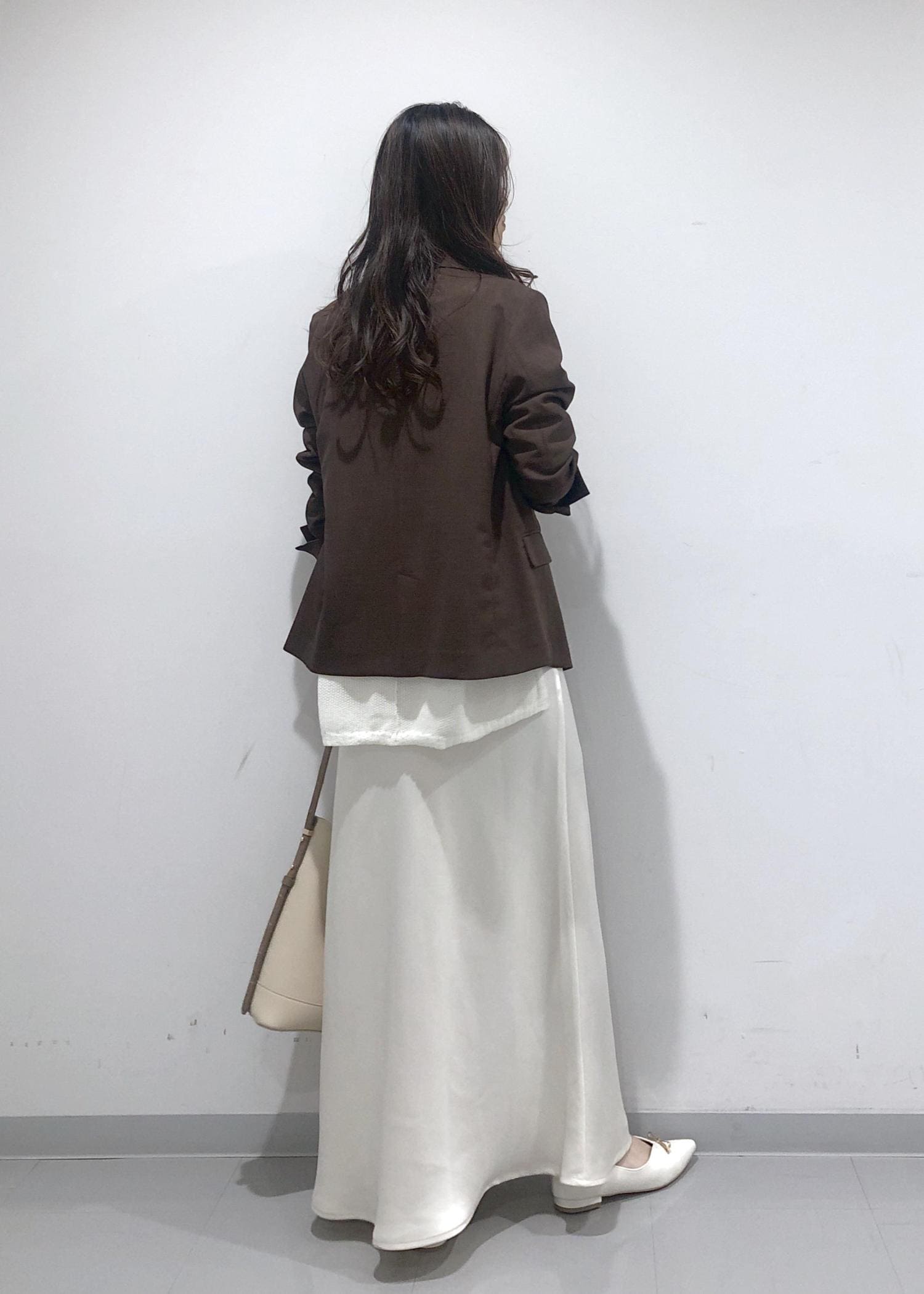 ホワイトのきれいめワントーンコーデに、名古屋限定モデルのブラウンジャケットを羽織り、リラックス感ある中にもきちんと感ときれいめな印象がプラスされます!