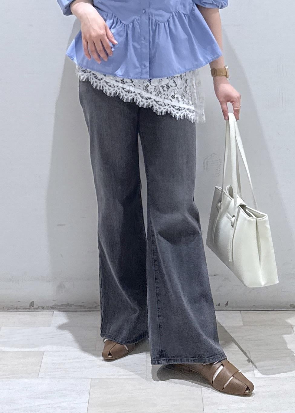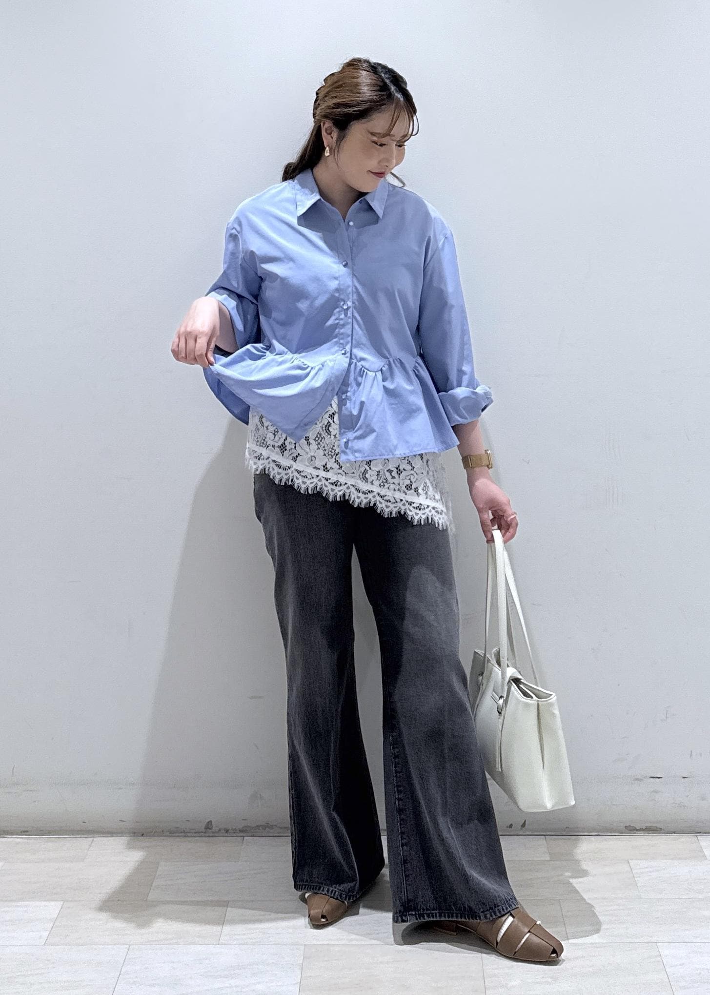 今回は新作で入荷しました、くねくねっとしたウェーブペプラムにフレアデニムパンツを履いてフェミニンカジュアルなスタイルにしてみました♪
