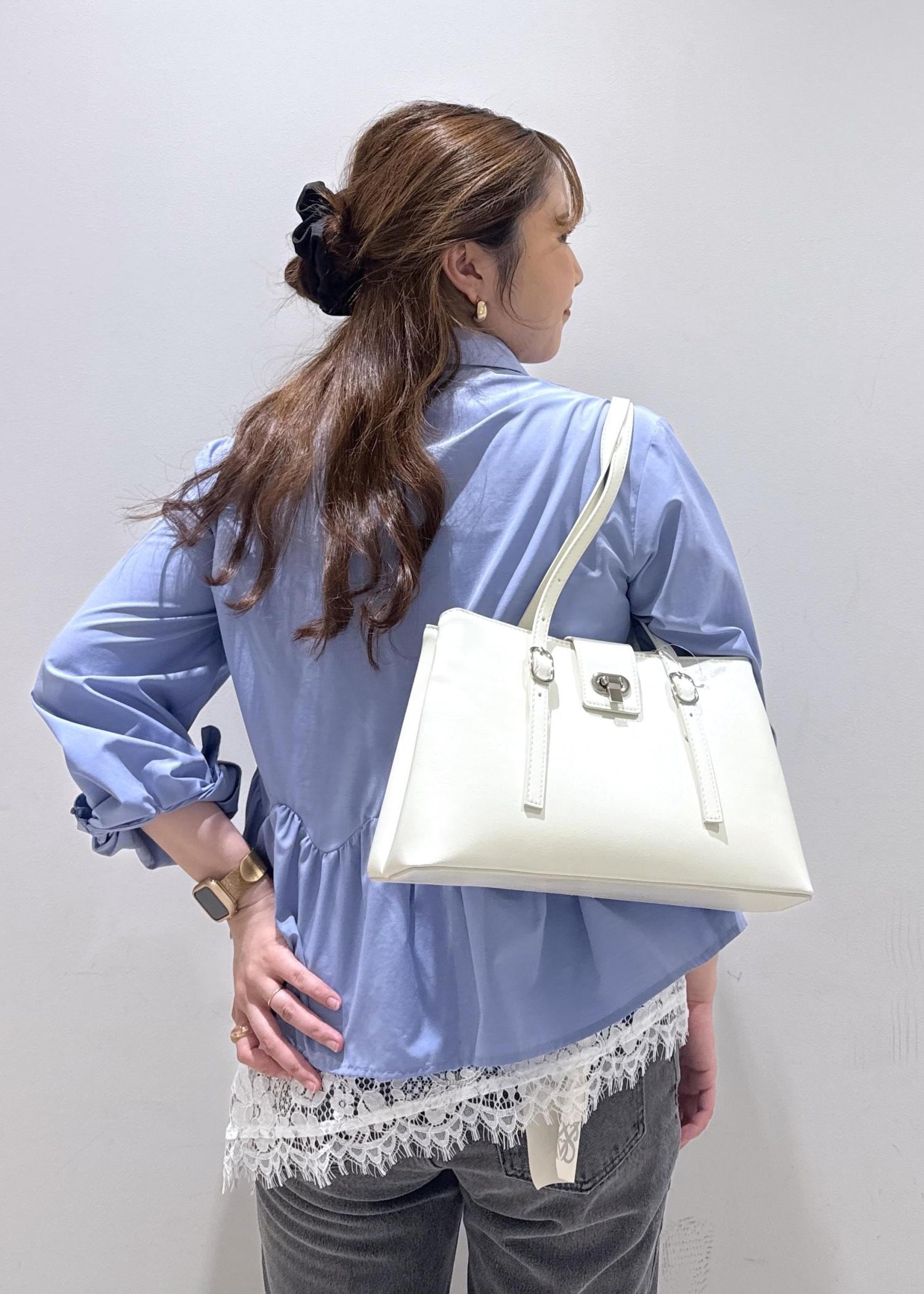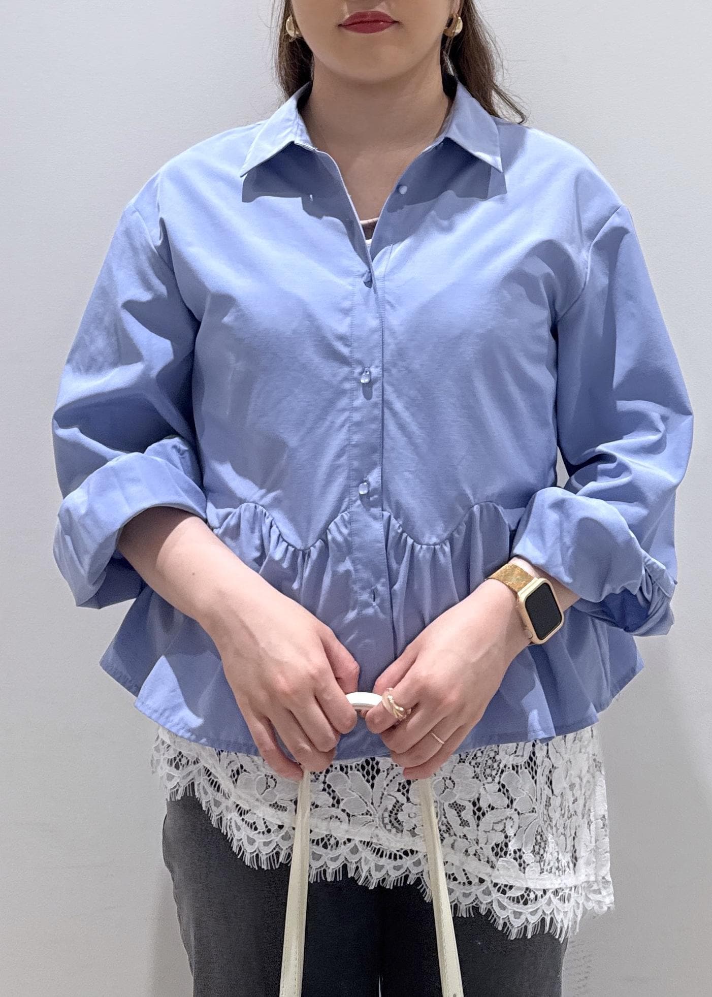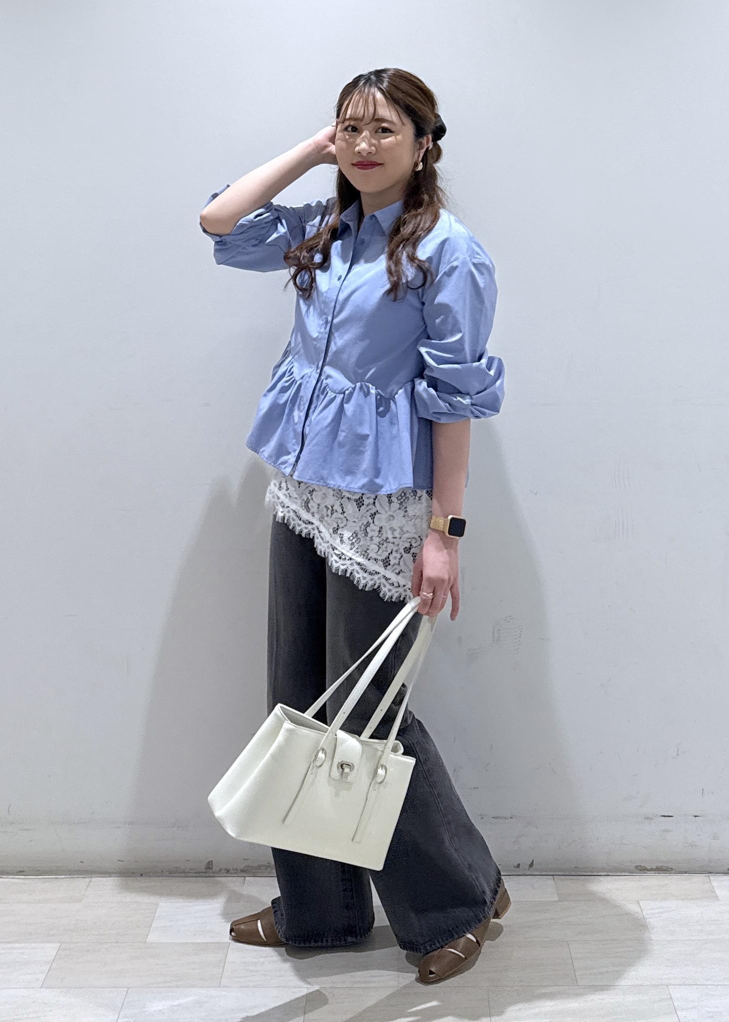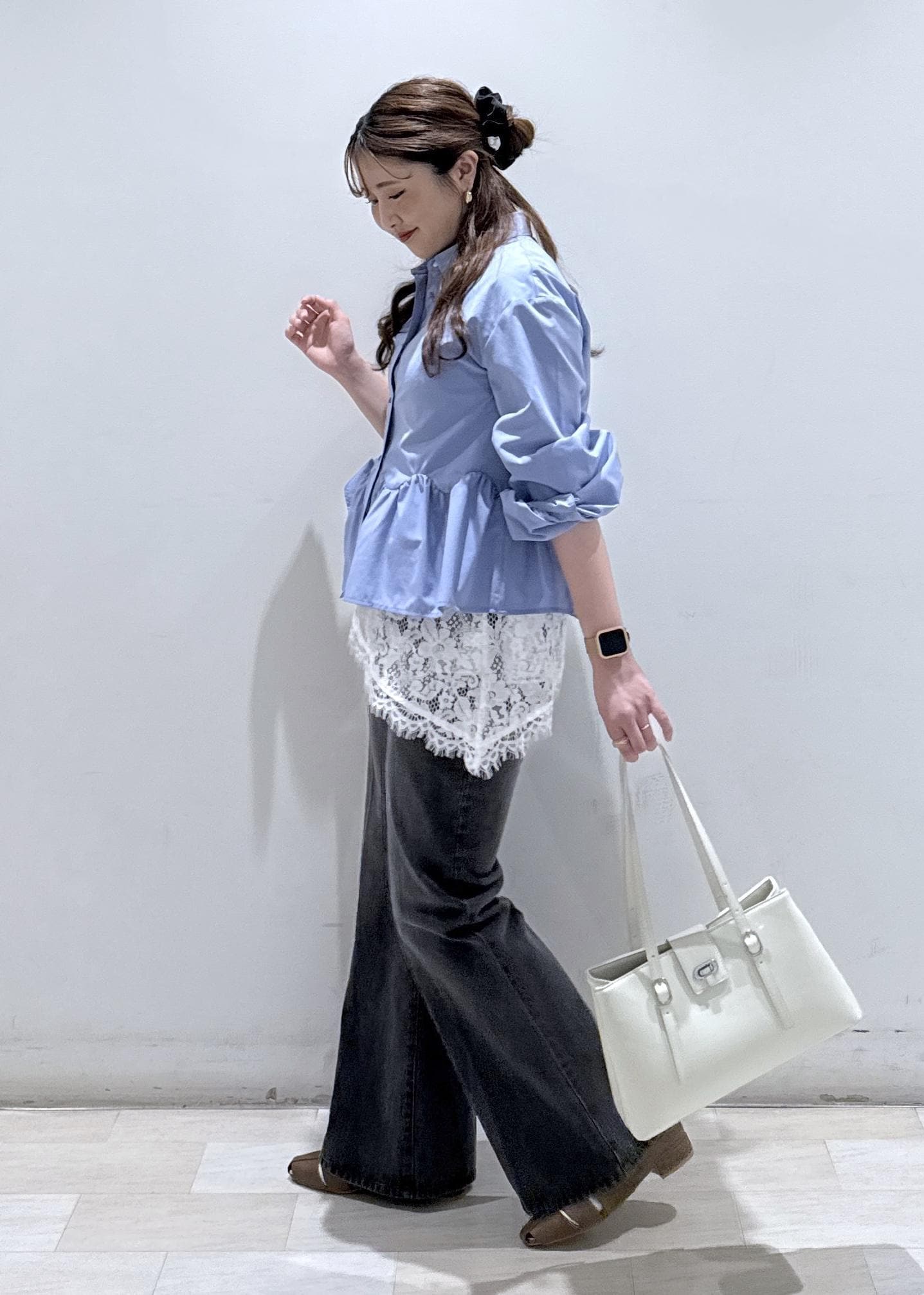 今年トレンドのレースをインナーでレイヤードすることによって、少しこなれ感がでるようにしています。サックスブルーとホワイトの組み合わせも清潔感に見えるのでこれからの春先に使えるシャツですよ