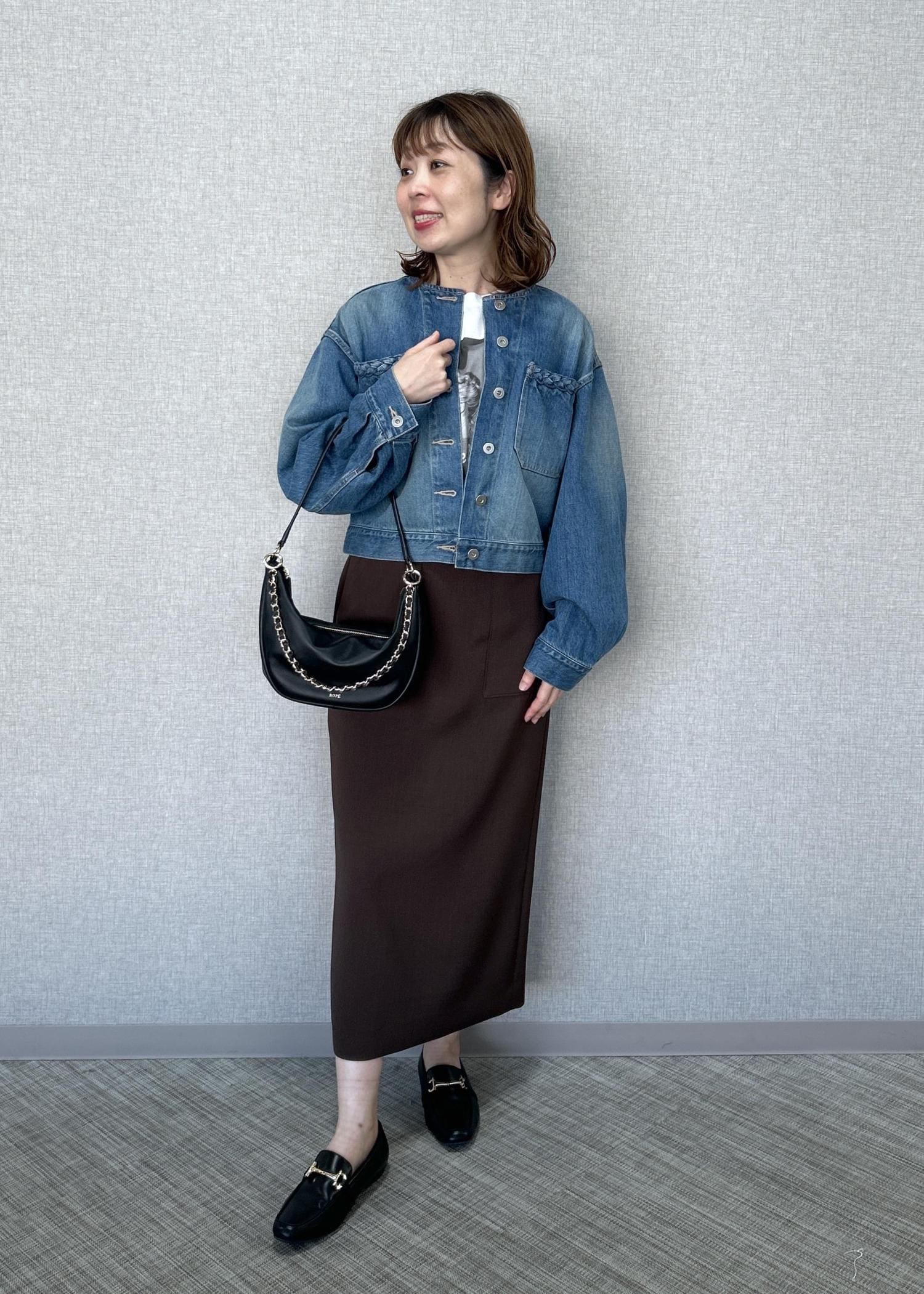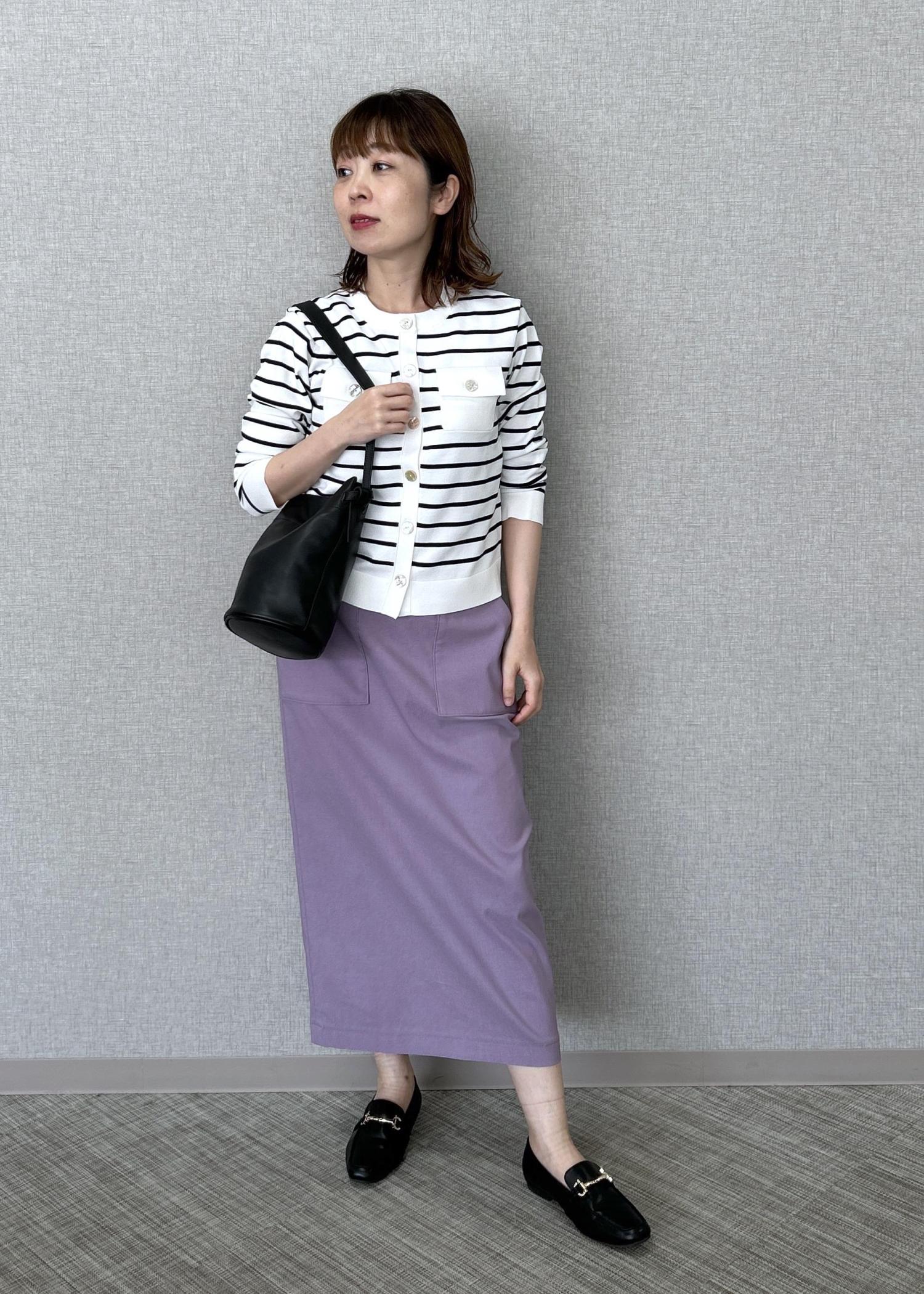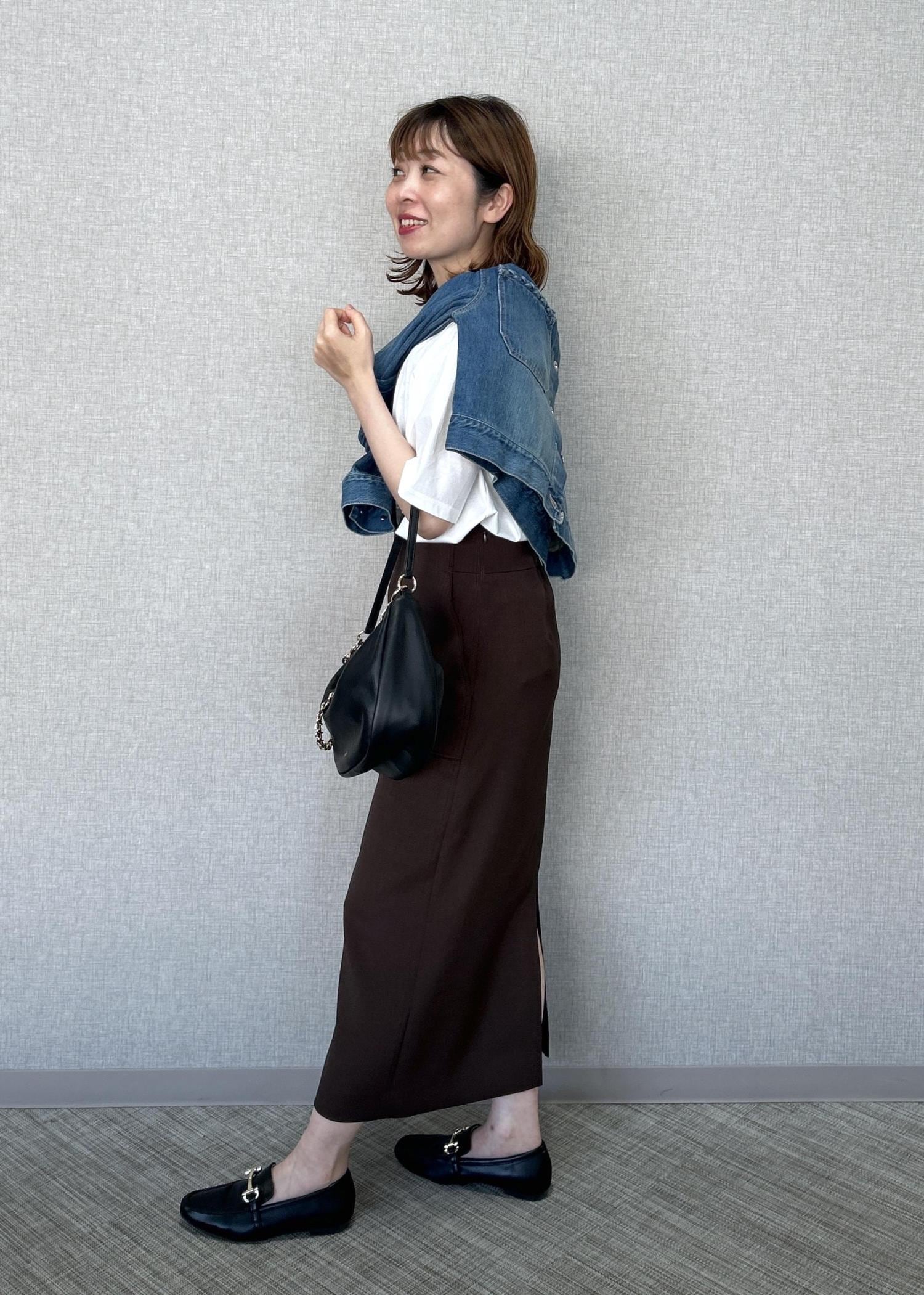 タイトスカートはトップスをカジュアルや綺麗めでも合わせやすいです。 -