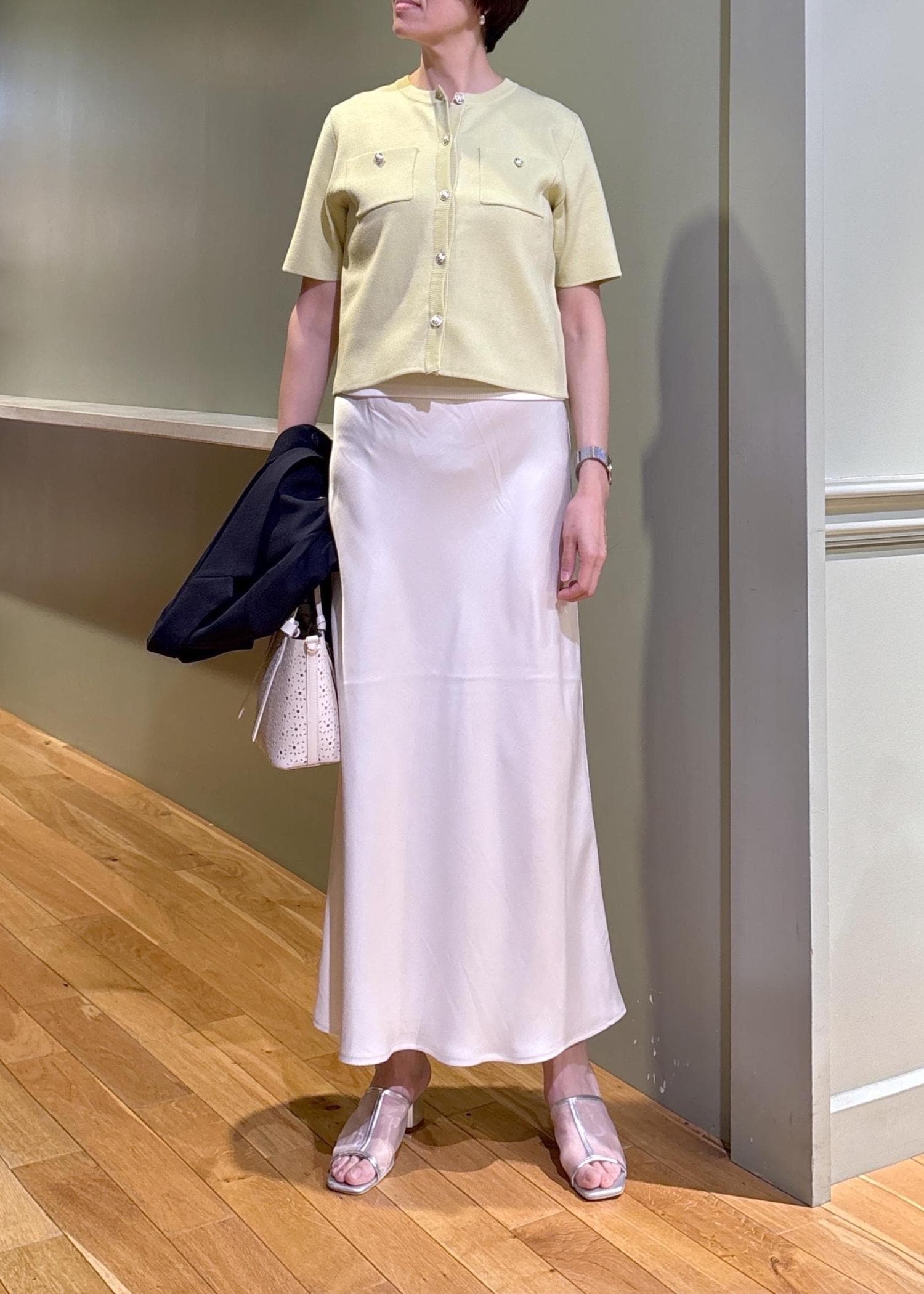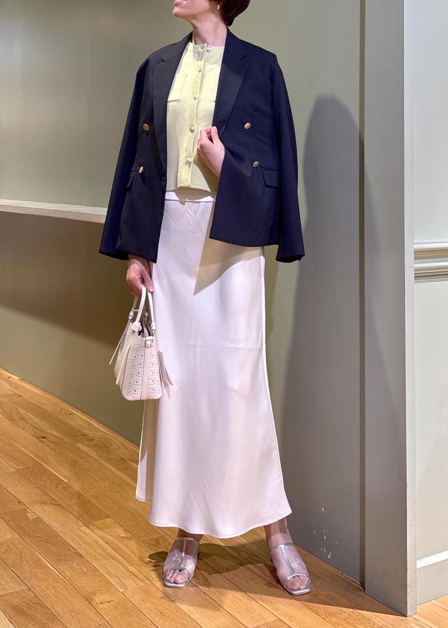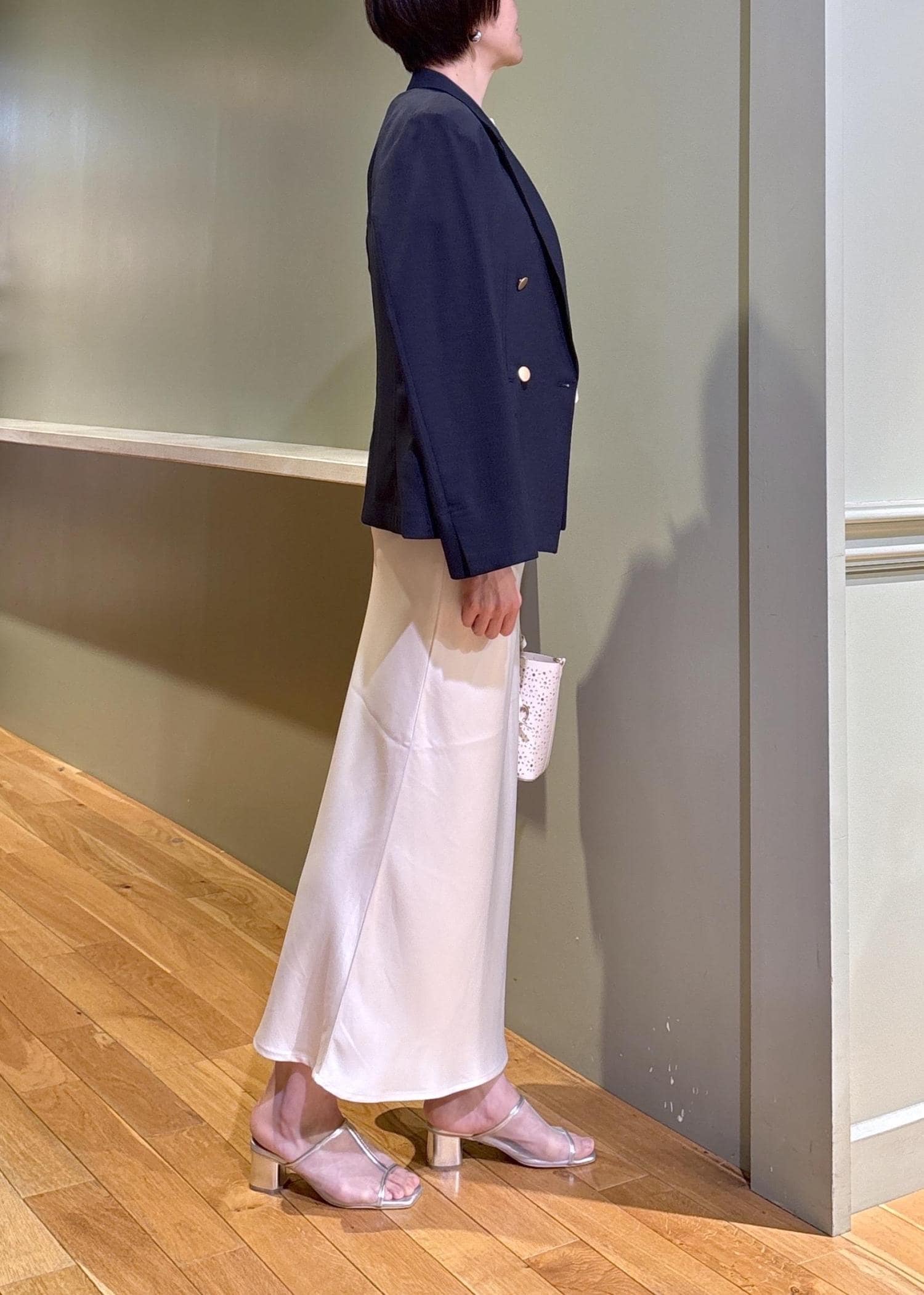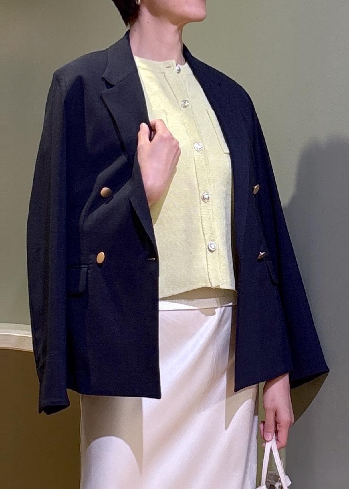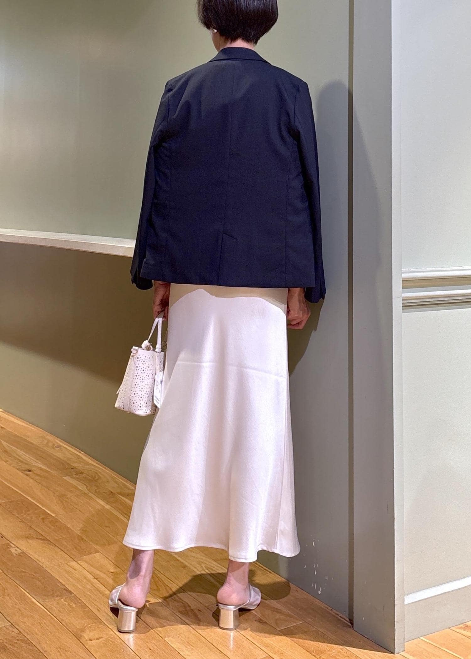 ジャケットにスカートを合わせた大人の綺麗めジャケットスタイルです。長すぎない丈のジャケットは、パンツだけで無くスカートも合わせやすく、幅広いスタイルが楽しめますよ。