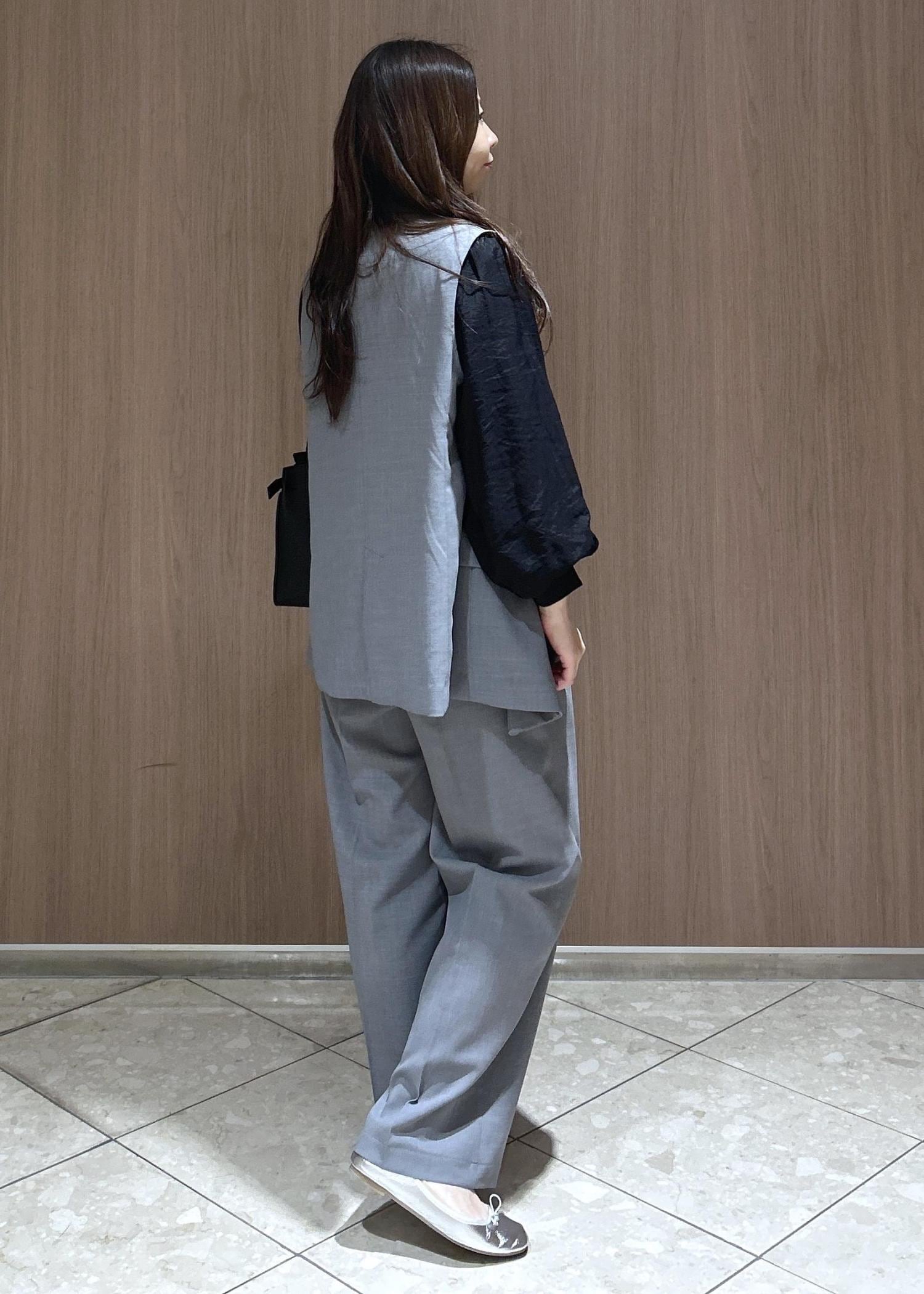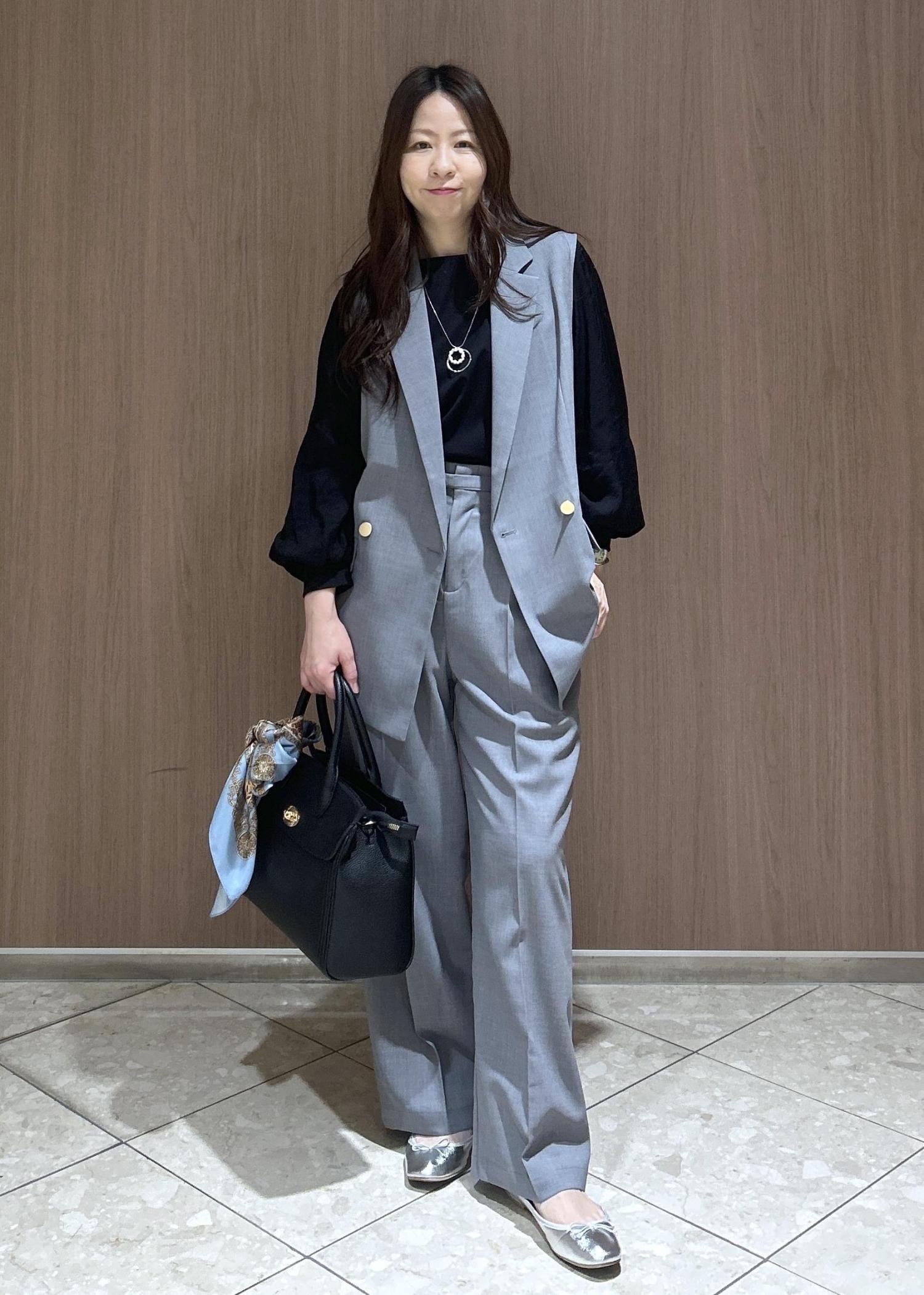 ジレにパンツ合わせでクールなオフィスカジュアルスタイルです。動きやすく清涼感をあるので真夏から秋までも着られるスタイリングです。
