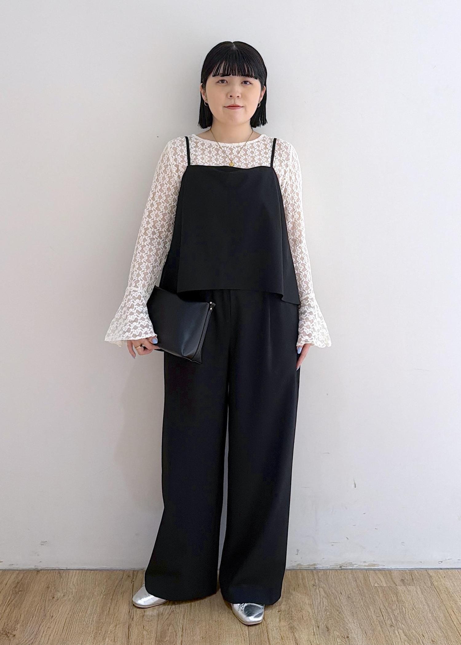 こちらリアルバイアイテム☺︎156cmで少し長めに着用したかったのでMサイズにしました◎ヒップ周りも張り付くことなく着用できるのでインナーも響きにくいです!肩紐で着丈調節できるのでシューズも選ばず着回しできそうです☺︎