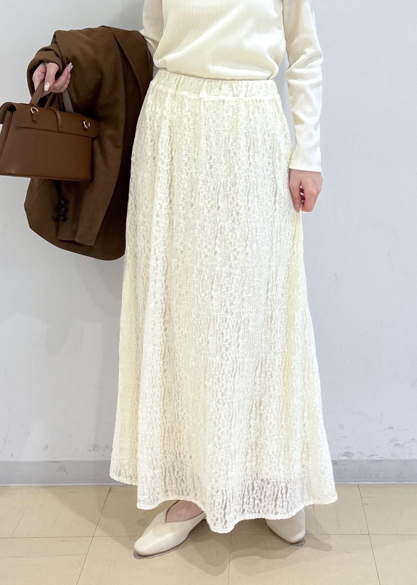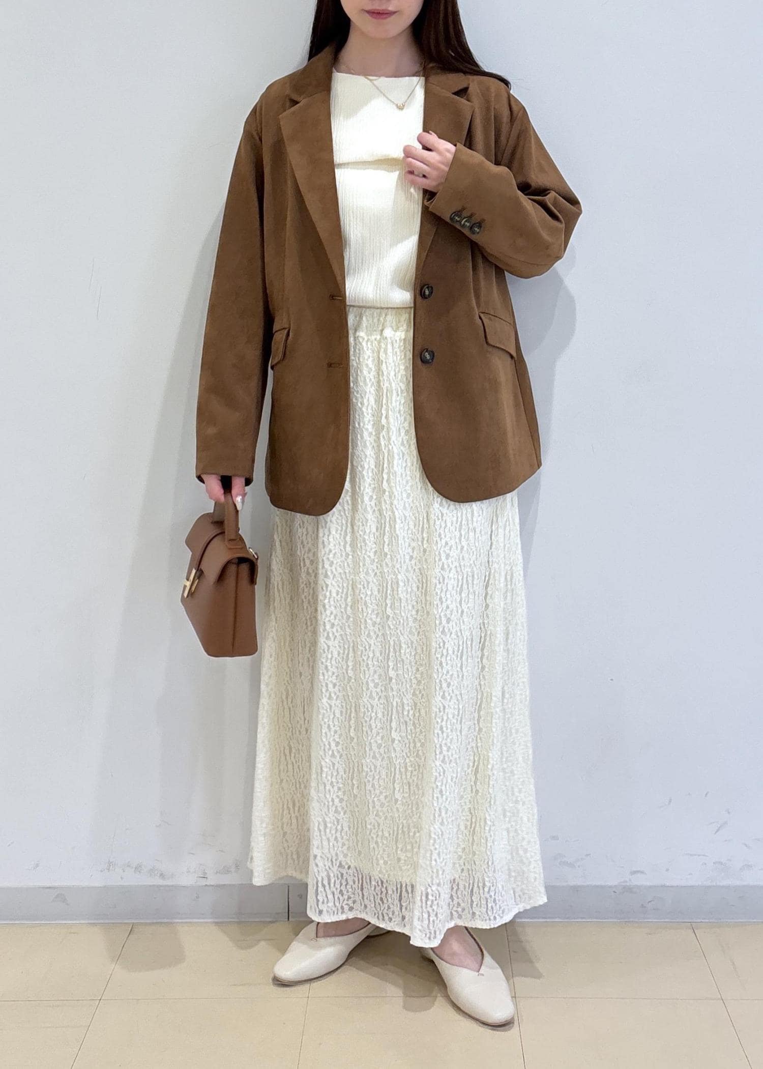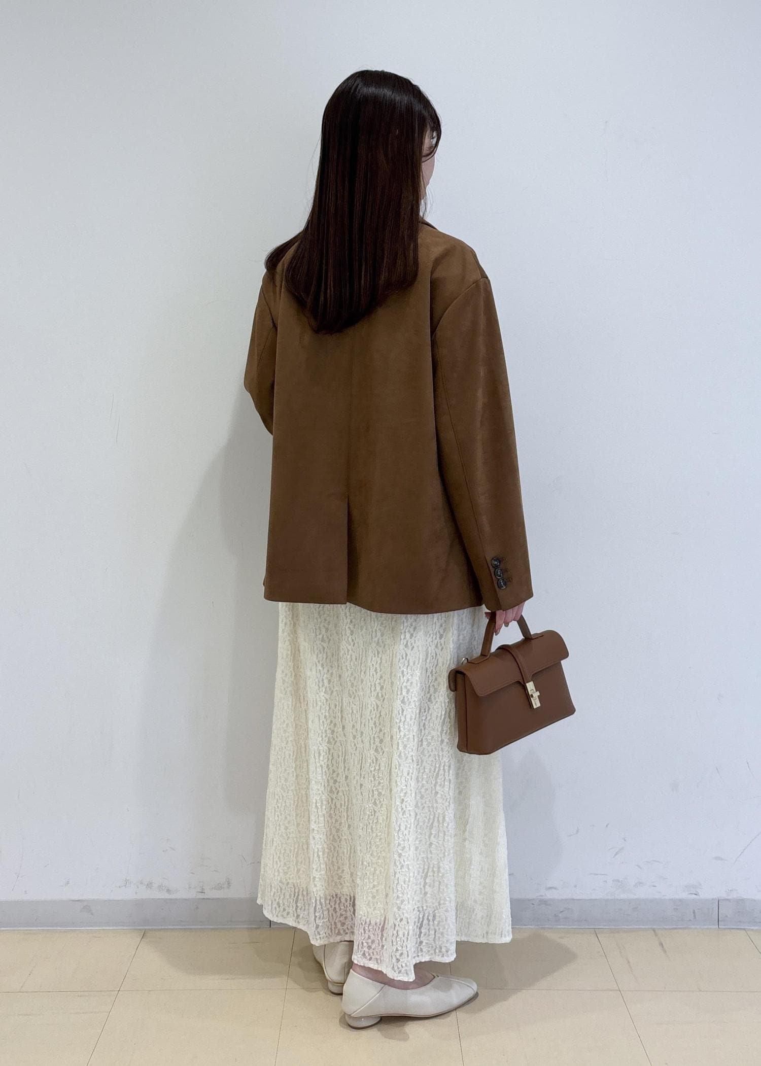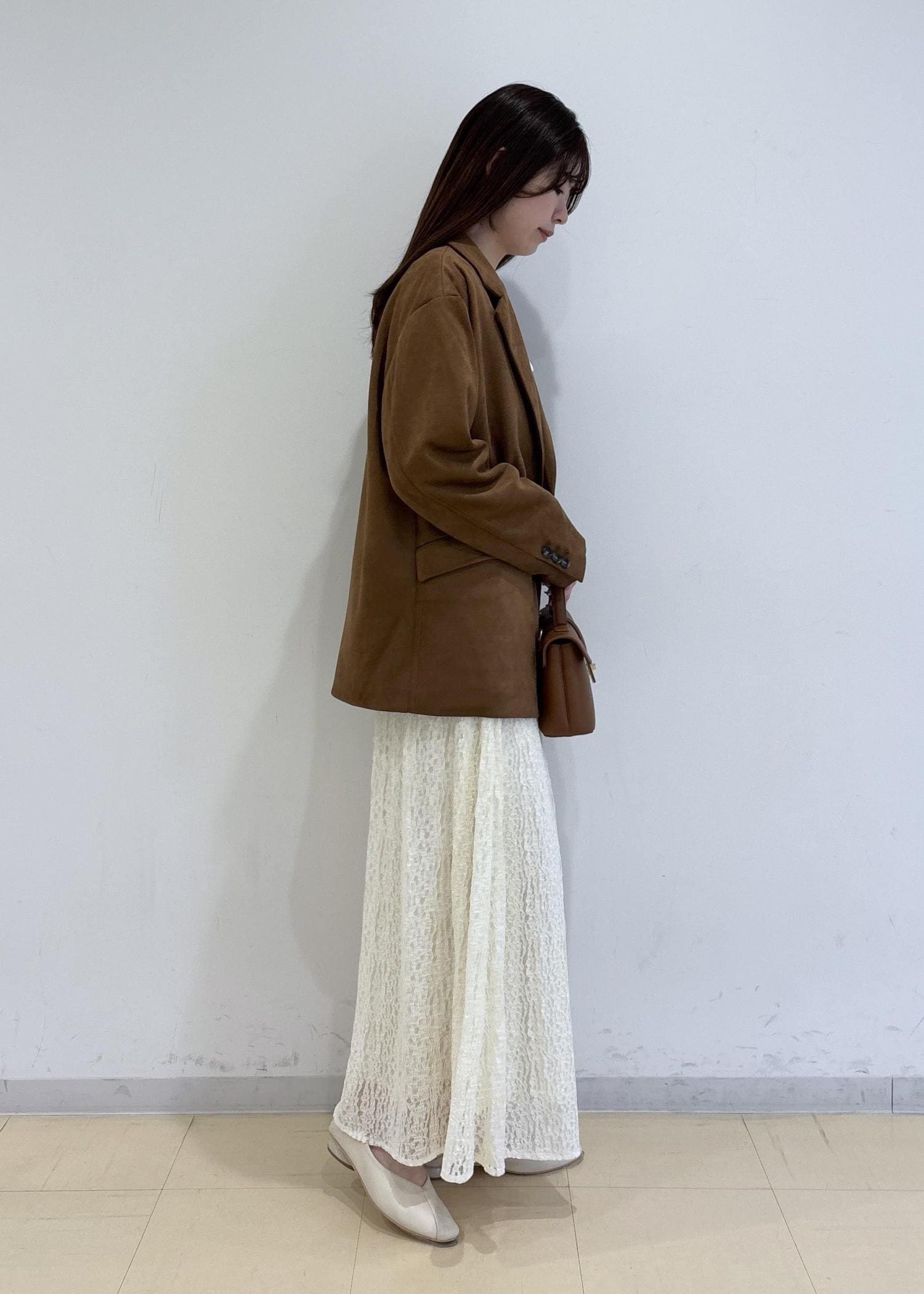 スエードジャケットはオーバーサイズですが、ダボっとしすぎてないのでフェミニンなスカート合わせもバッチリです。