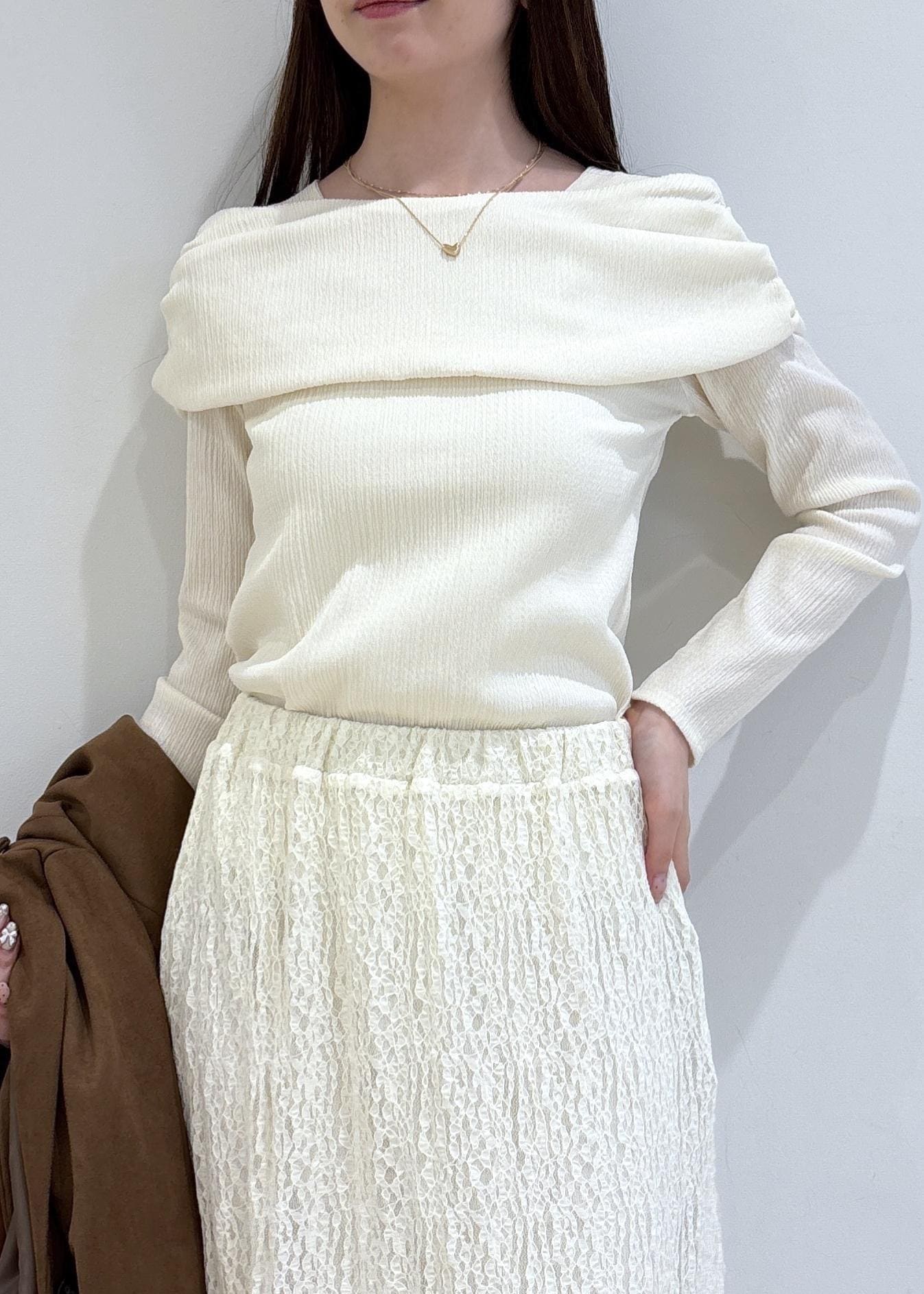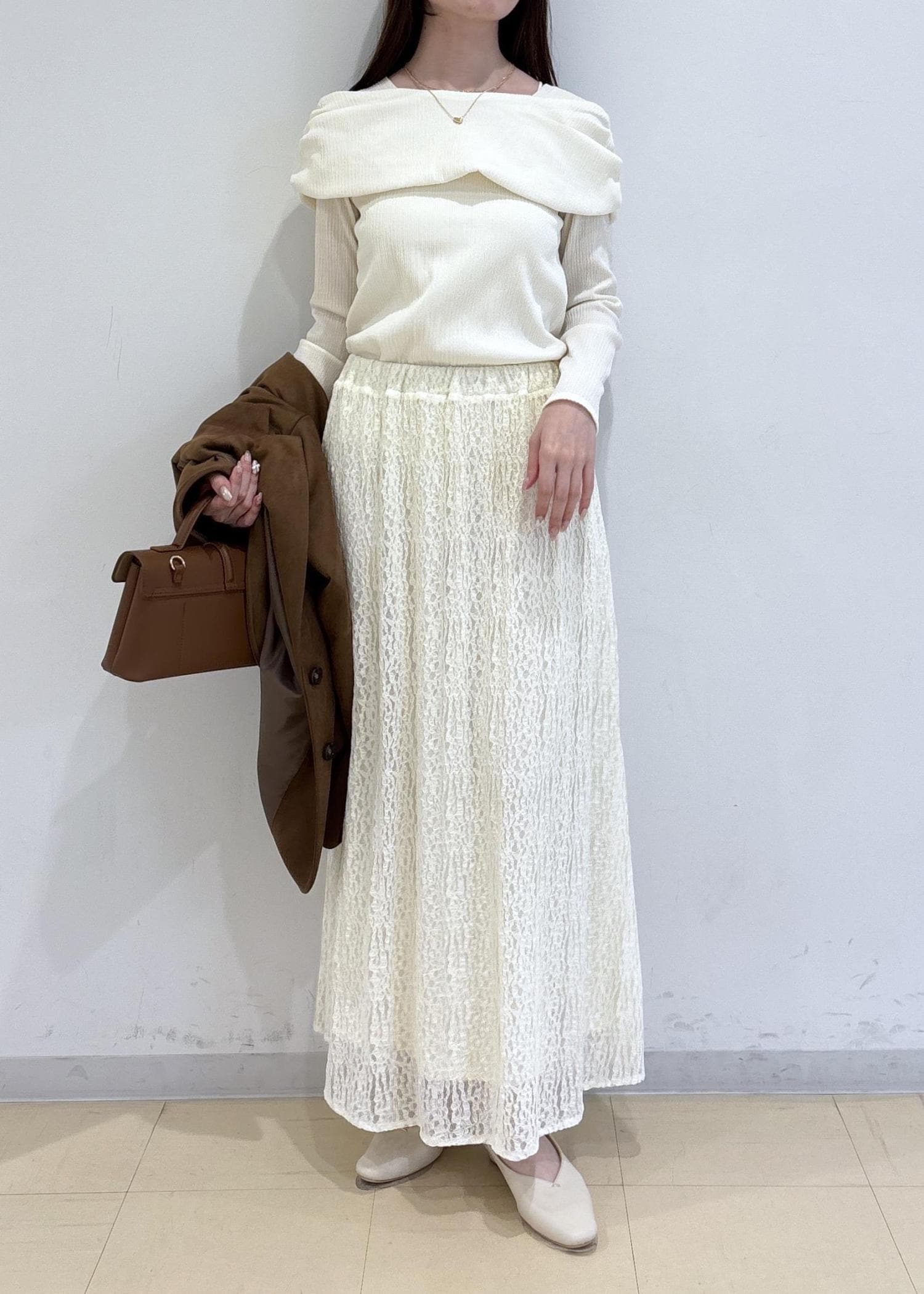 トップスはオフショル風のデザインで、アウターを脱いだ時も可愛い!