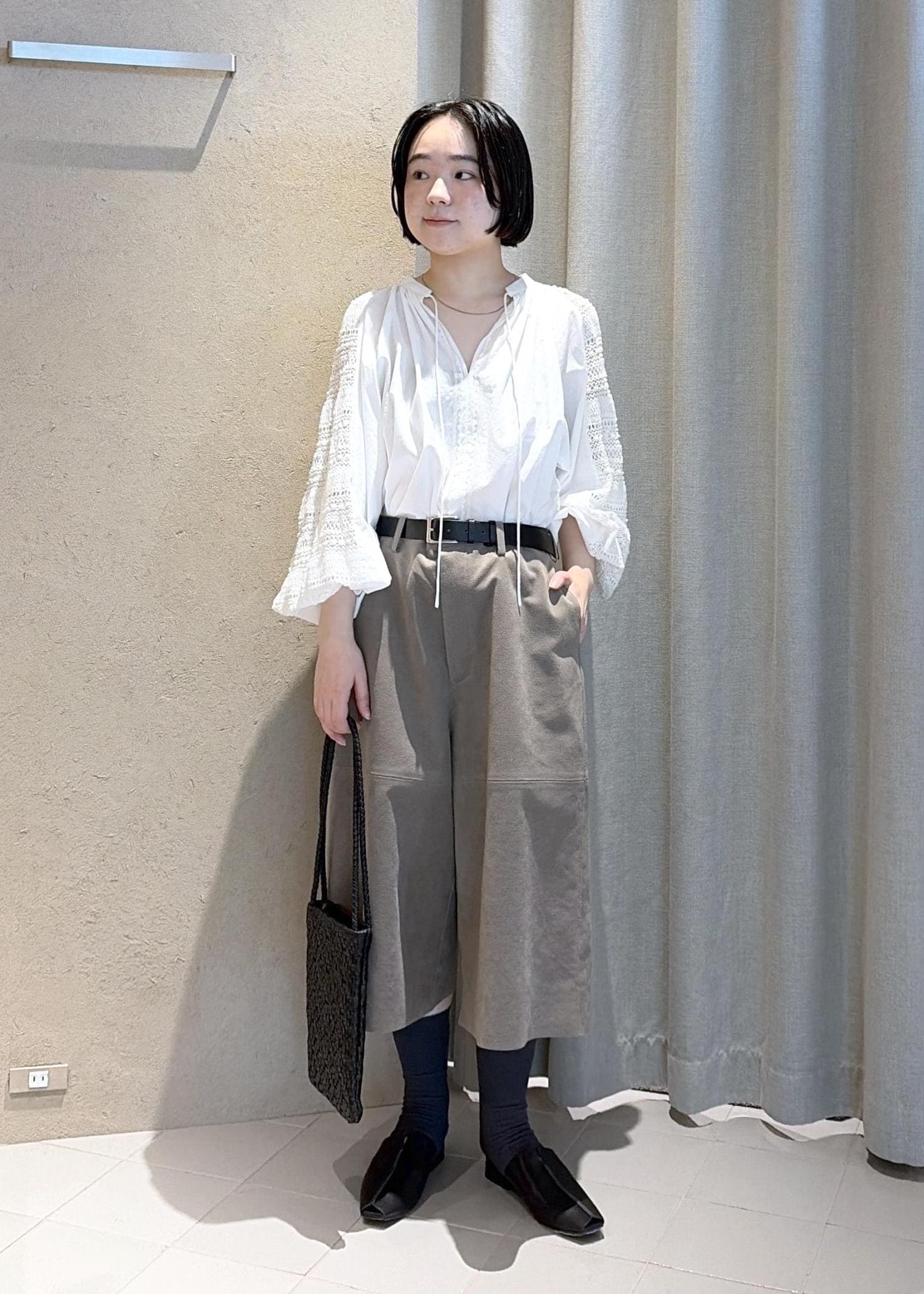 肩パットがついていない分少し大きめサイズで選んでいただいても綺麗に肩のラインに沿ってくれます。丈はヒップがしっかり隠れる今っぽいシルエットで、スカートスタイルパンツスタイルどちらに合わせても素敵に決まります。