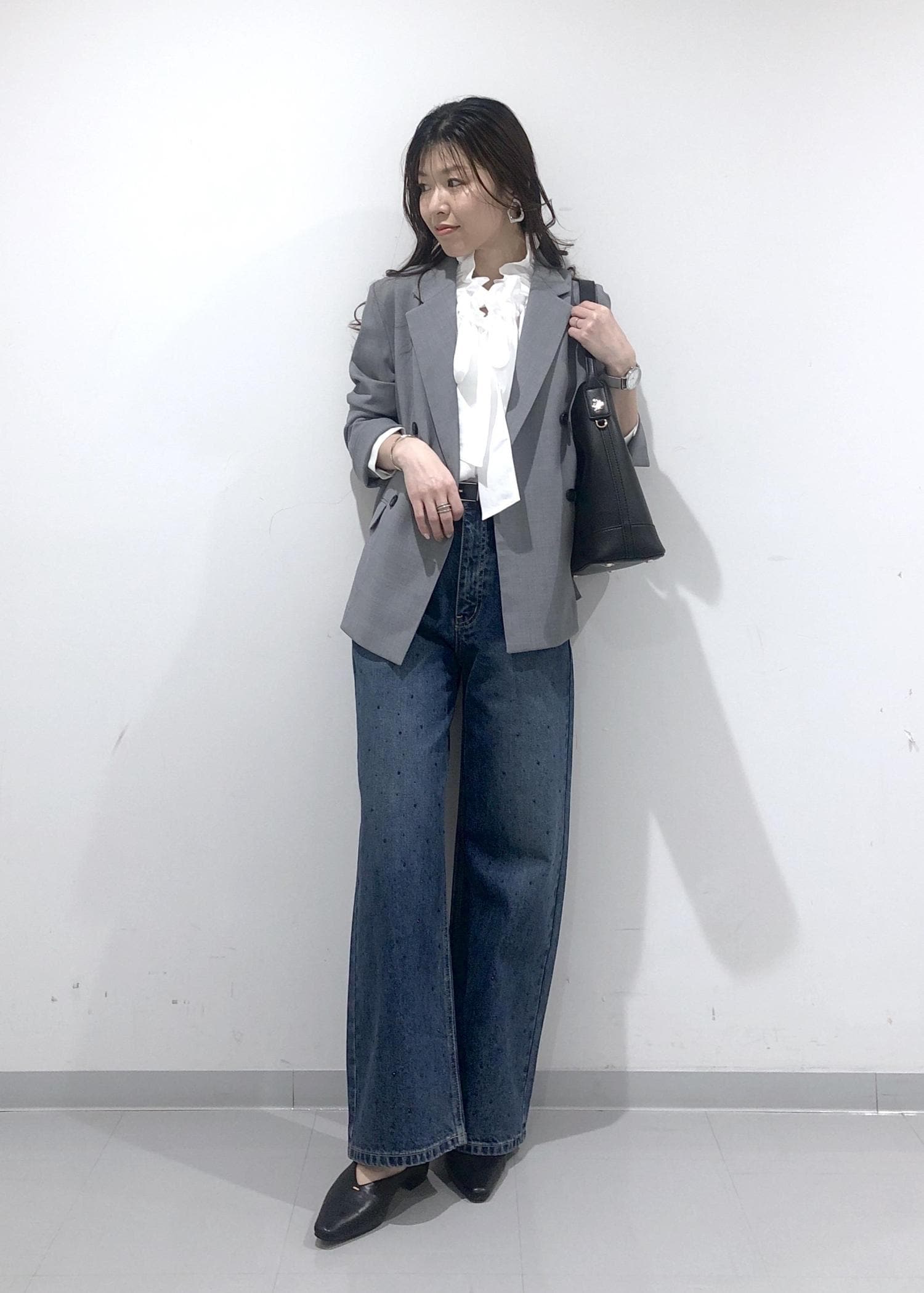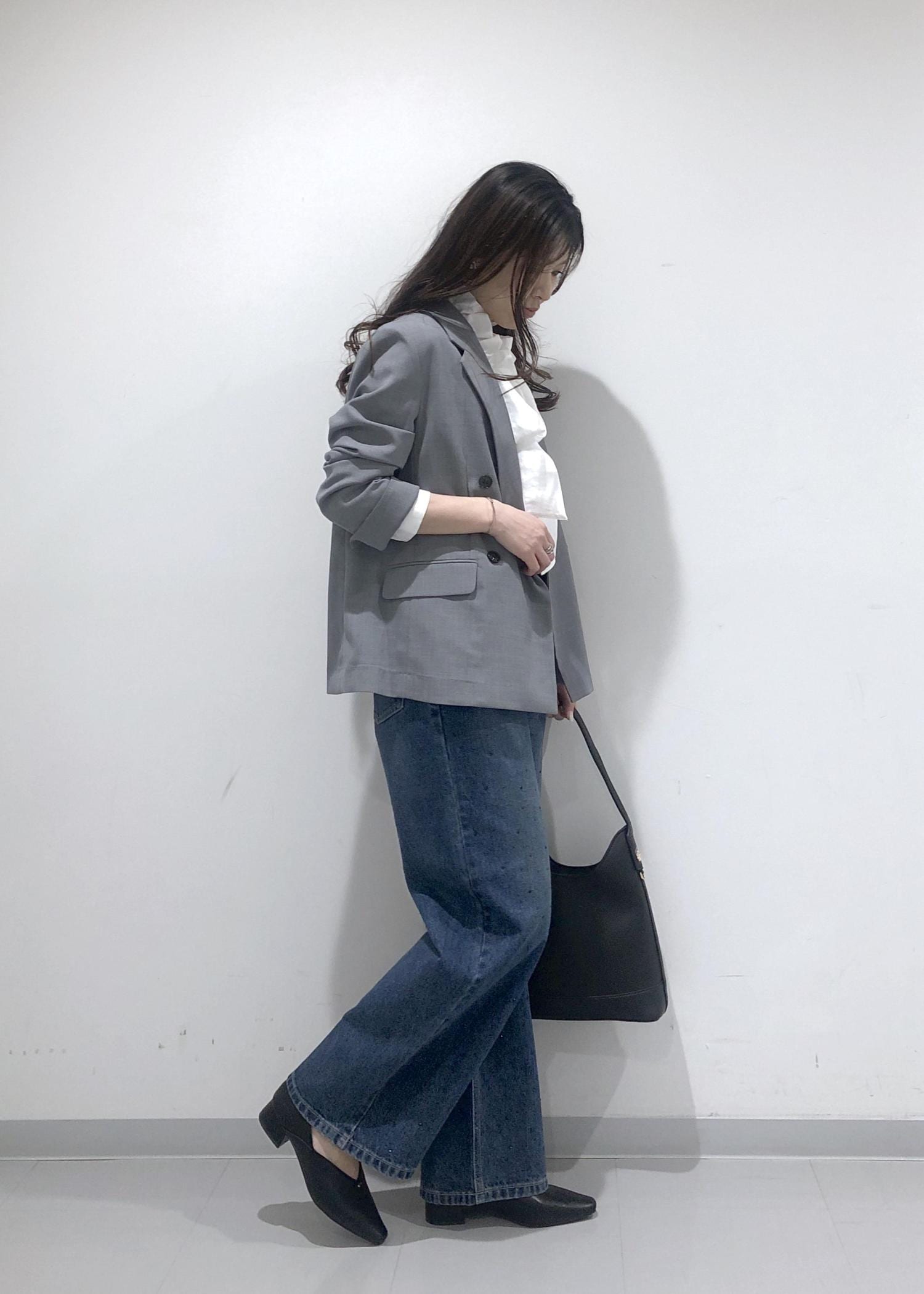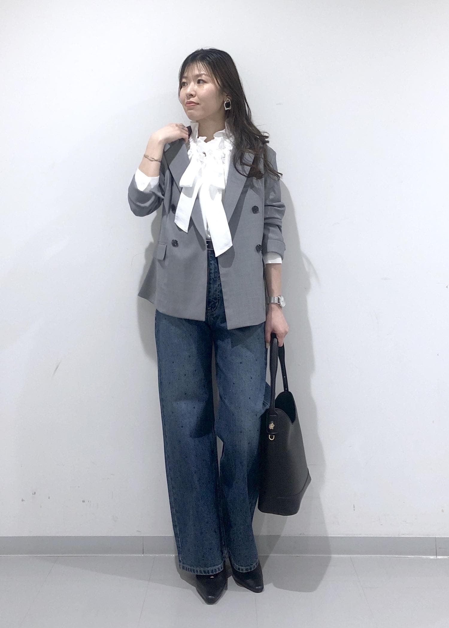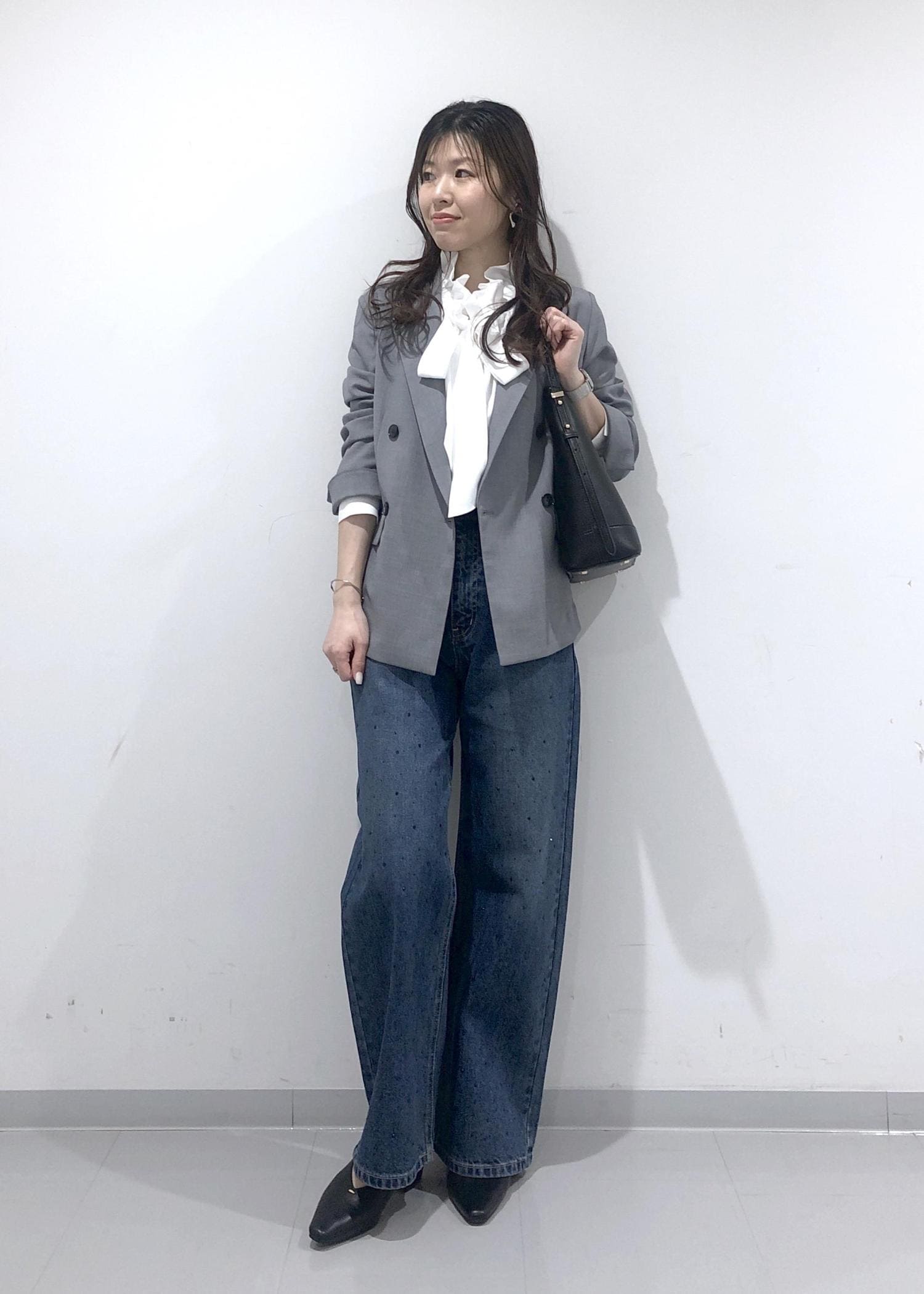名古屋限定モデルのグレージャケットに、華やかなフリルリボンブラウスとキラキラビジューデニムを合わせたきれいめカジュアルコーデ!!