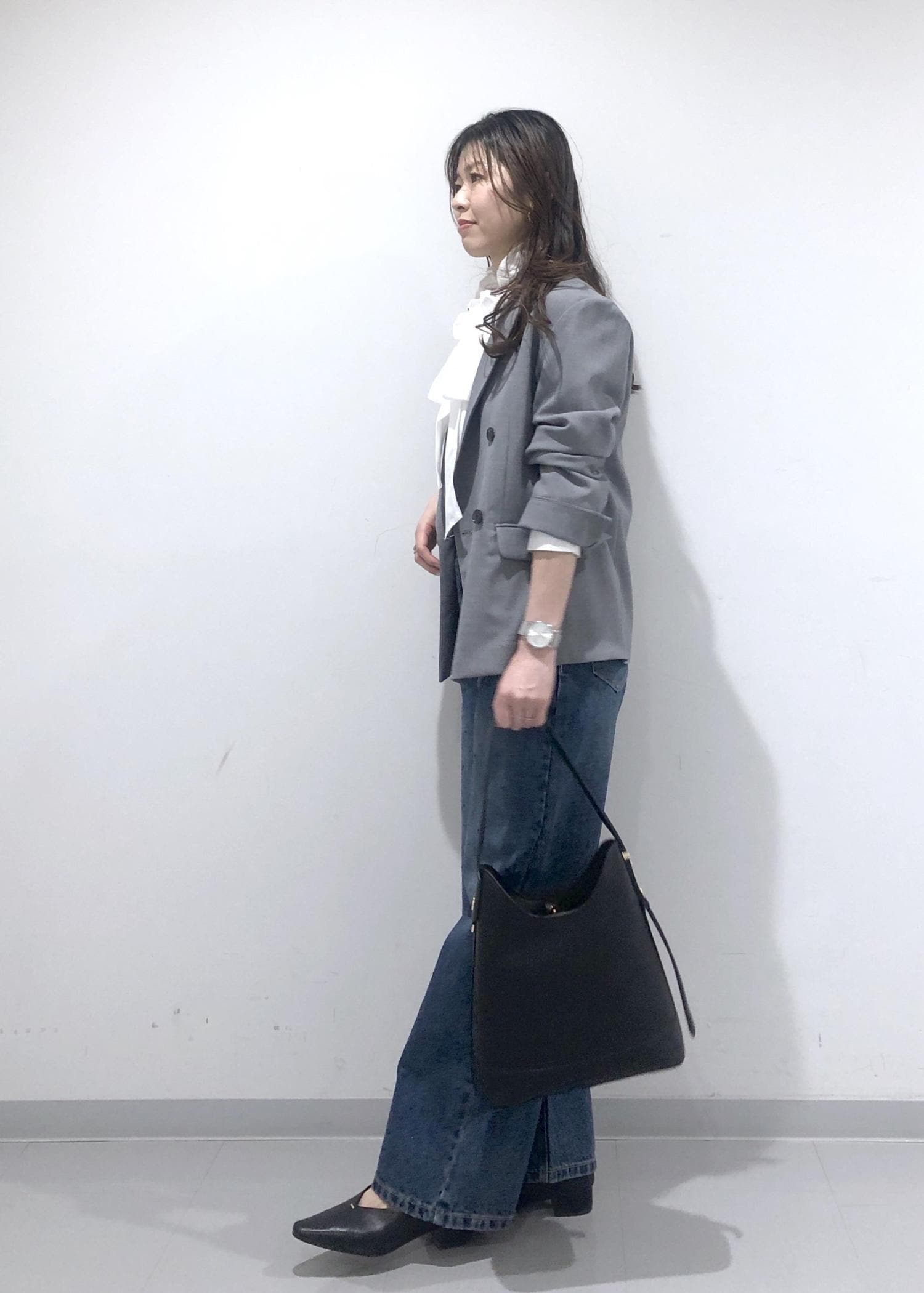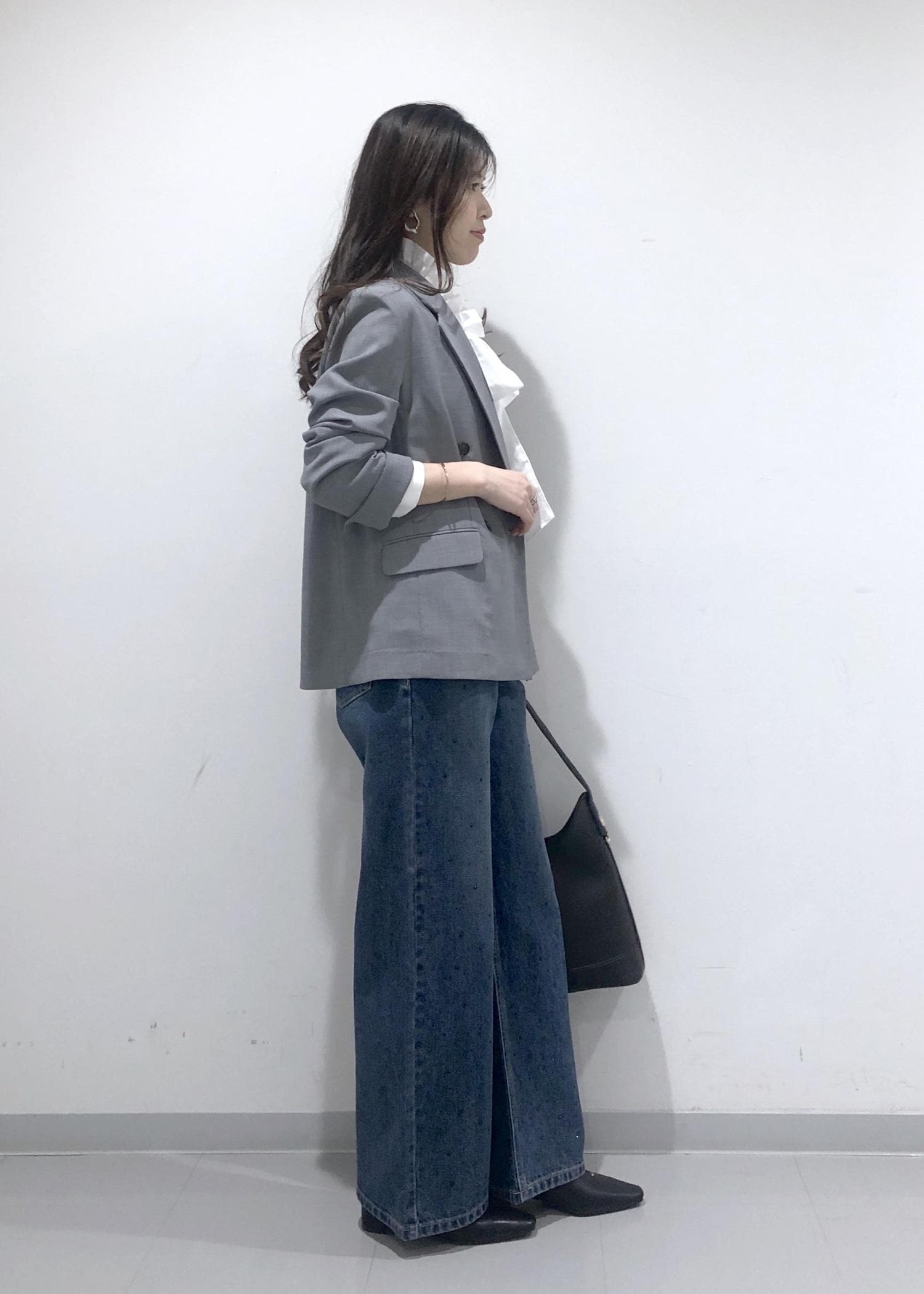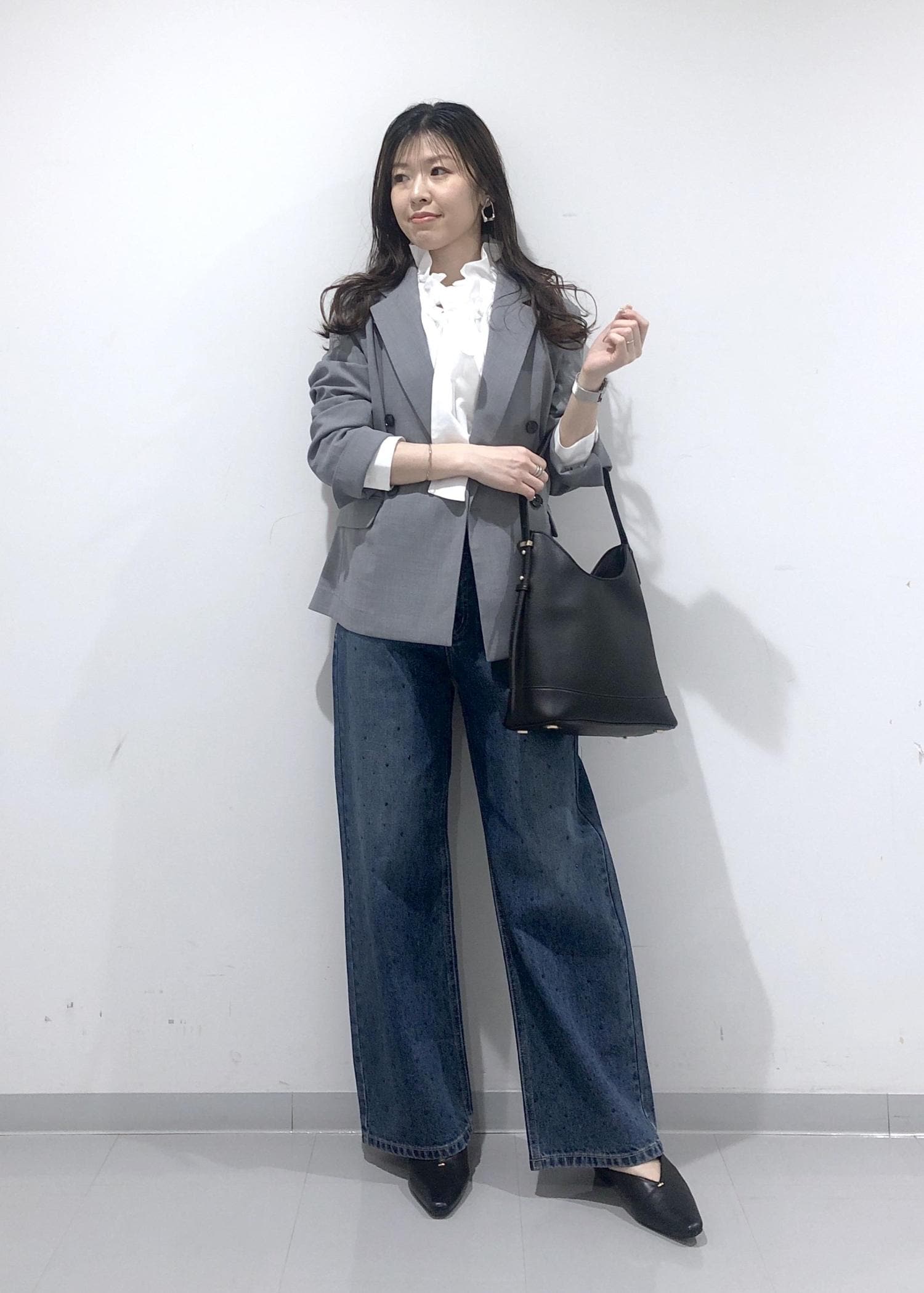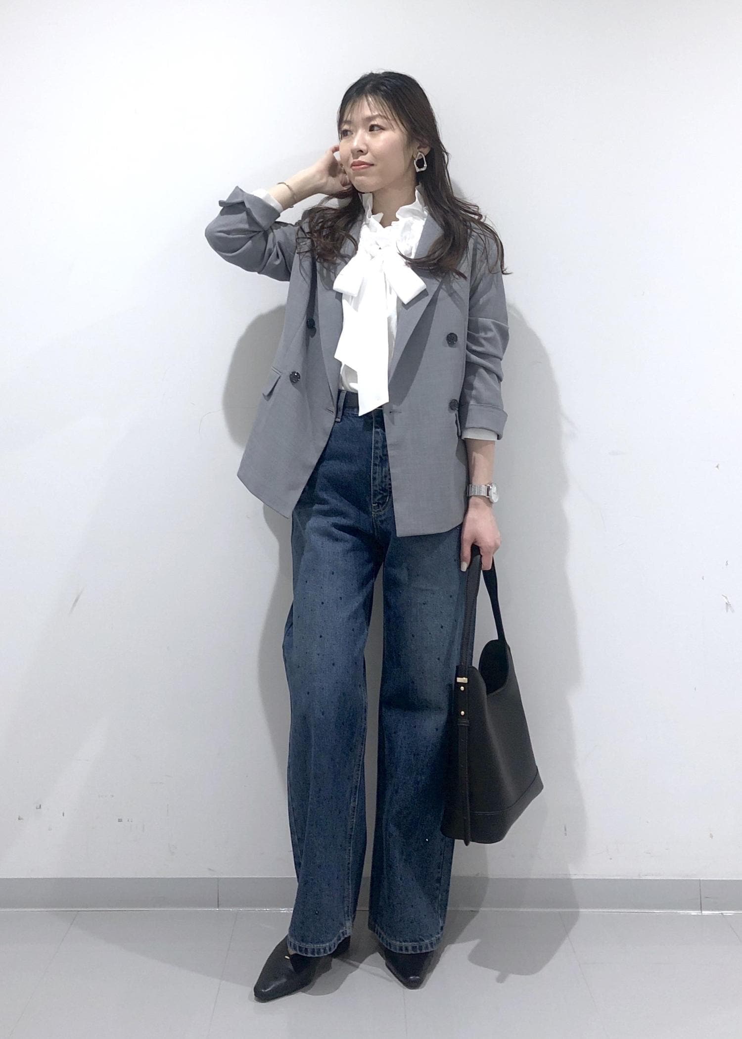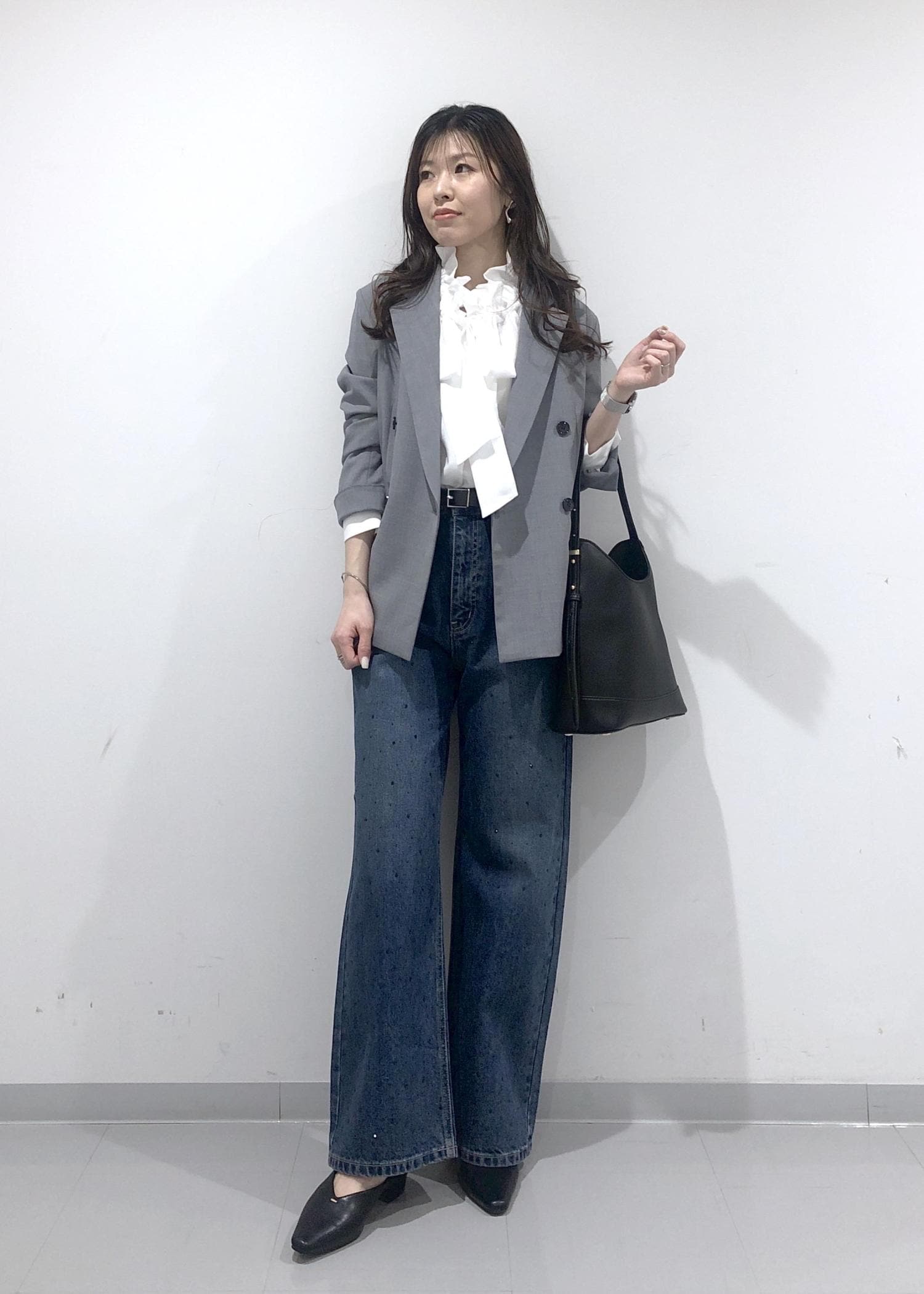 名古屋限定モデルのグレージャケットに、華やかなフリルリボンブラウスとキラキラビジューデニムを合わせたきれいめカジュアルコーデ!!