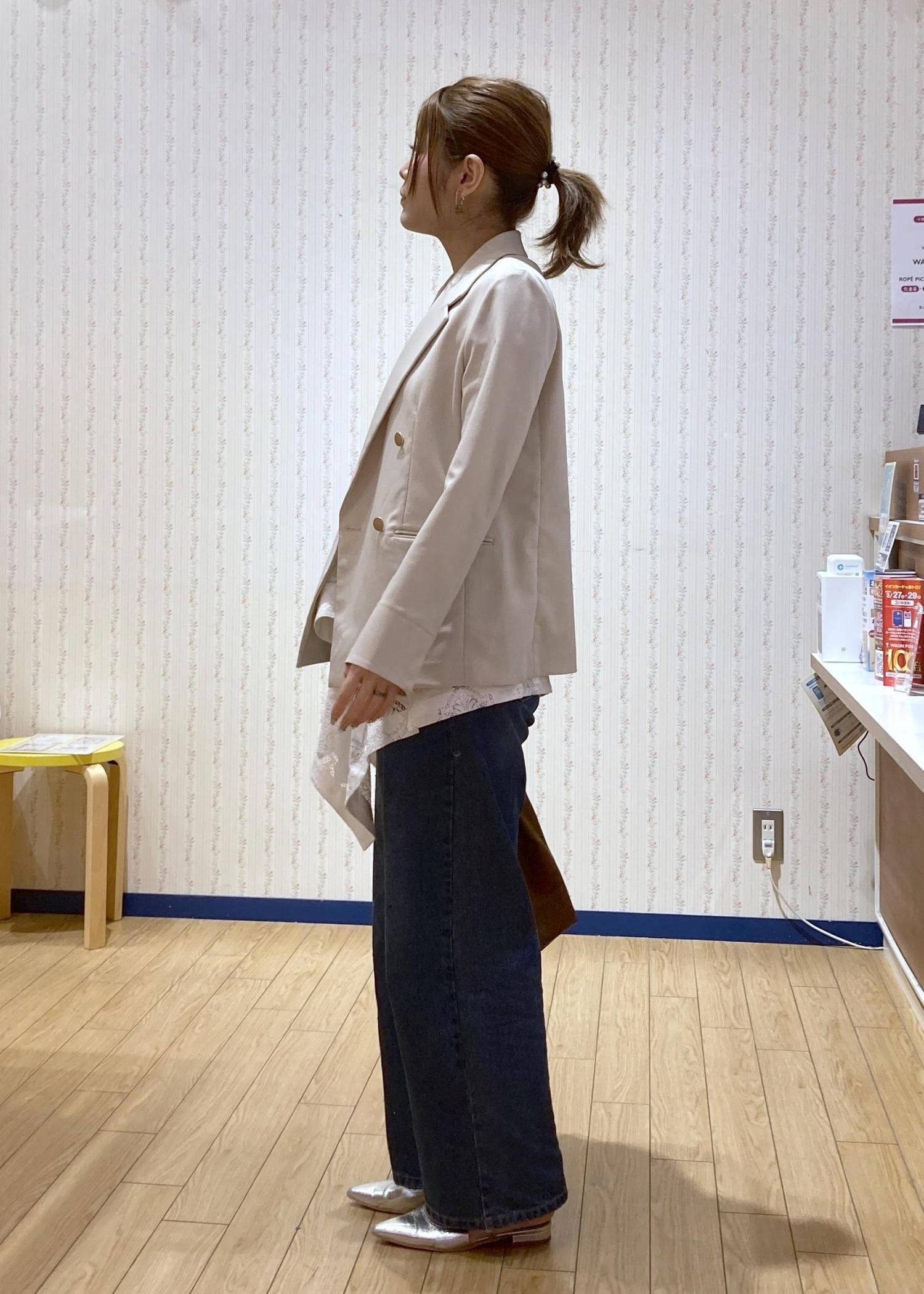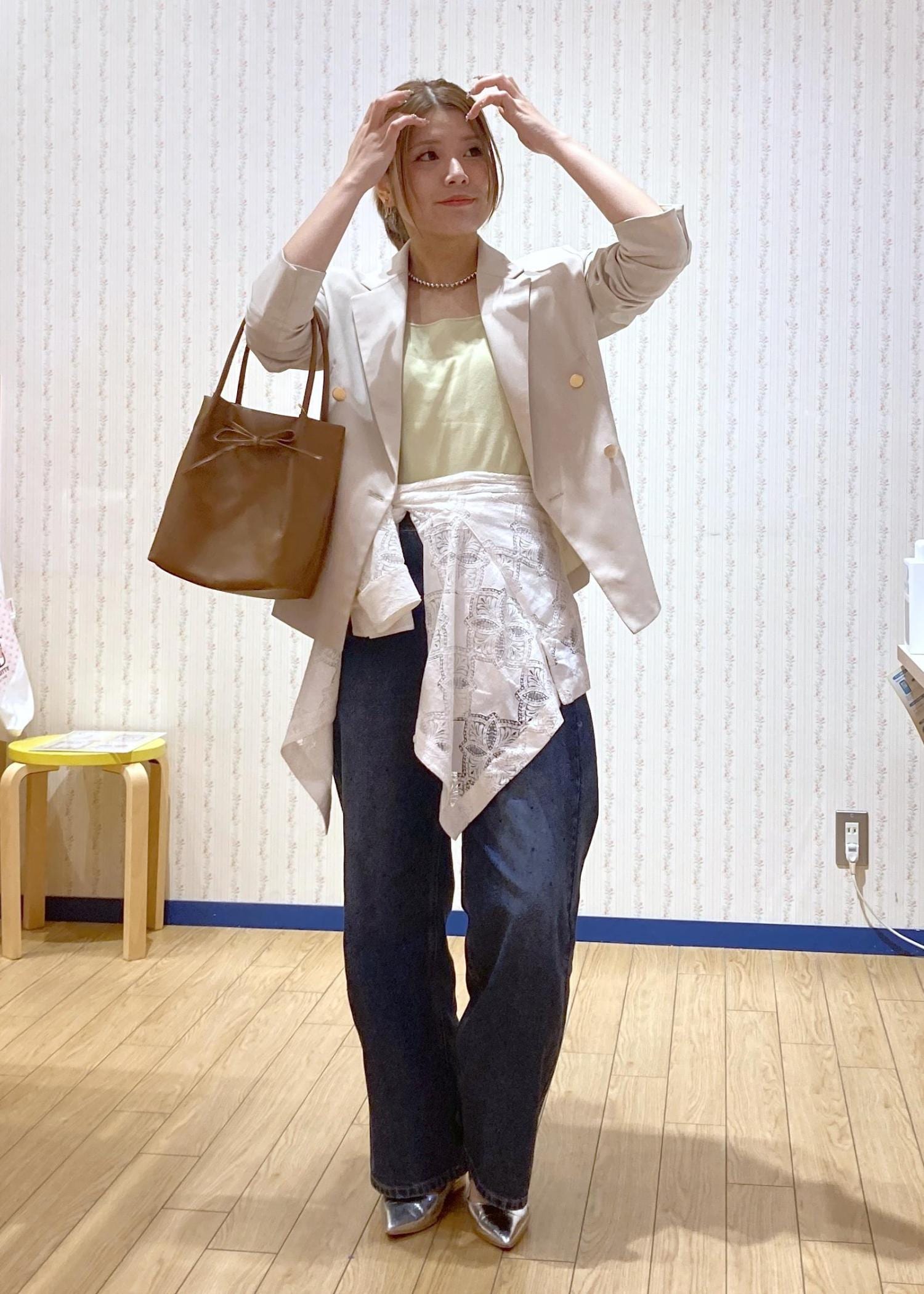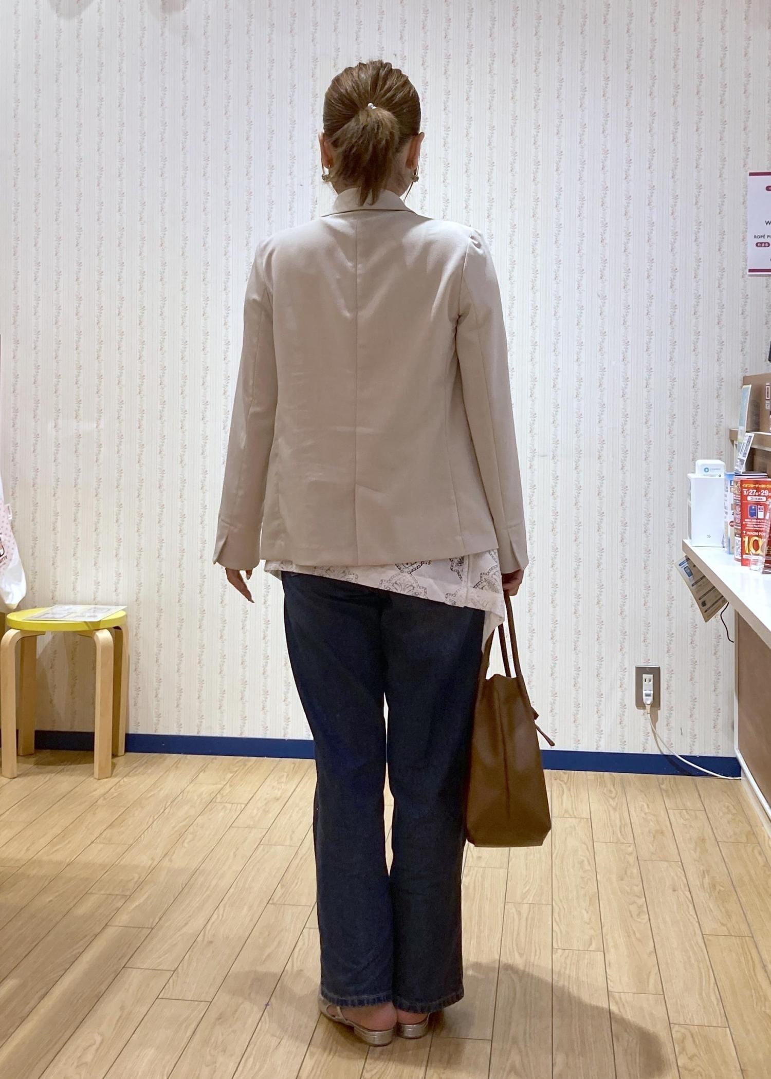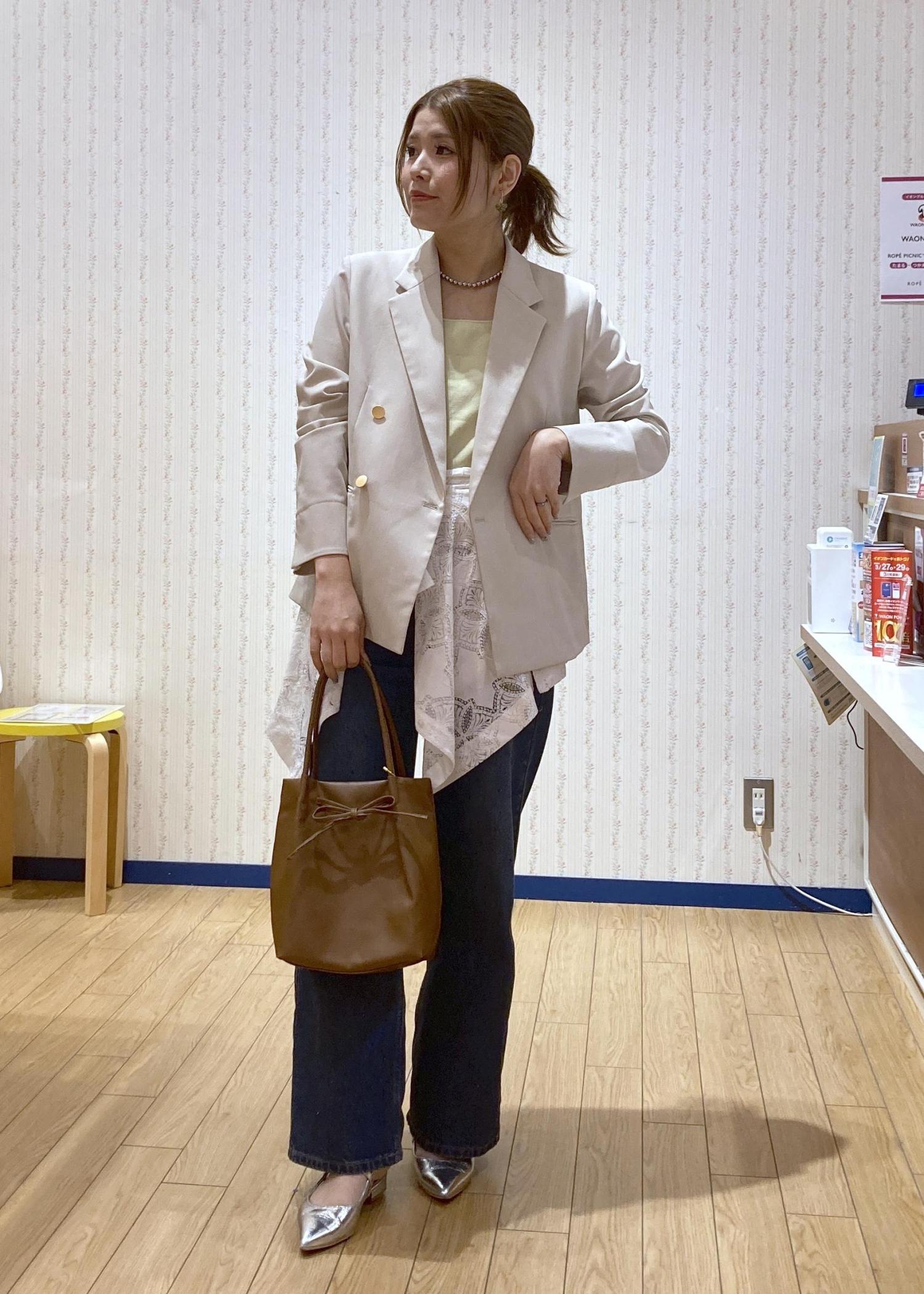 全体的に淡い色で統一したのでデニムは濃い色でコーディネートを引き締めました!