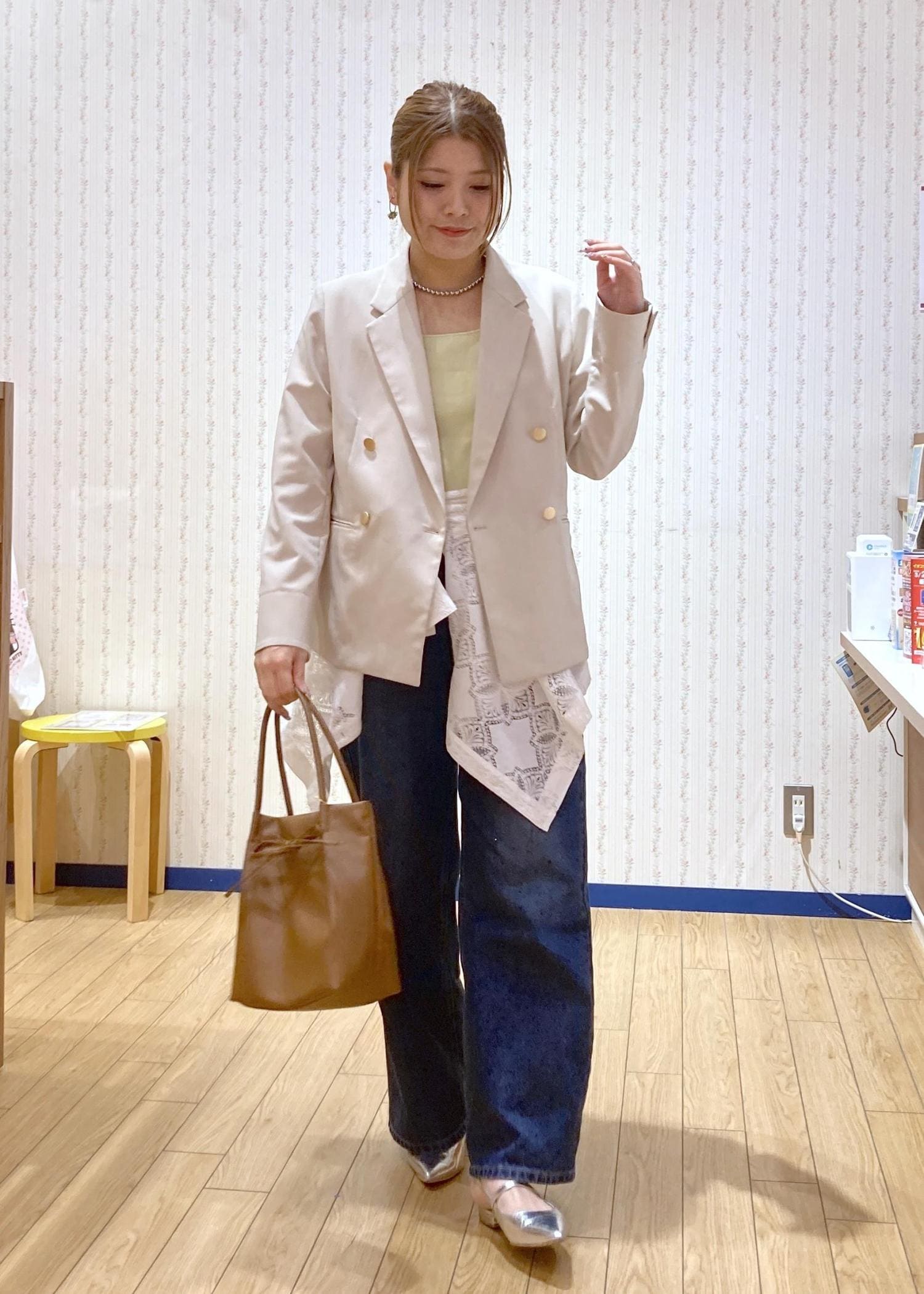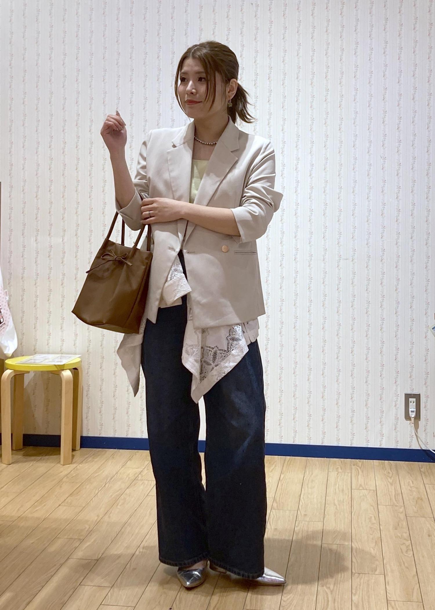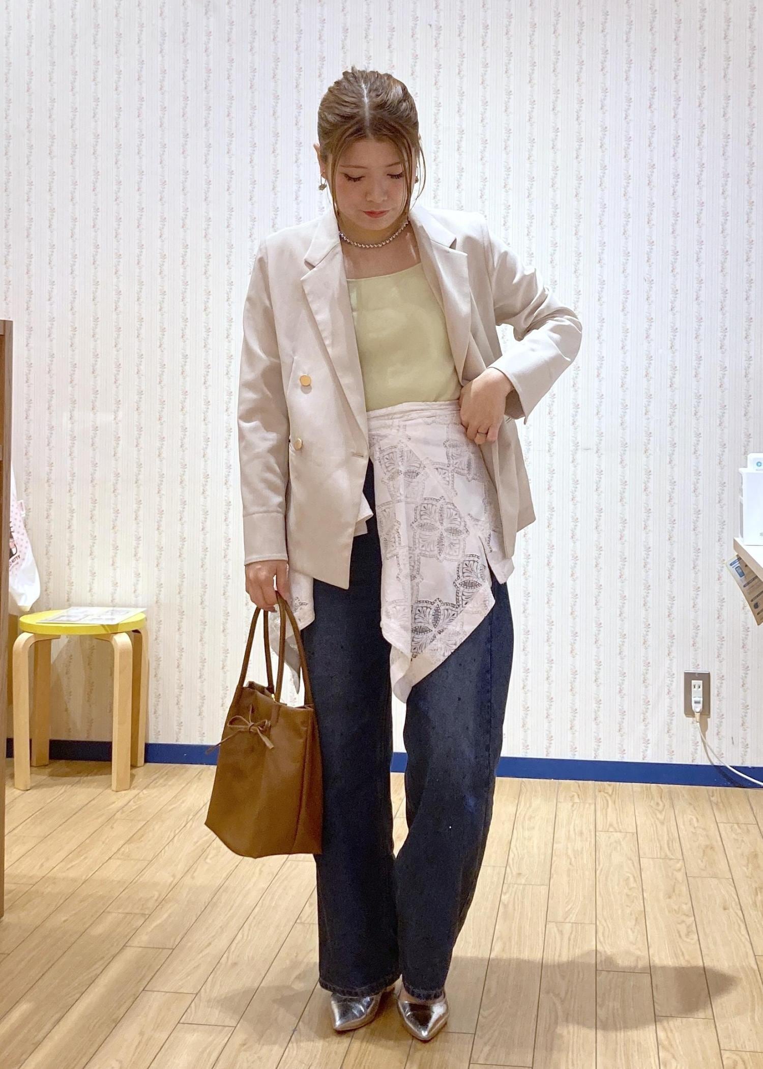 腰に巻いたレースシャツでトレンド感、ジャケットを羽織ってきちんと感をプラスしたデニムコーディネートです。