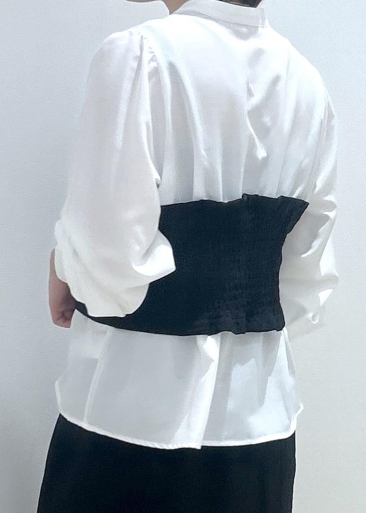 お袖はふんわりしたデザインで、首周りもVネックなのでマニッシュになりすぎず、フェミニンさもあるブラウスです。 -
