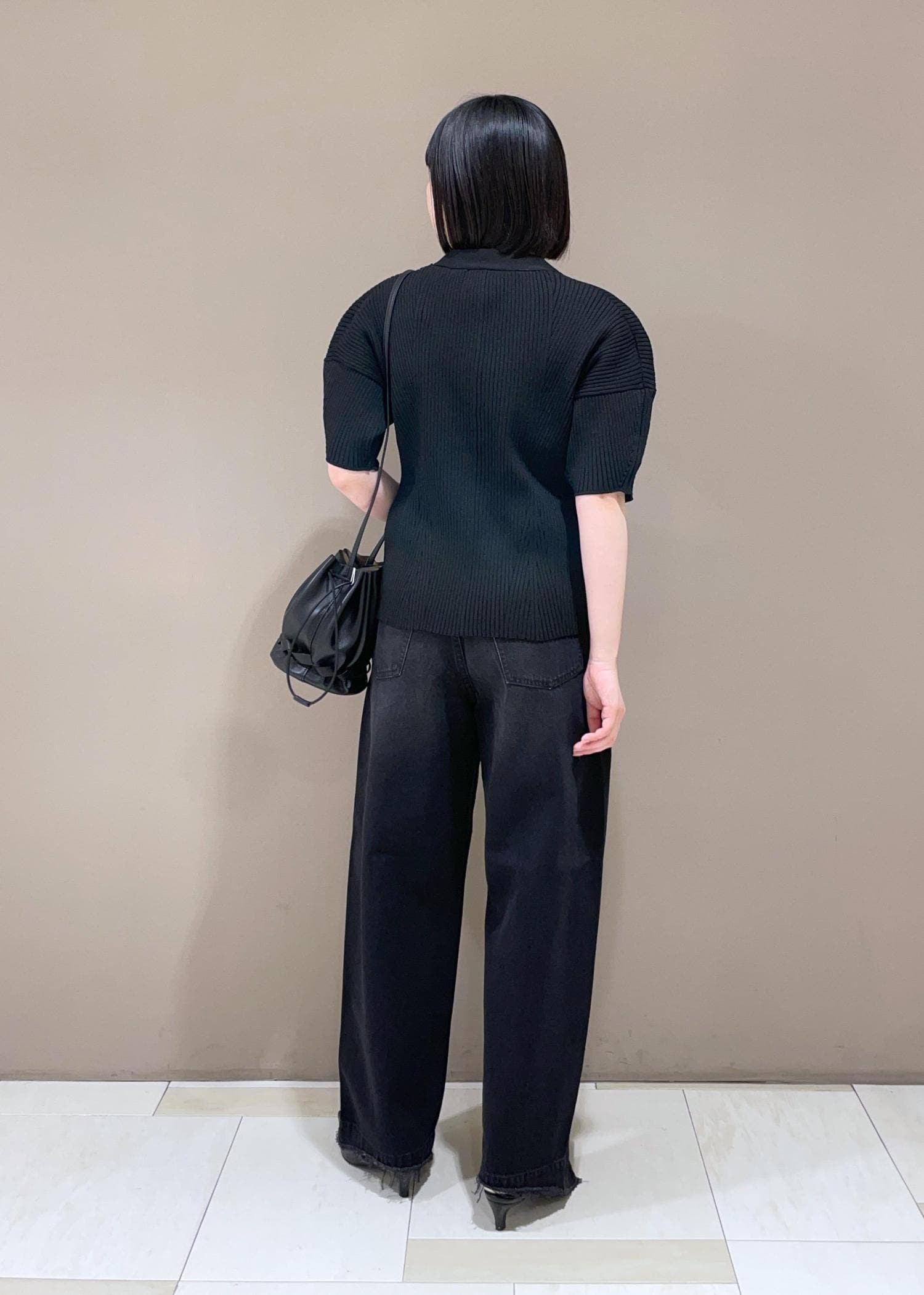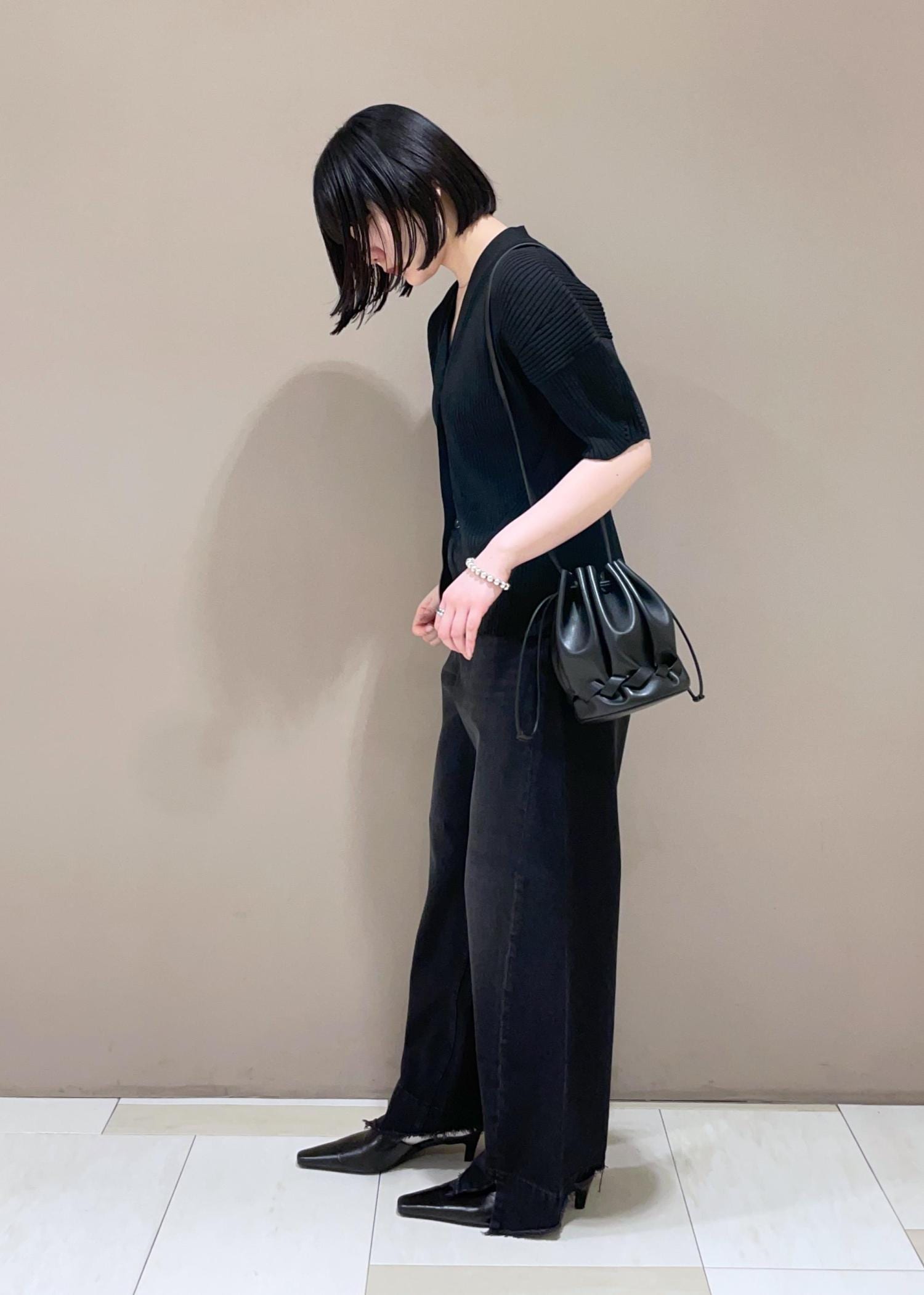 新作のフォルムニットカーディガンを使ったオールブラックコーデのご紹介です!