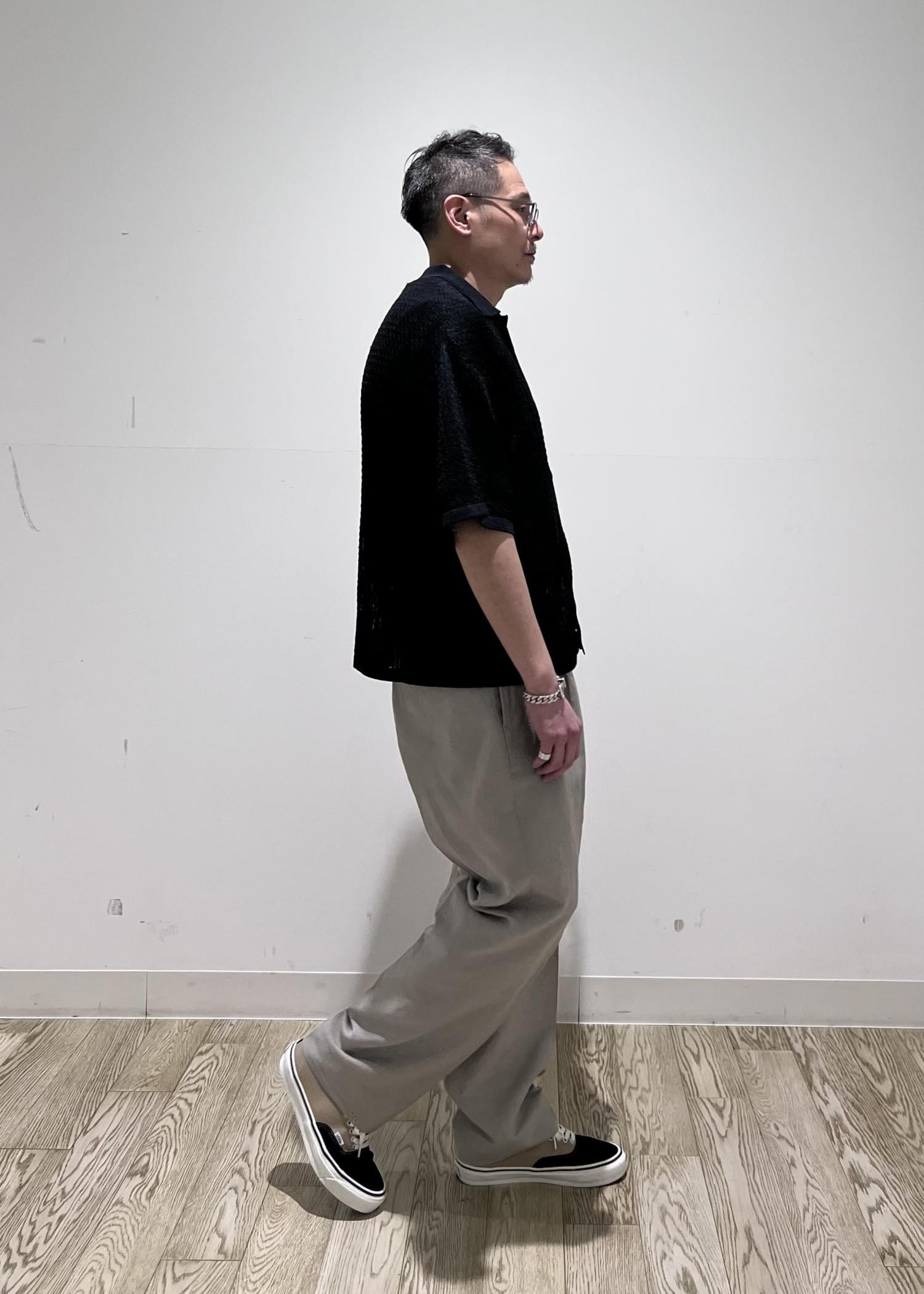 ホワイト系のボトムとのモノトーン、ワイドのシルエットでモダンに仕上がるようにスタイリングしました!