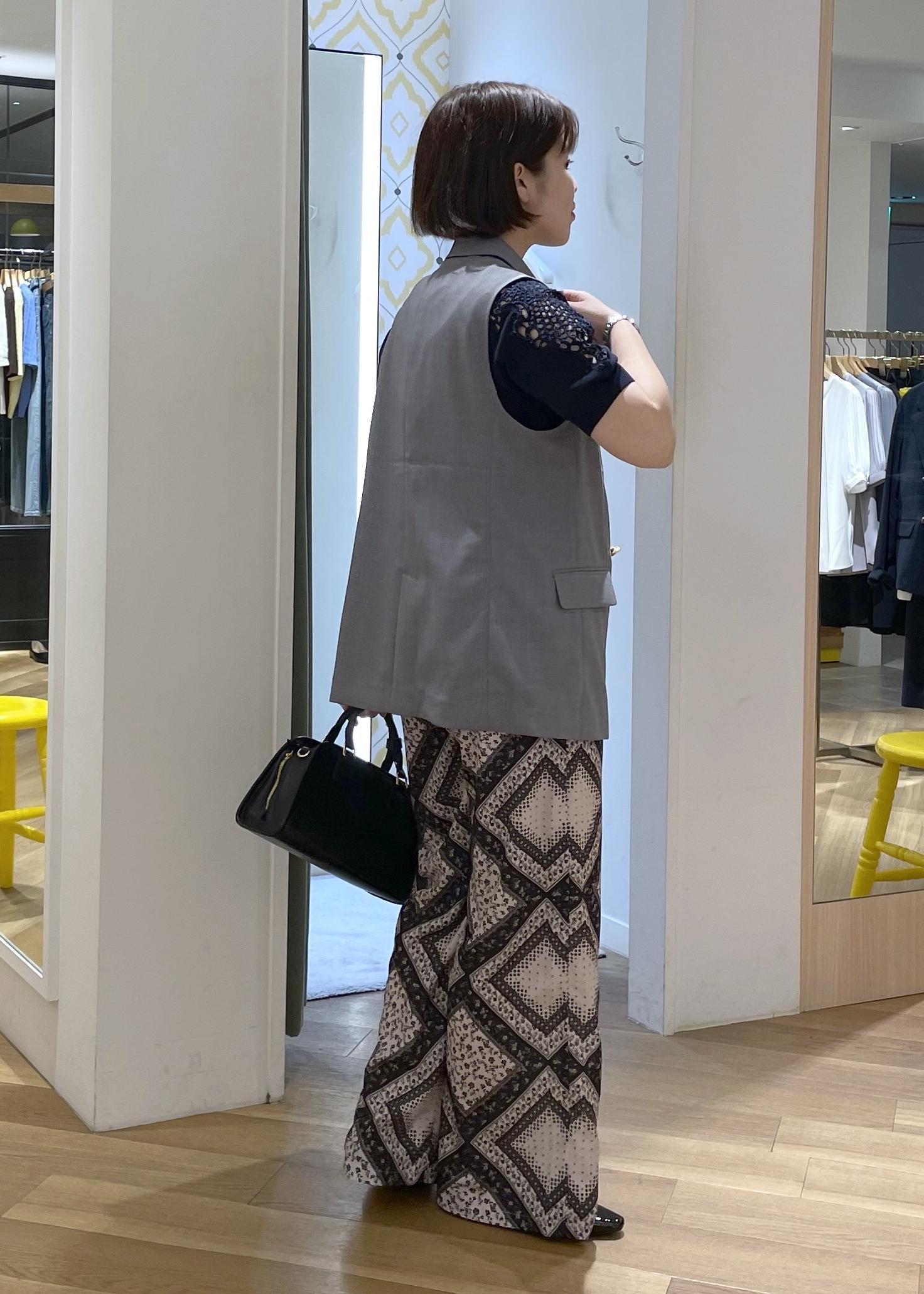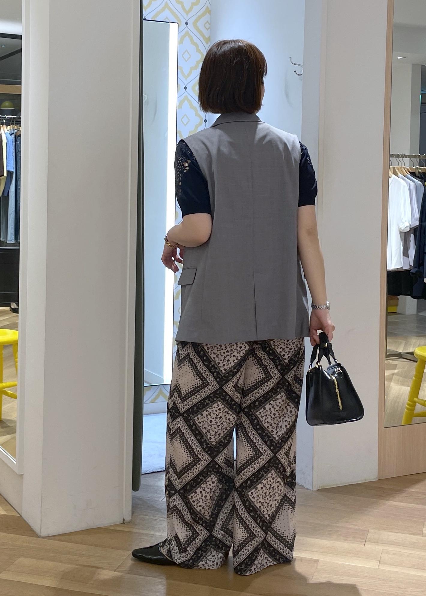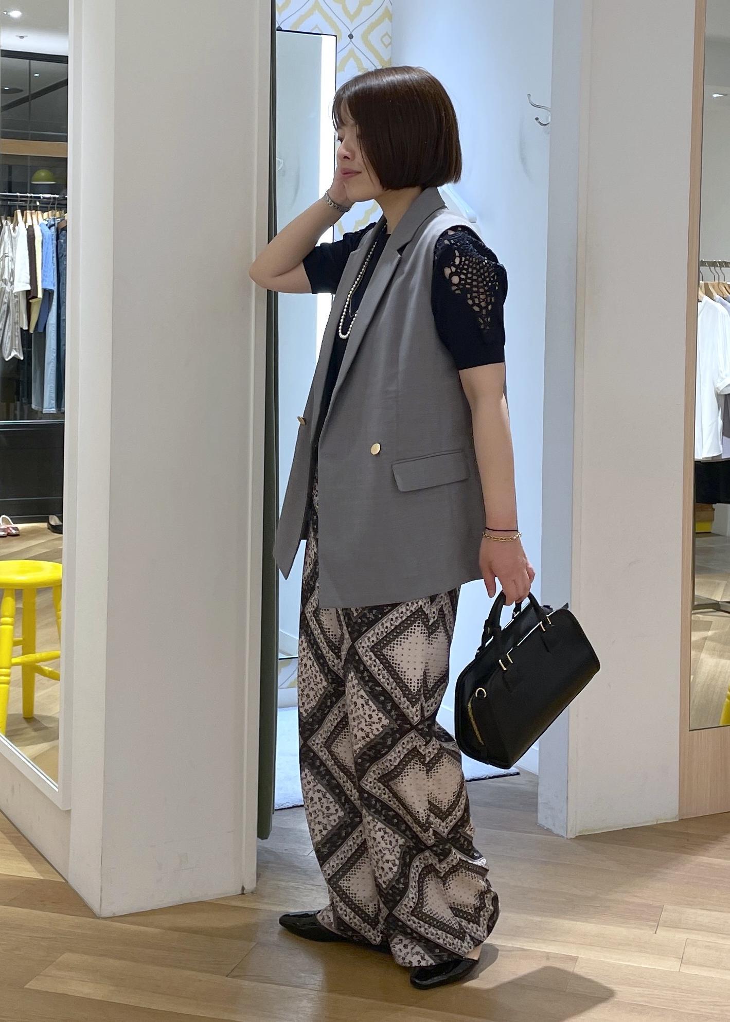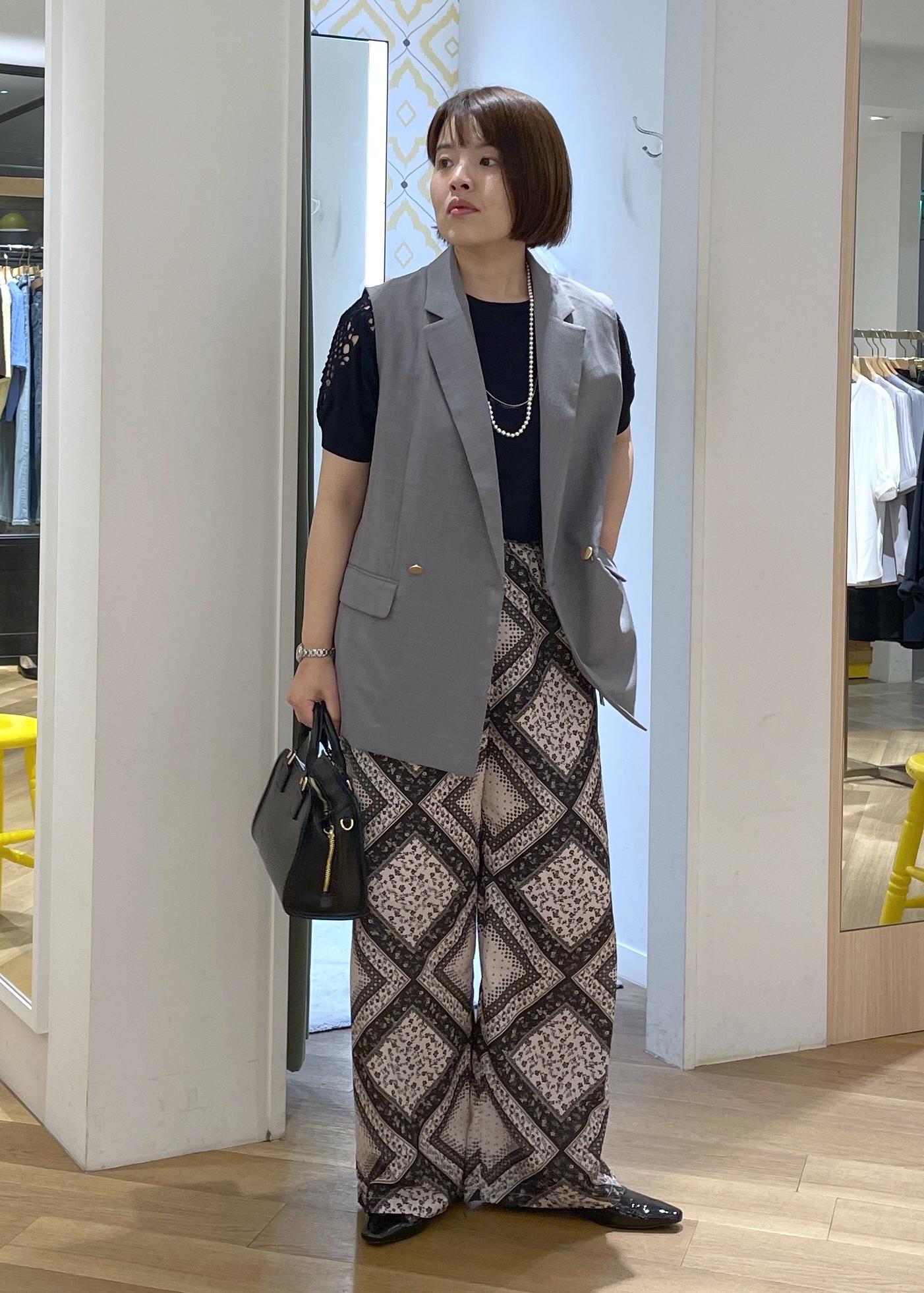 夏っぽさを演出できるスカーフ柄のワイドパンツに、グレーの麻調ジレを合わせた、リラックス感もあるきれいめコーデです!