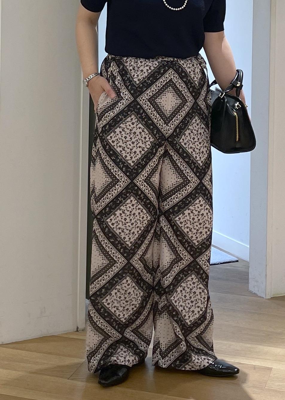 2BUY10%OFFROPÉ PICNICスカーフ柄イージーパンツブラック / M¥6,996レビューさらりとした薄地の生地で、肌離れも良く夏も着やすいパンツです。ウエストはゴム仕様でリラックス感のある履き心地です。全面のスカーフ柄がコーディネートのアクセントになります。今回はMサイズ着用で、着丈はフラットシューズだと地面に擦りそうな長さでした。シルエットもルーズな雰囲気で合わせて頂けるサイズ感です。