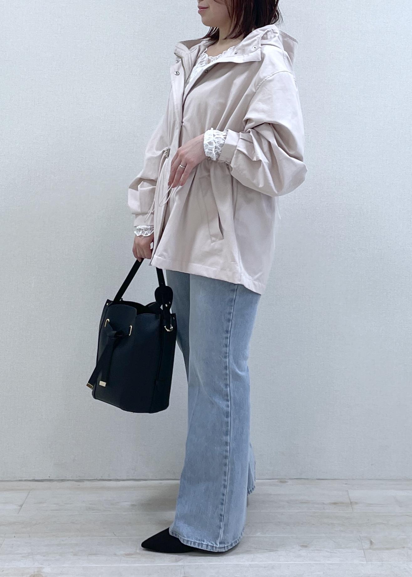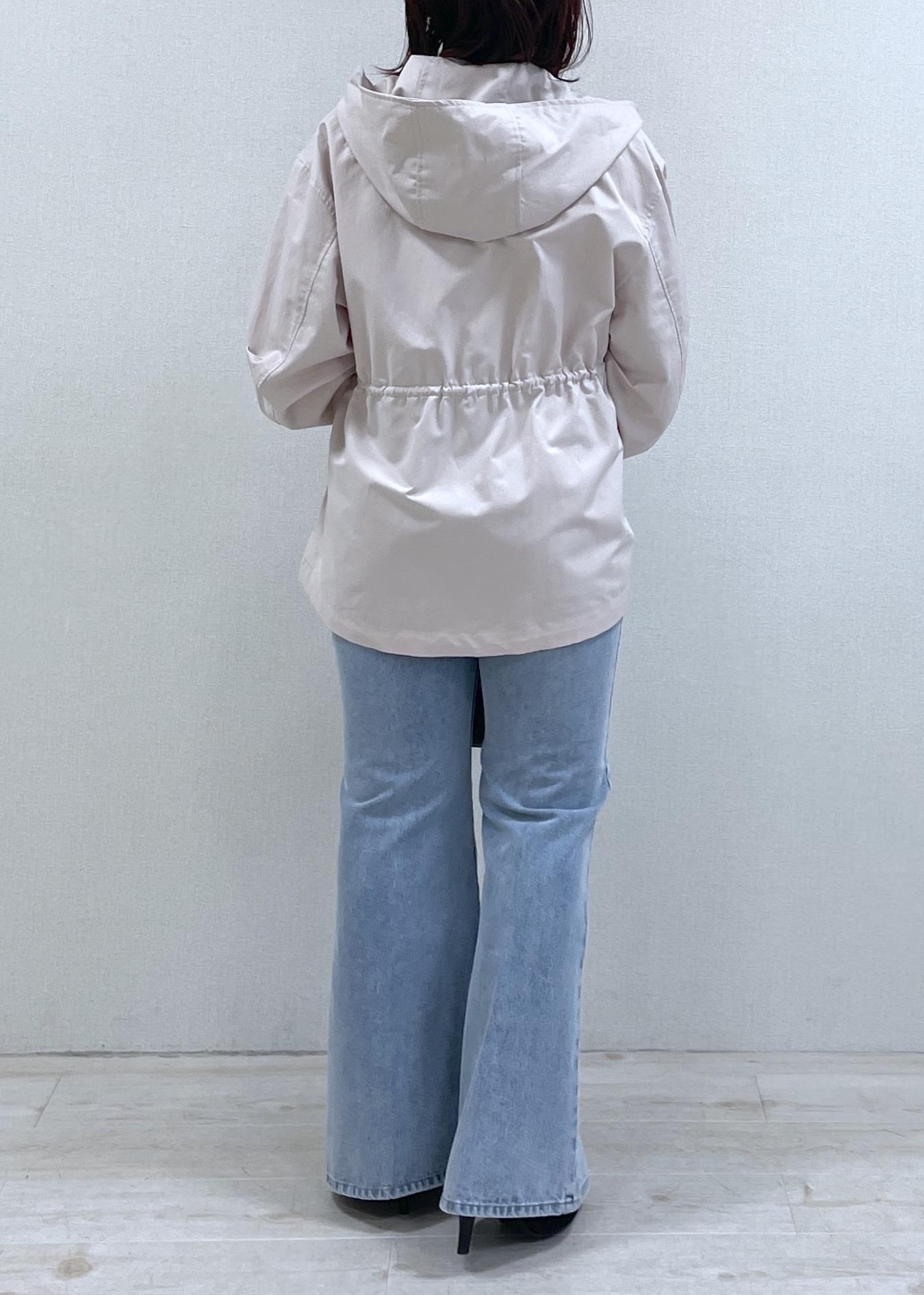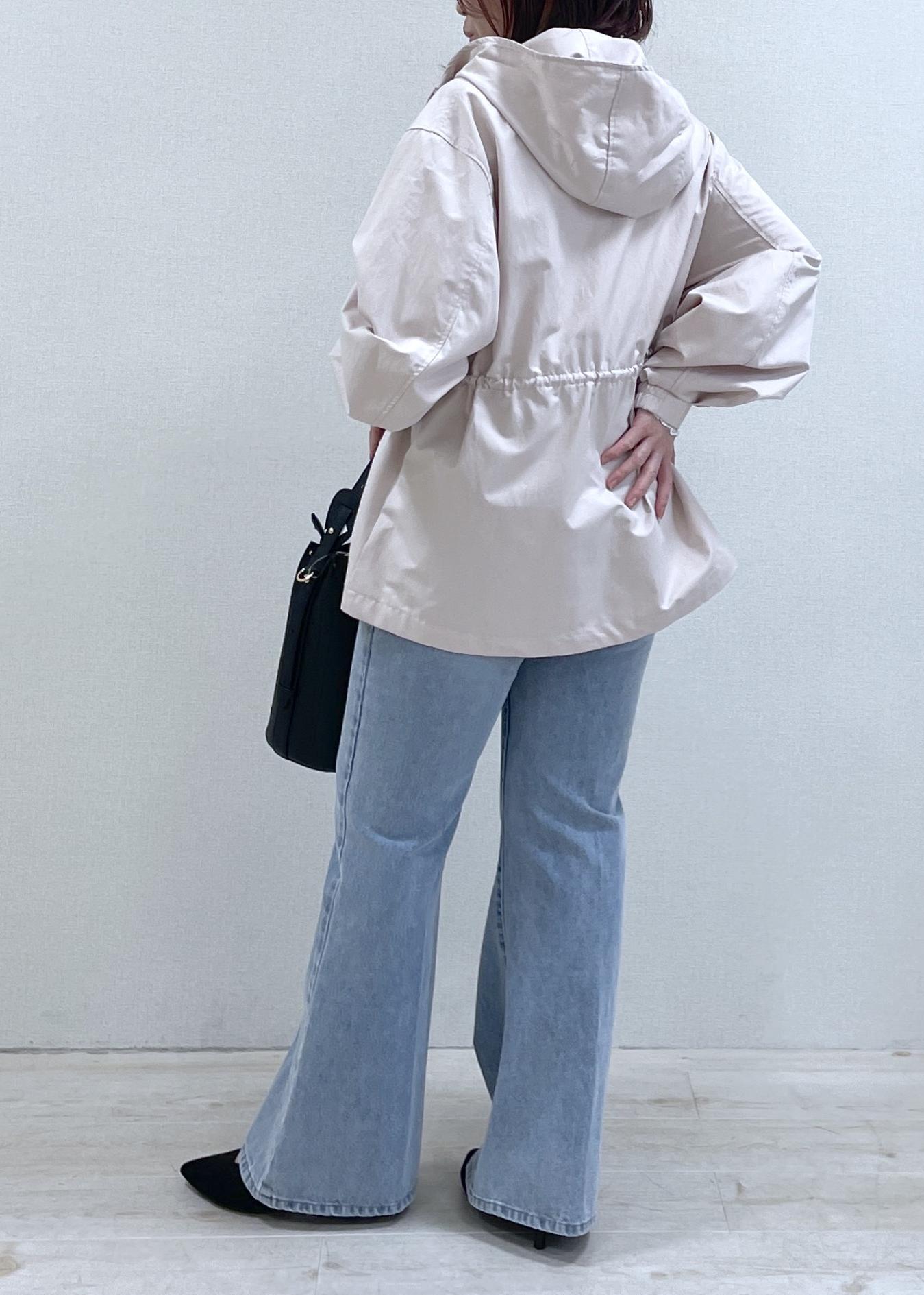 ウエストに絞りがついている形の綺麗なマウンテンパーカーにデニムを合わせて綺麗めカジュアルコーデにしました!