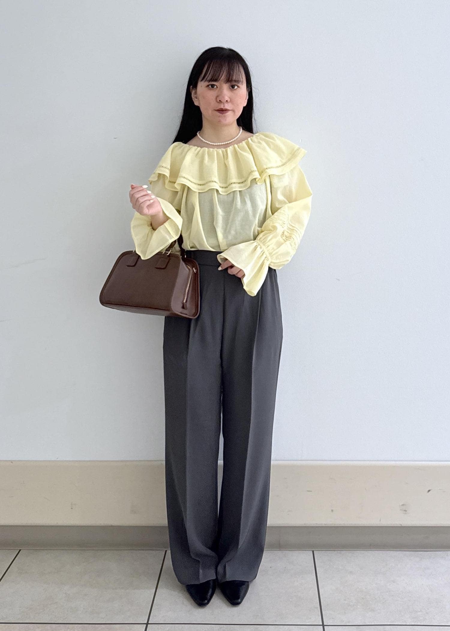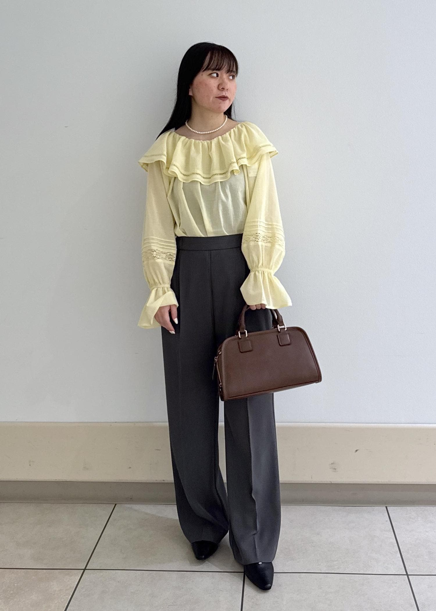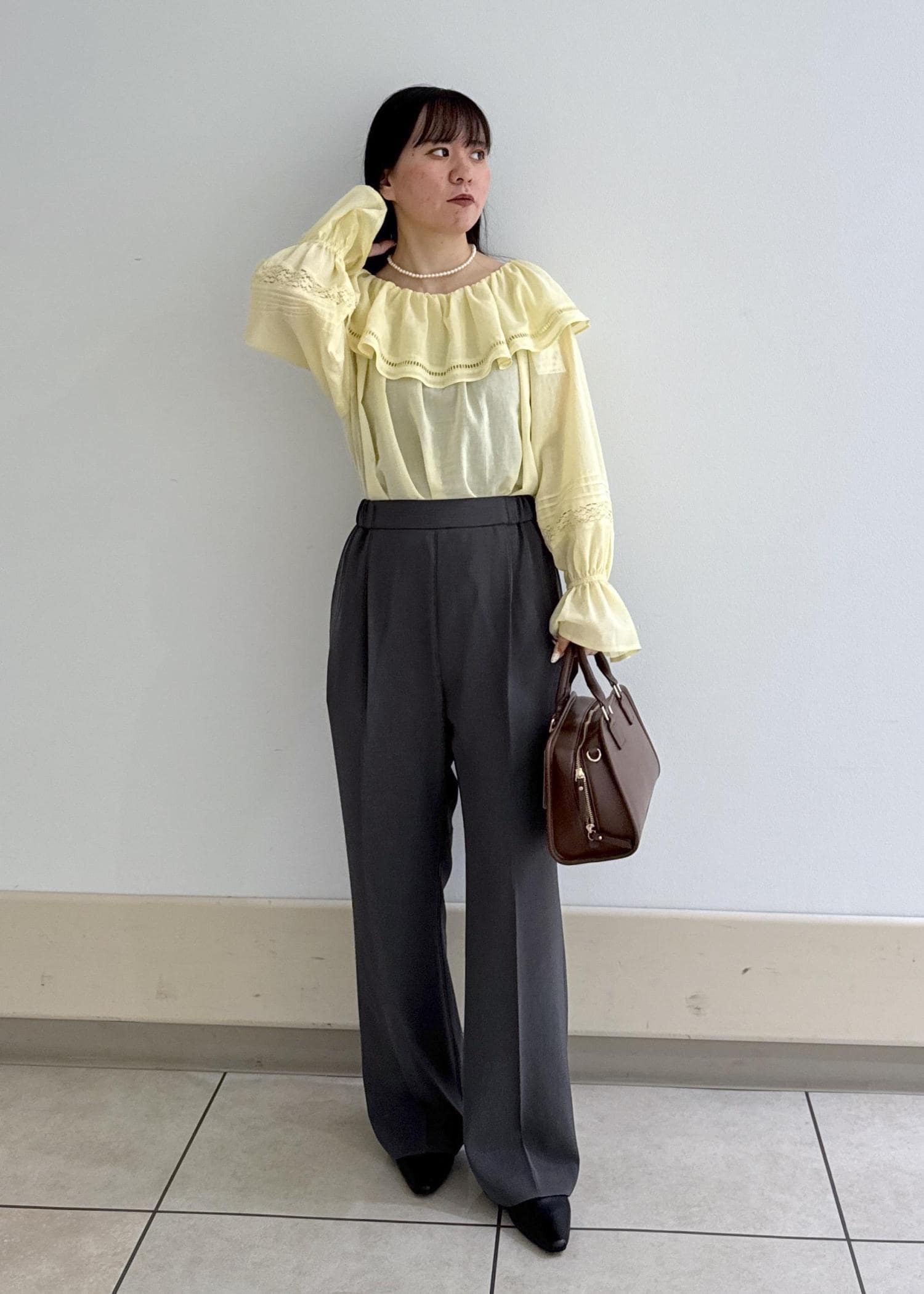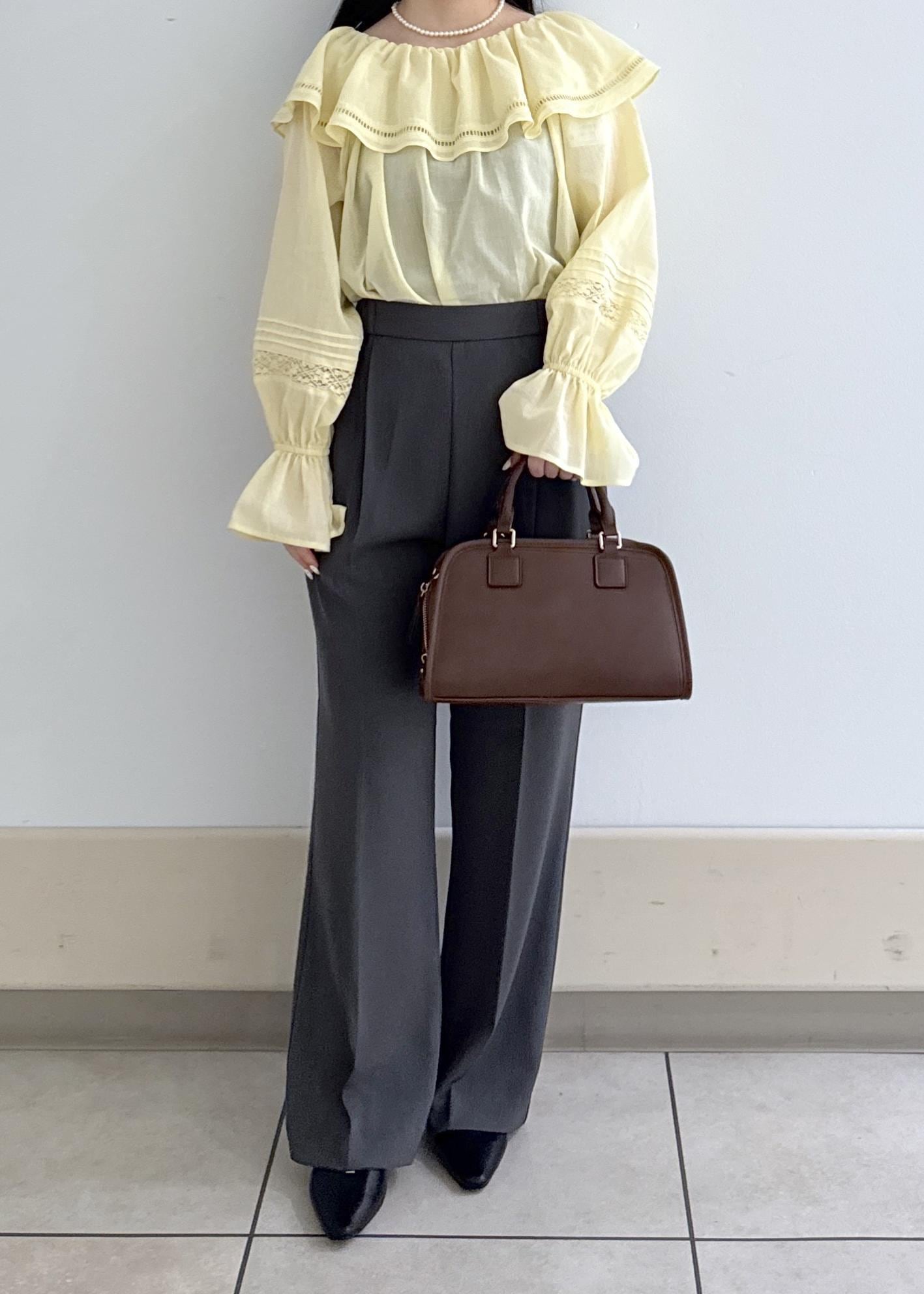 イエローの春らしいデザインのトップスに、ブラウンのバックが相性抜群です!