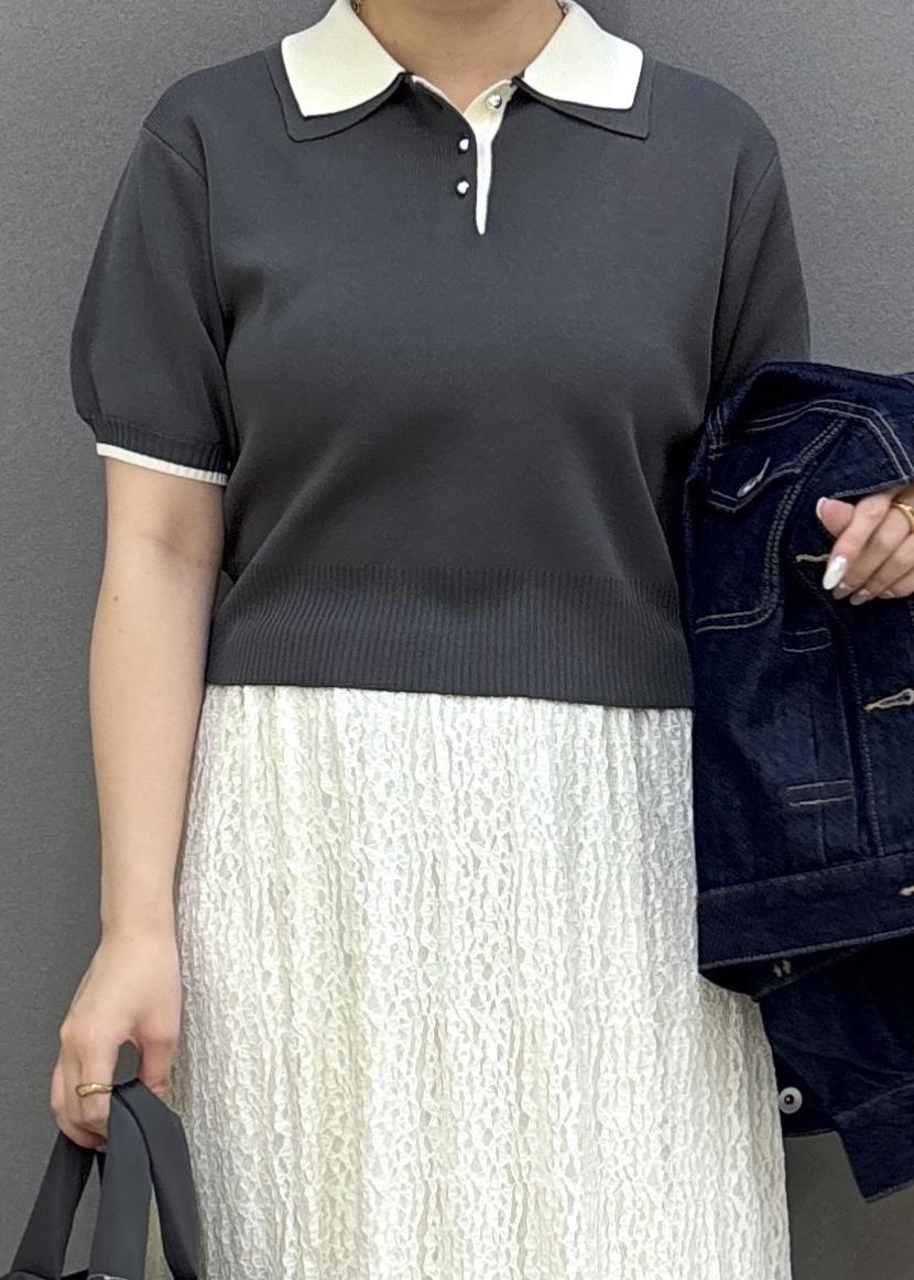 NEW!VISダブルカラー半袖ポロニットトップス/イージーケア・WEB限定カラーグレー / F¥5,489レビュー160㎝だと腰回りはしっかり隠れる長さ。