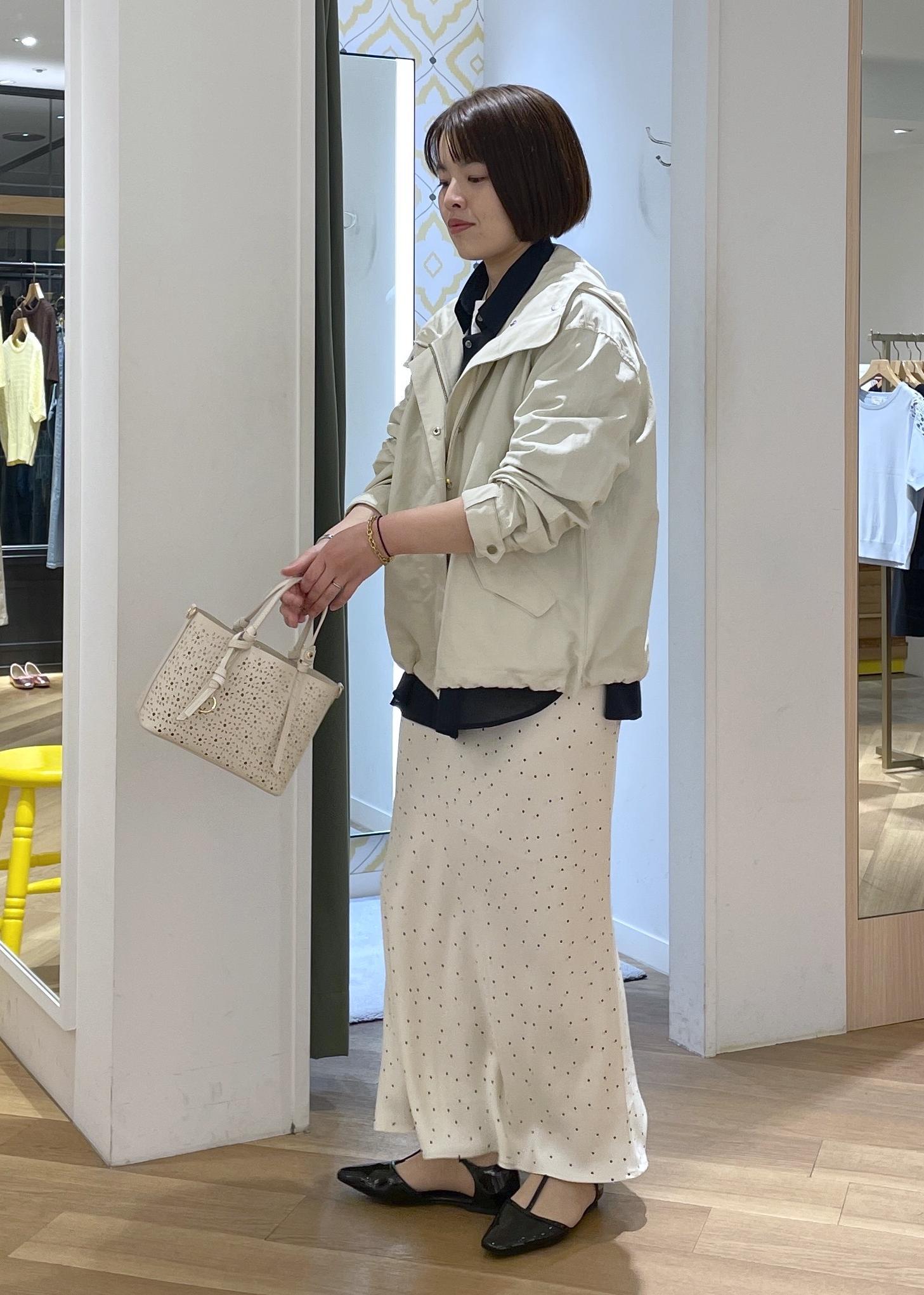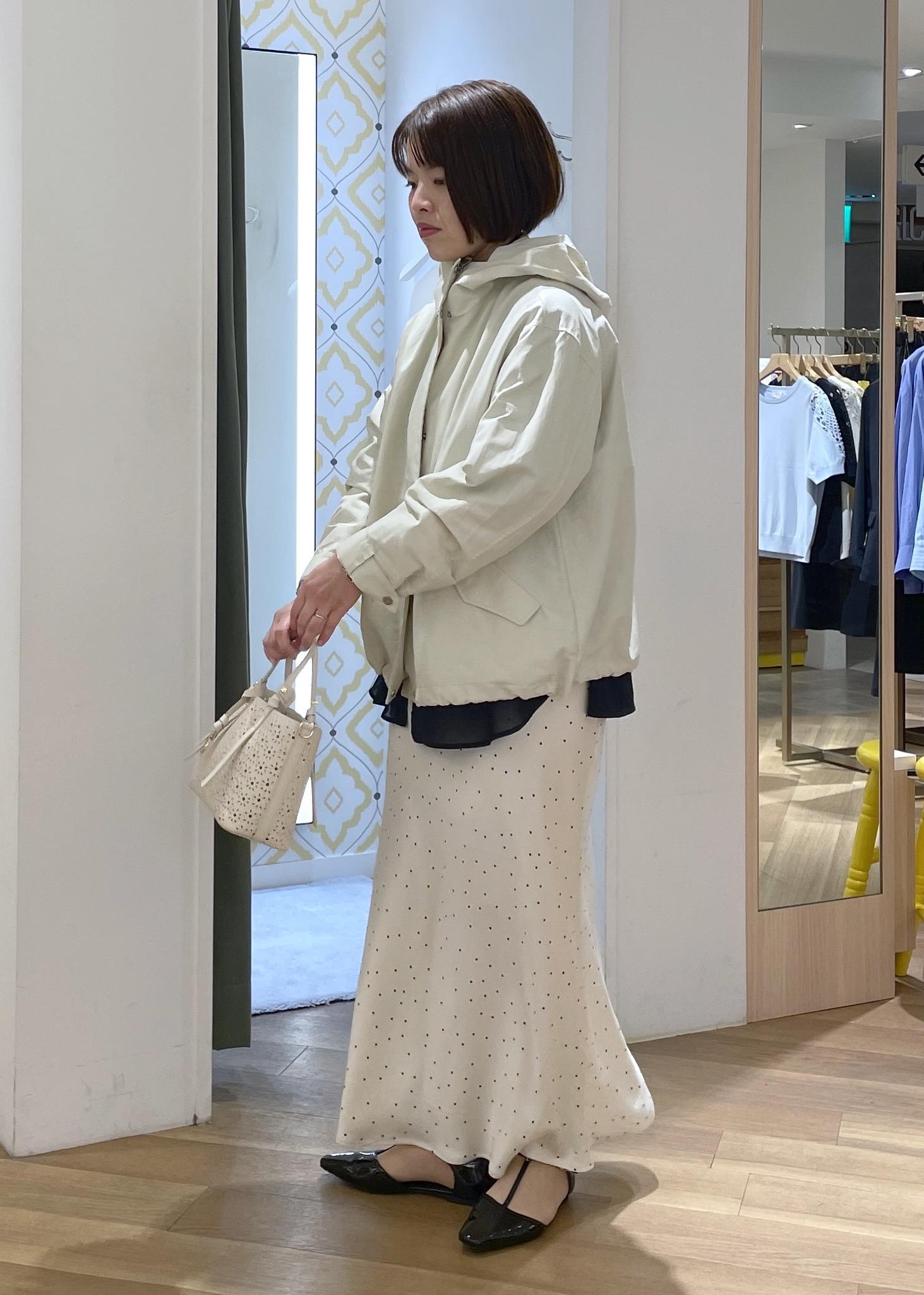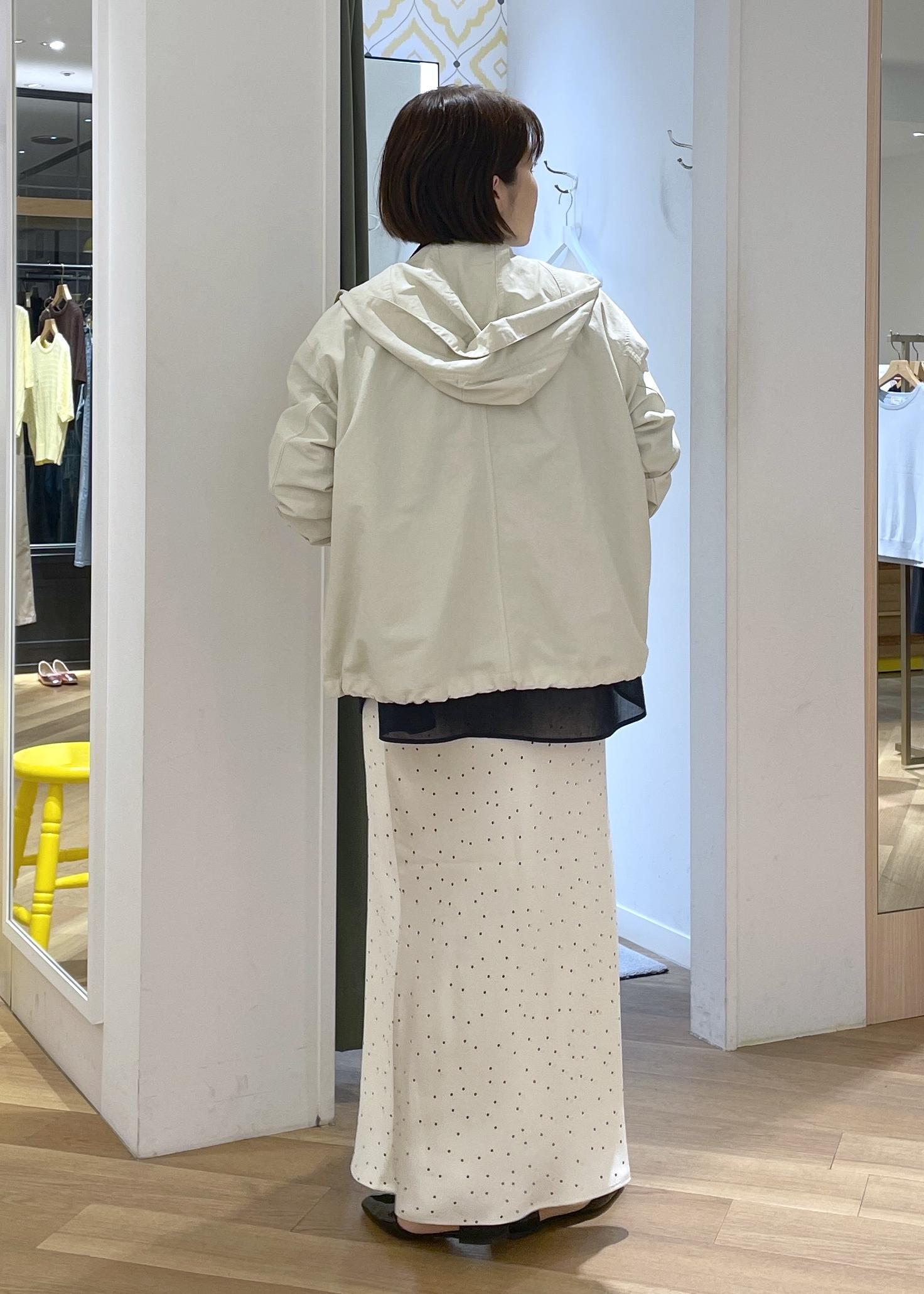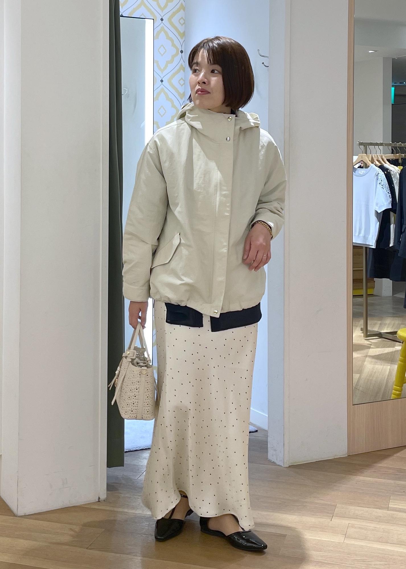 カジュアルなマウンテンパーカーにドット柄のロングスカートを合わせた、フェミニンなカジュアルコーデです!