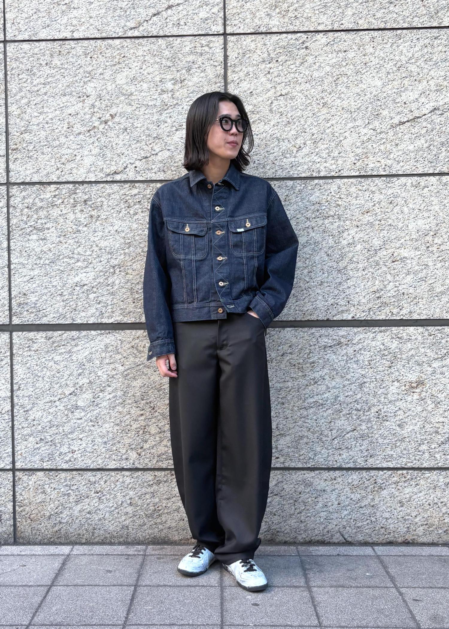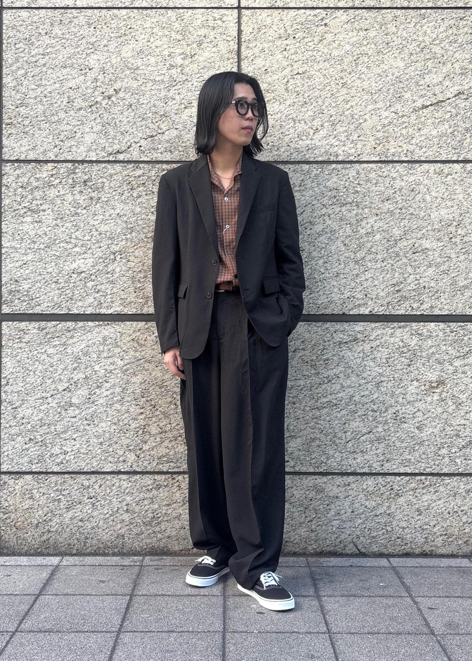 インナーにはチェックシャツを挟み、少しカジュアルダウンさせたスタイリングです。