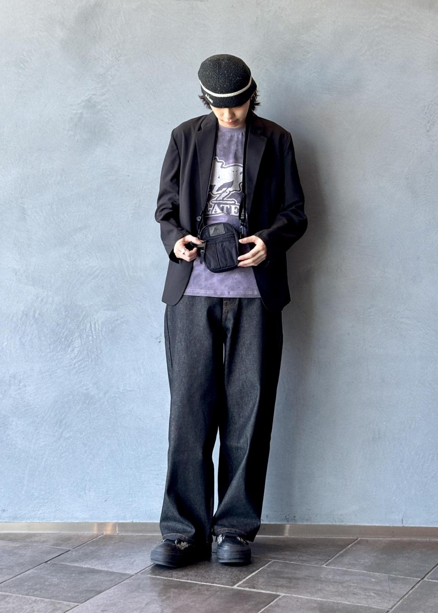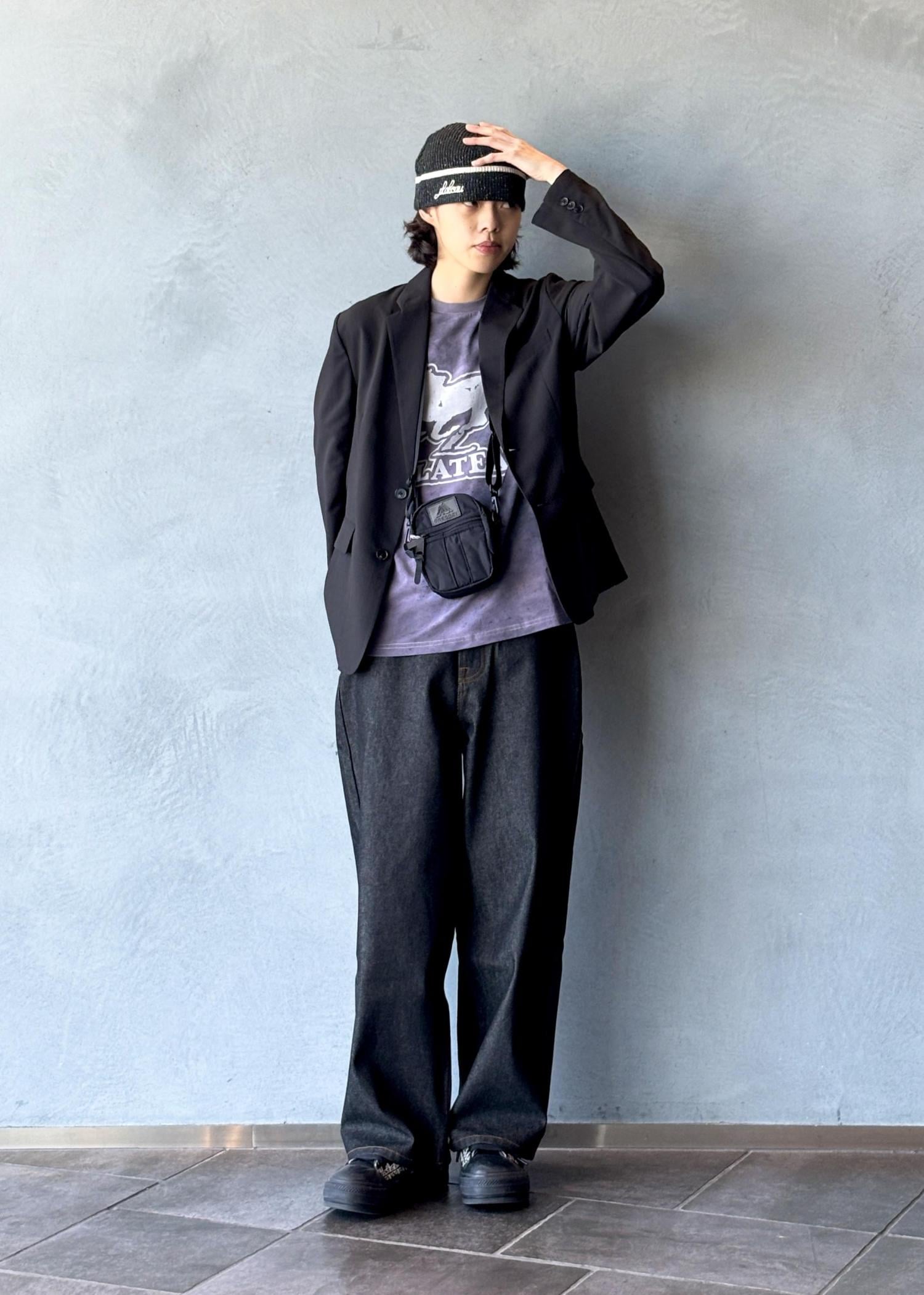 インナーにはPLATEAU STUDIOのグラフィックTを合わせ、程よくカジュアルダウン。ボトムスにはWALKINPARISのバギーデニムを取り入れることで、リラックス感とストリートのニュアンスをプラスしています。