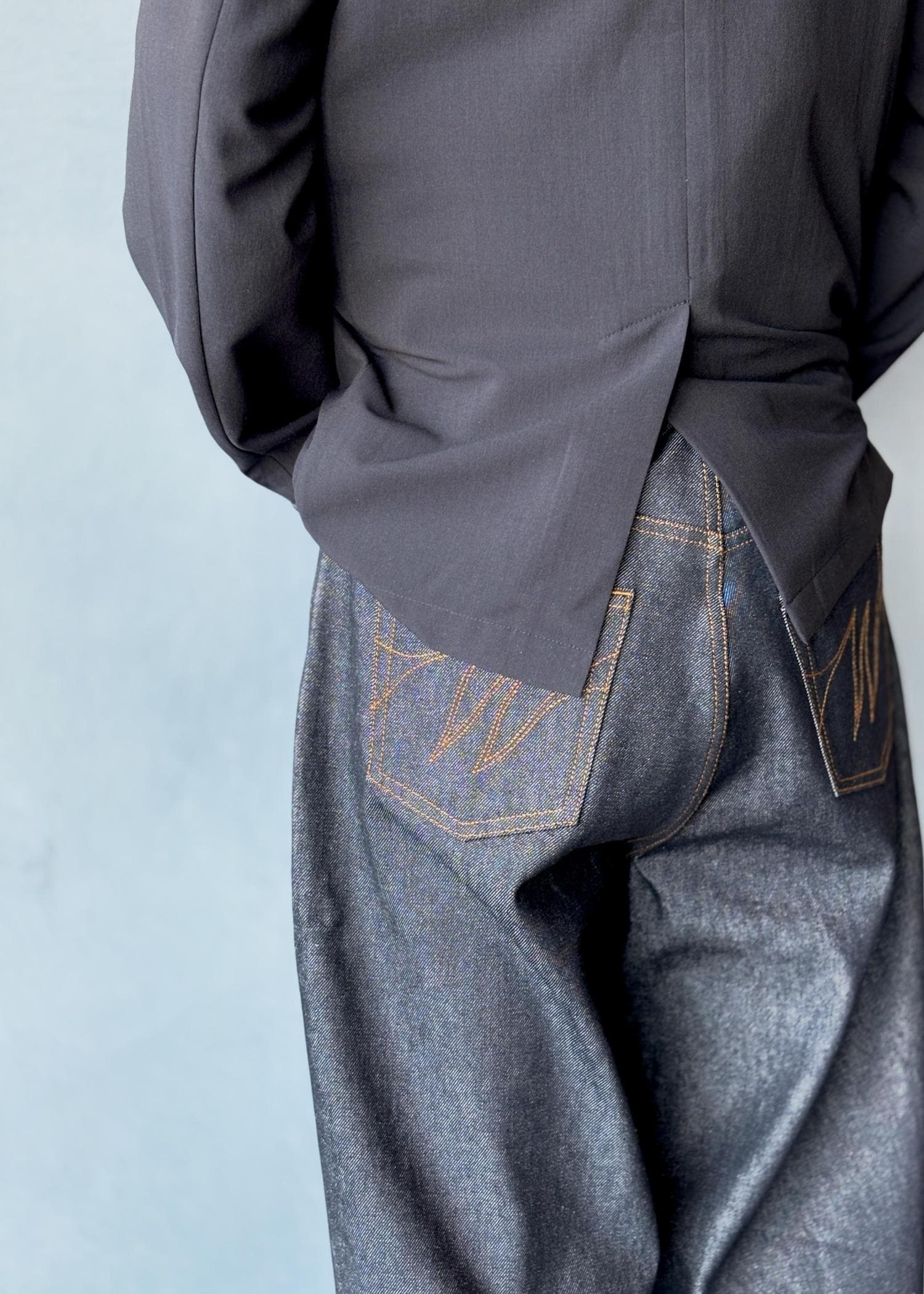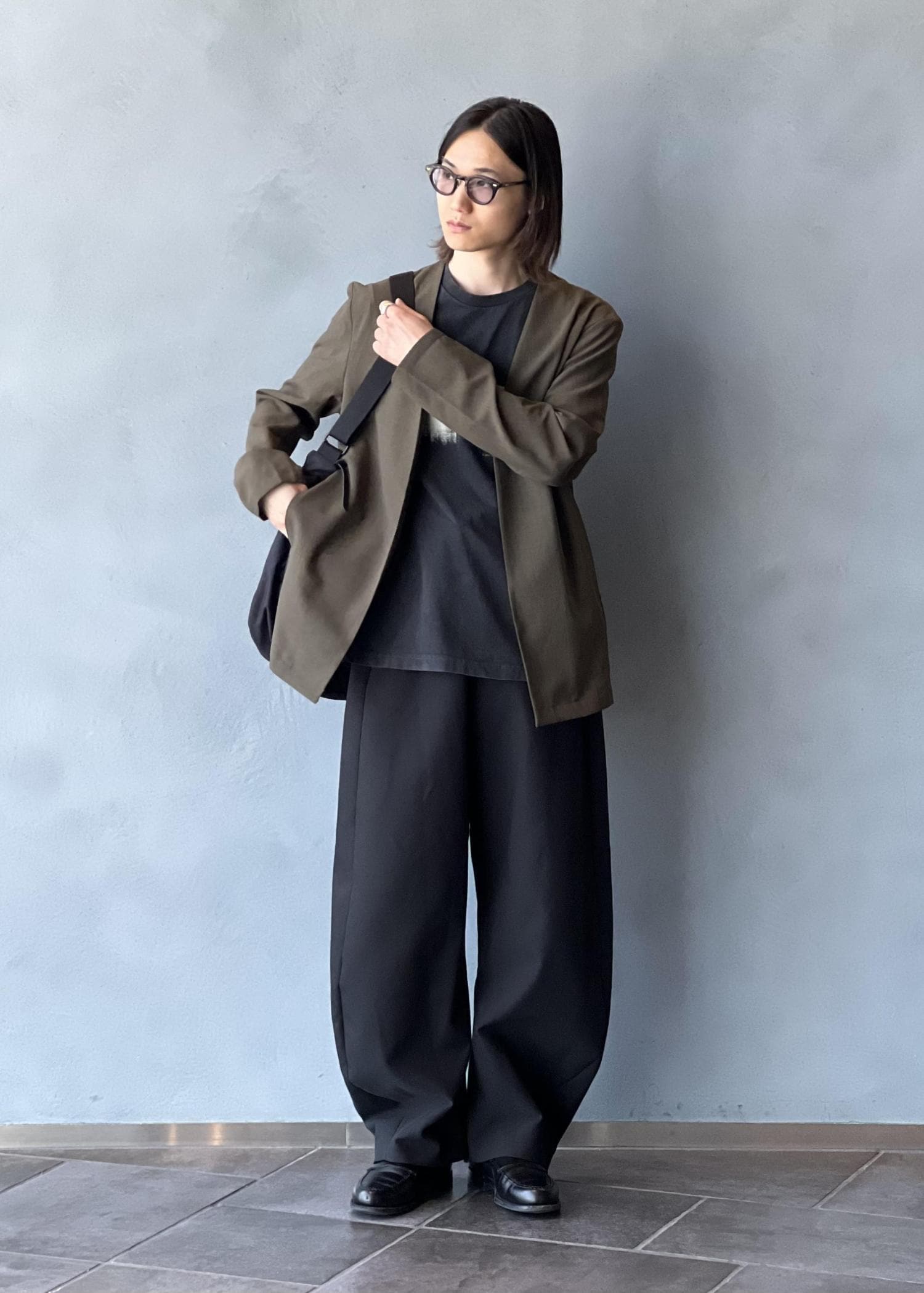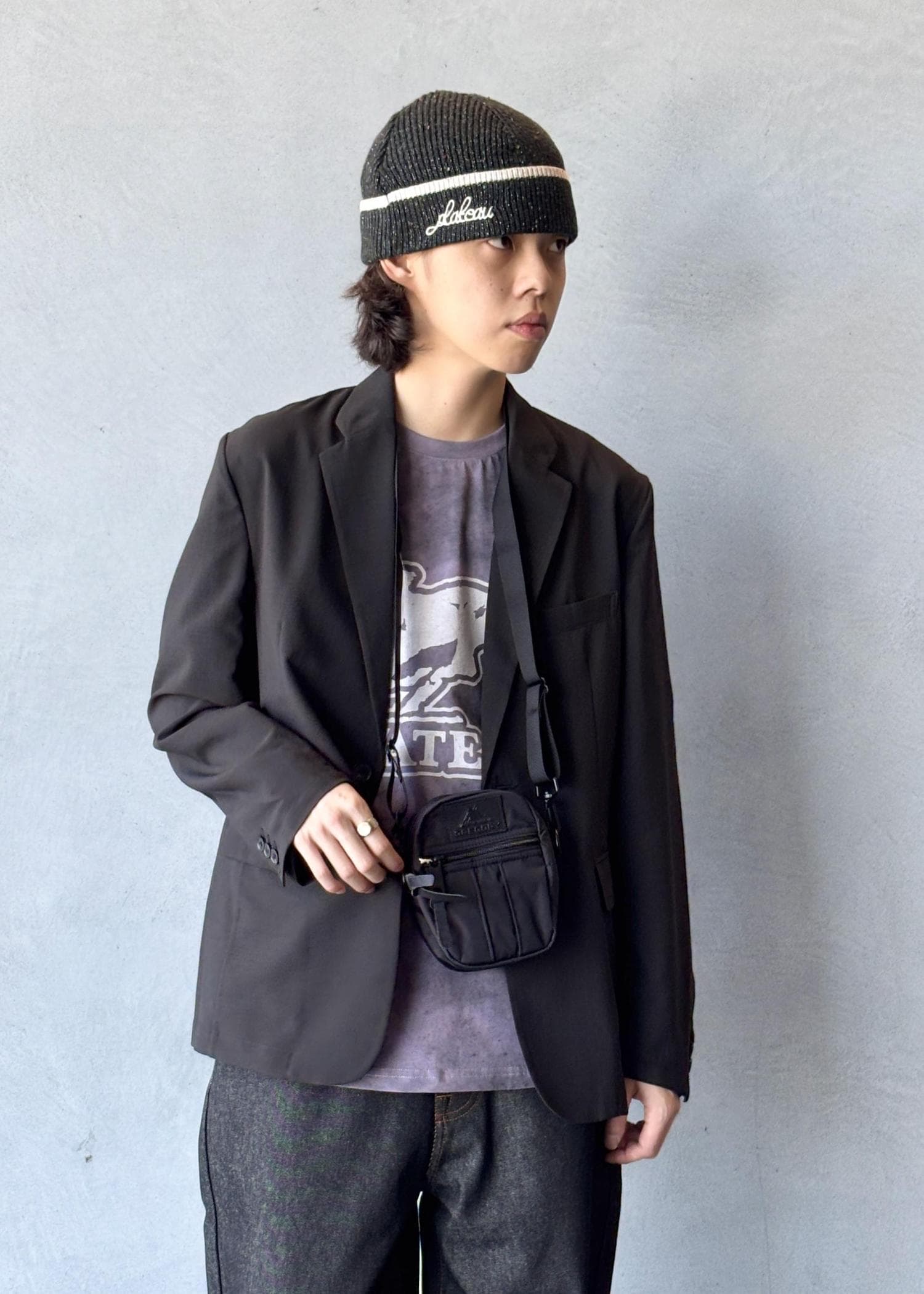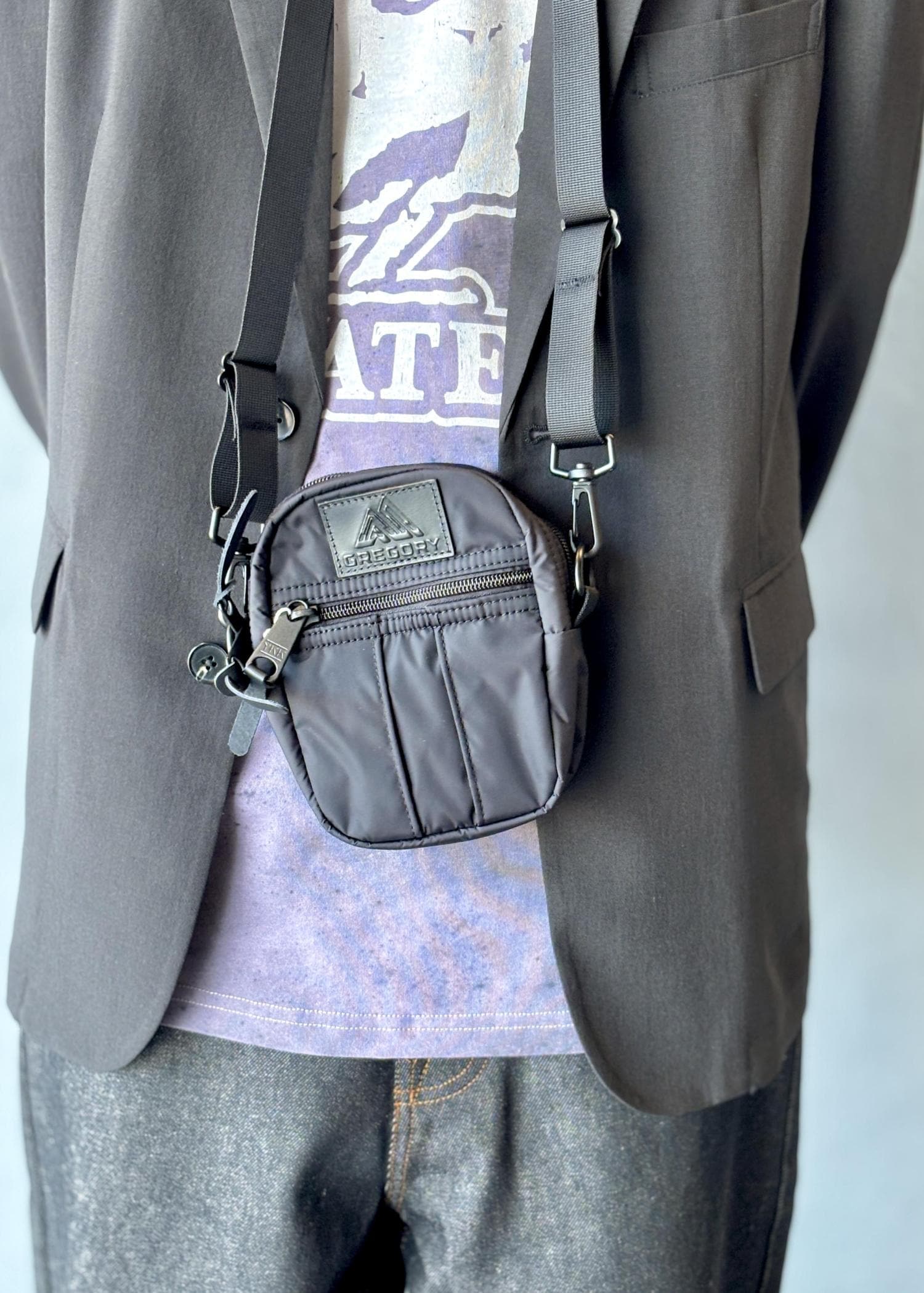 さらに、GREGORYとの別注バッグをアクセントに。ブラックレザー仕様のネームや、パーツを金具に変更したディテールなど、細部までこだわり抜かれたデザインが、全体をよりモードでアーバンな印象へと引き上げています。