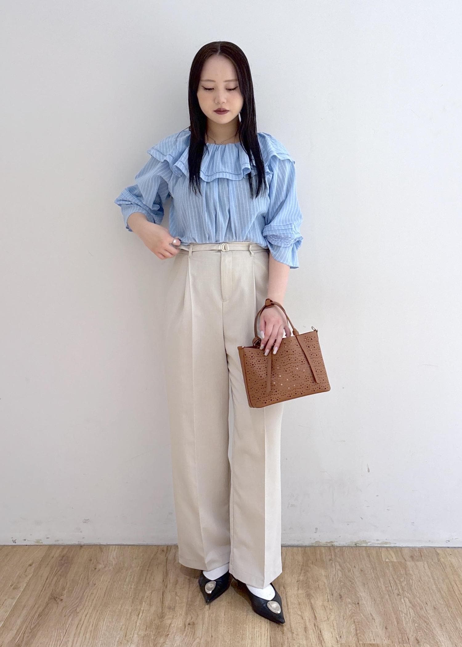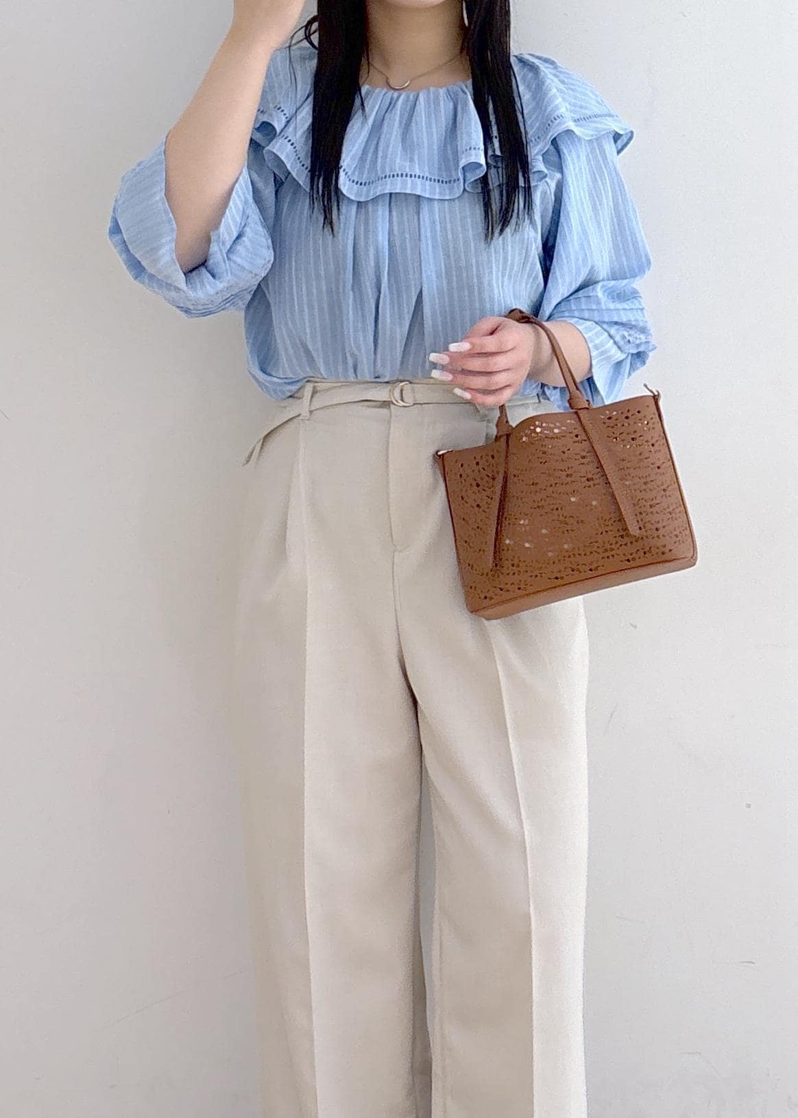 春夏1枚で映えるシアーブラウスとパンツで合わせました!