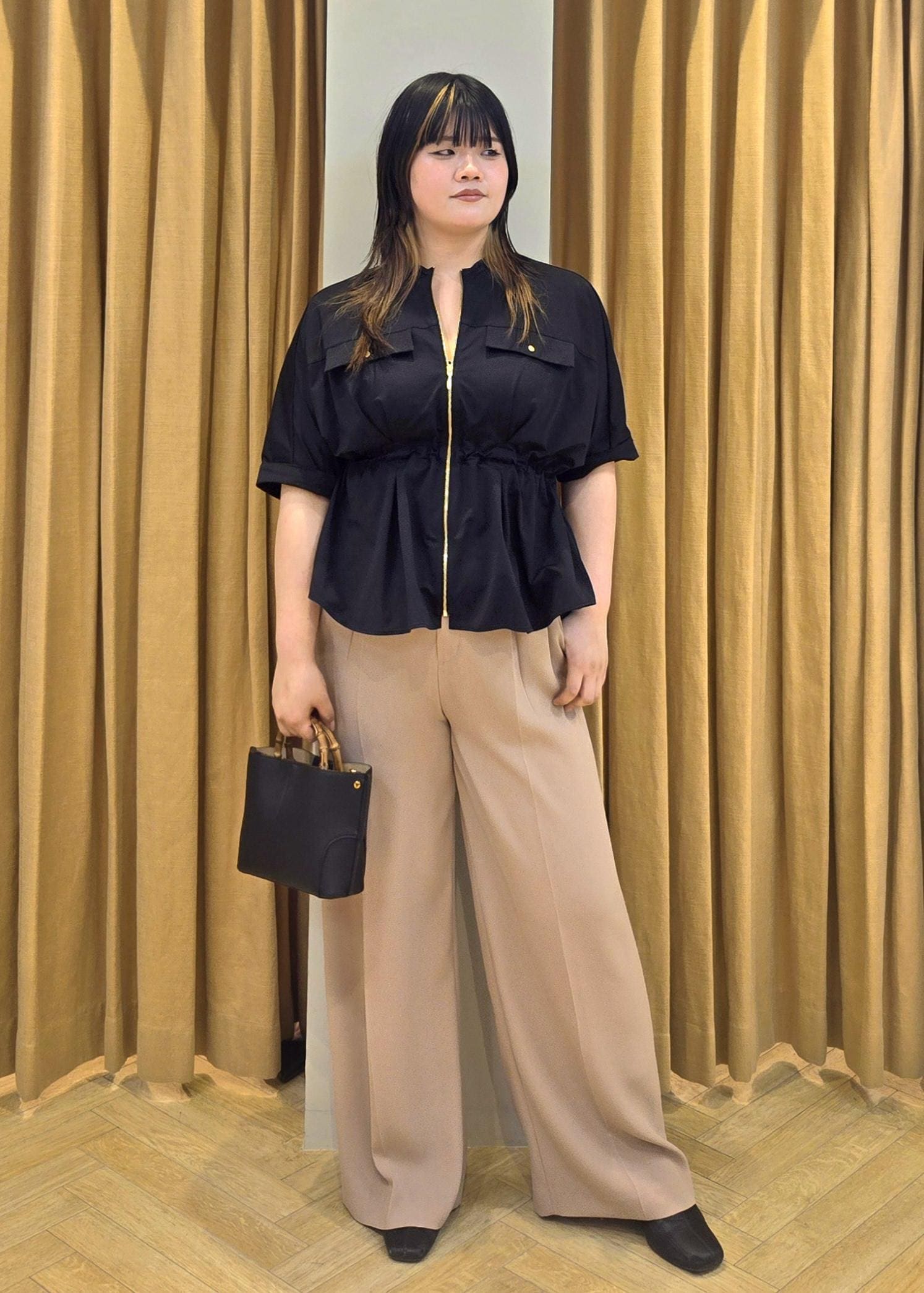 着丈は短めですがフワッとしたシルエットがスッキリ見えますよ。 -