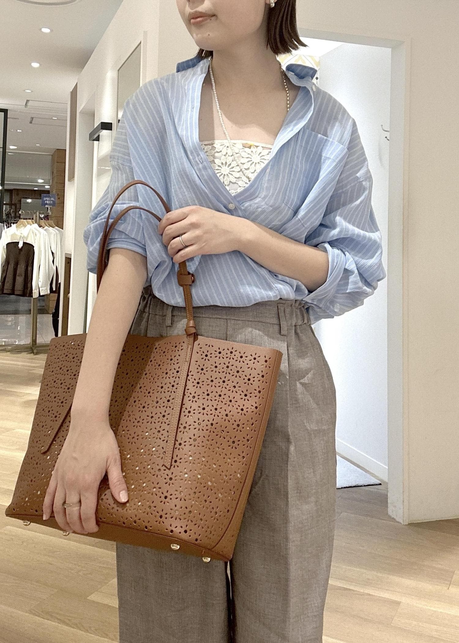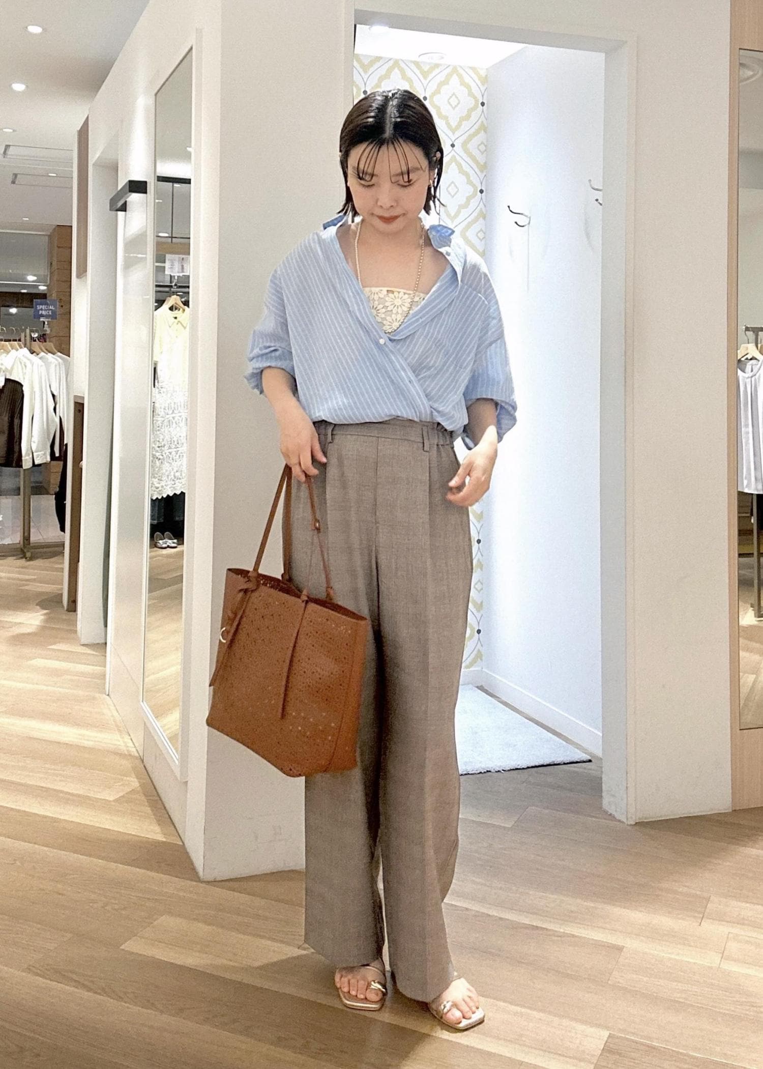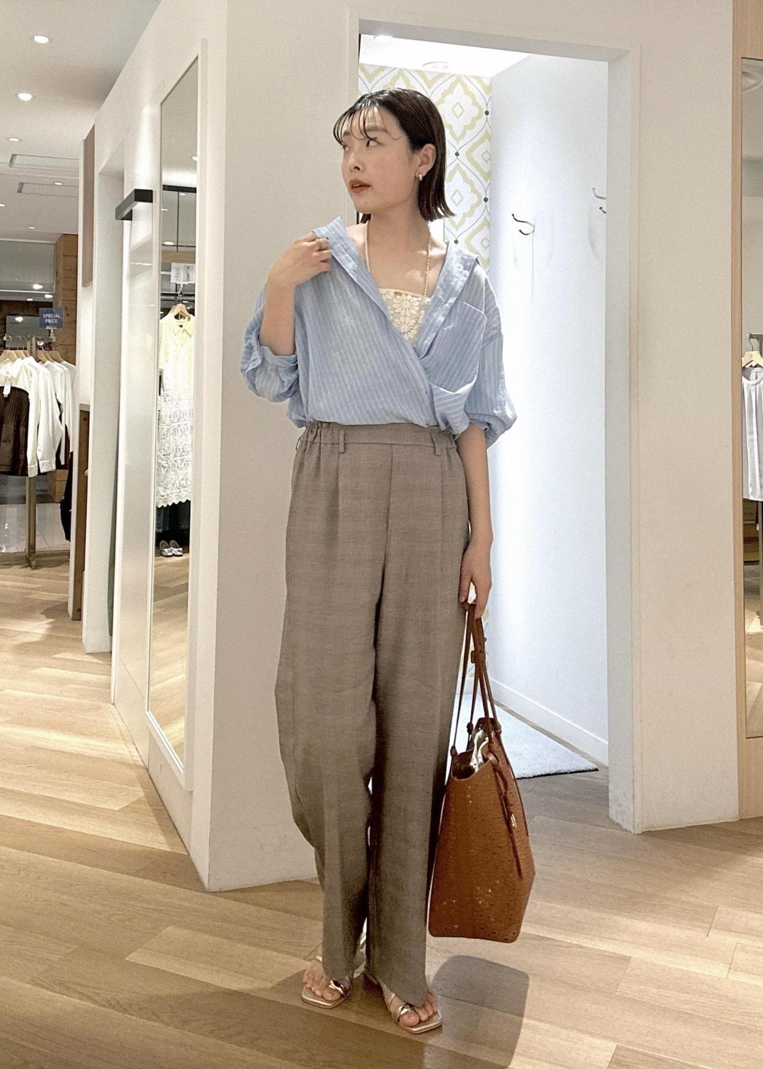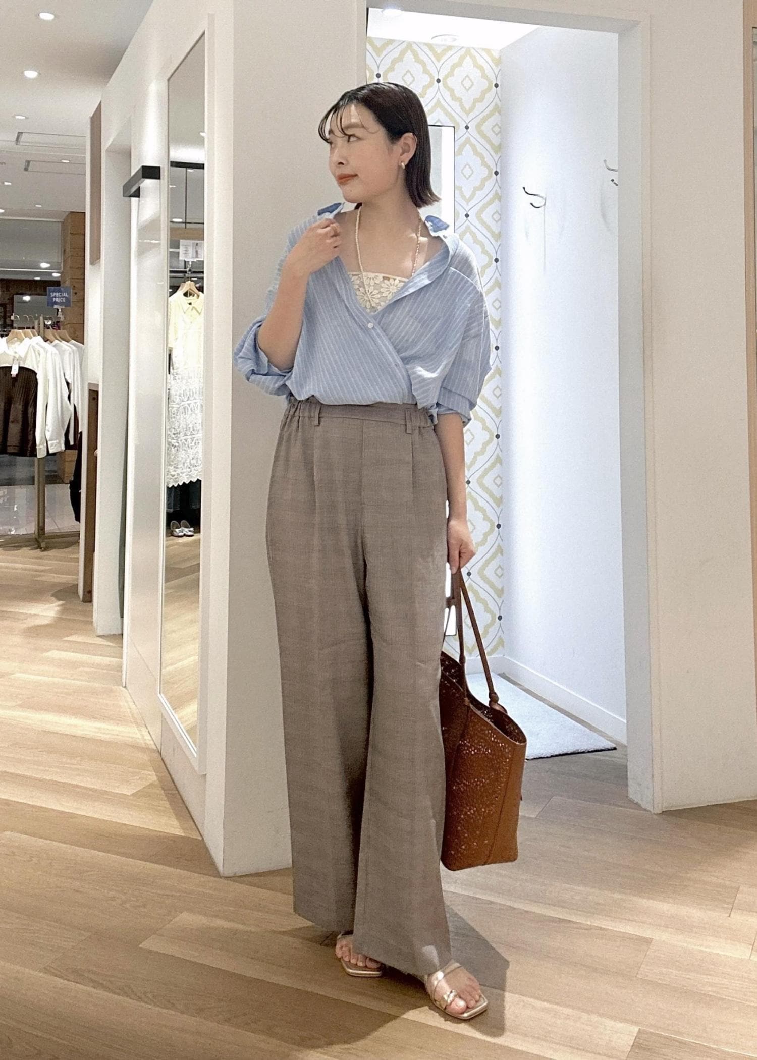 爽やかなストライプシャツを主役に、カシュクール風の着こなしで抜け感をプラス。インナーのレースをちら見せして女性らしさを足しつつ、ワイドパンツでリラックス感ときちんと感を両立。ブラウン小物で全体を引き締めた、大人のバランスコーデ。