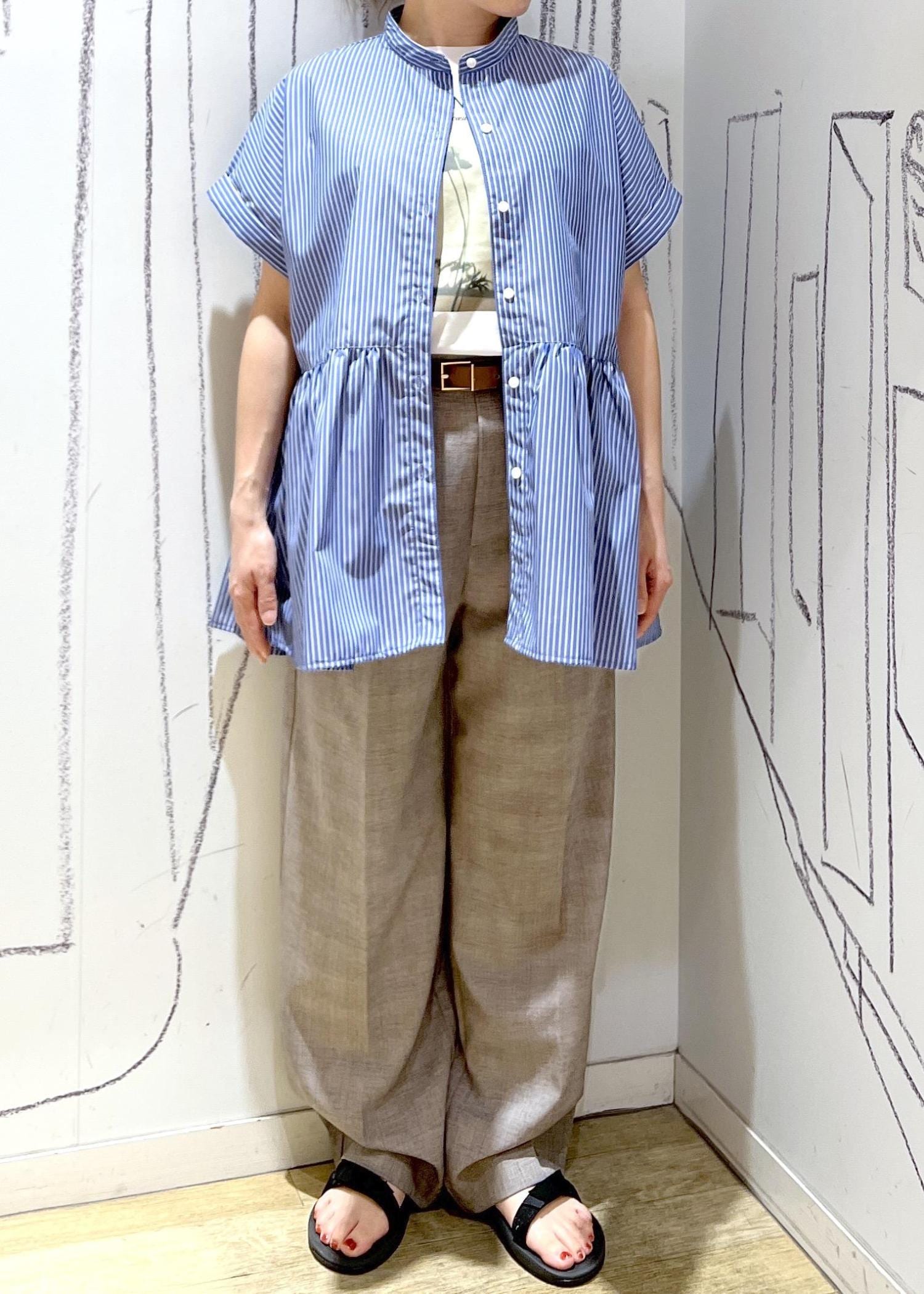 シワになりにくい加工が嬉しいペプラムシャツ。147cmでお尻の隠れる着丈です。ウエスト切り替え位置も高くスッキリ一枚着でも◎羽織としても楽しめるこの夏大活躍になること間違えない一枚です!