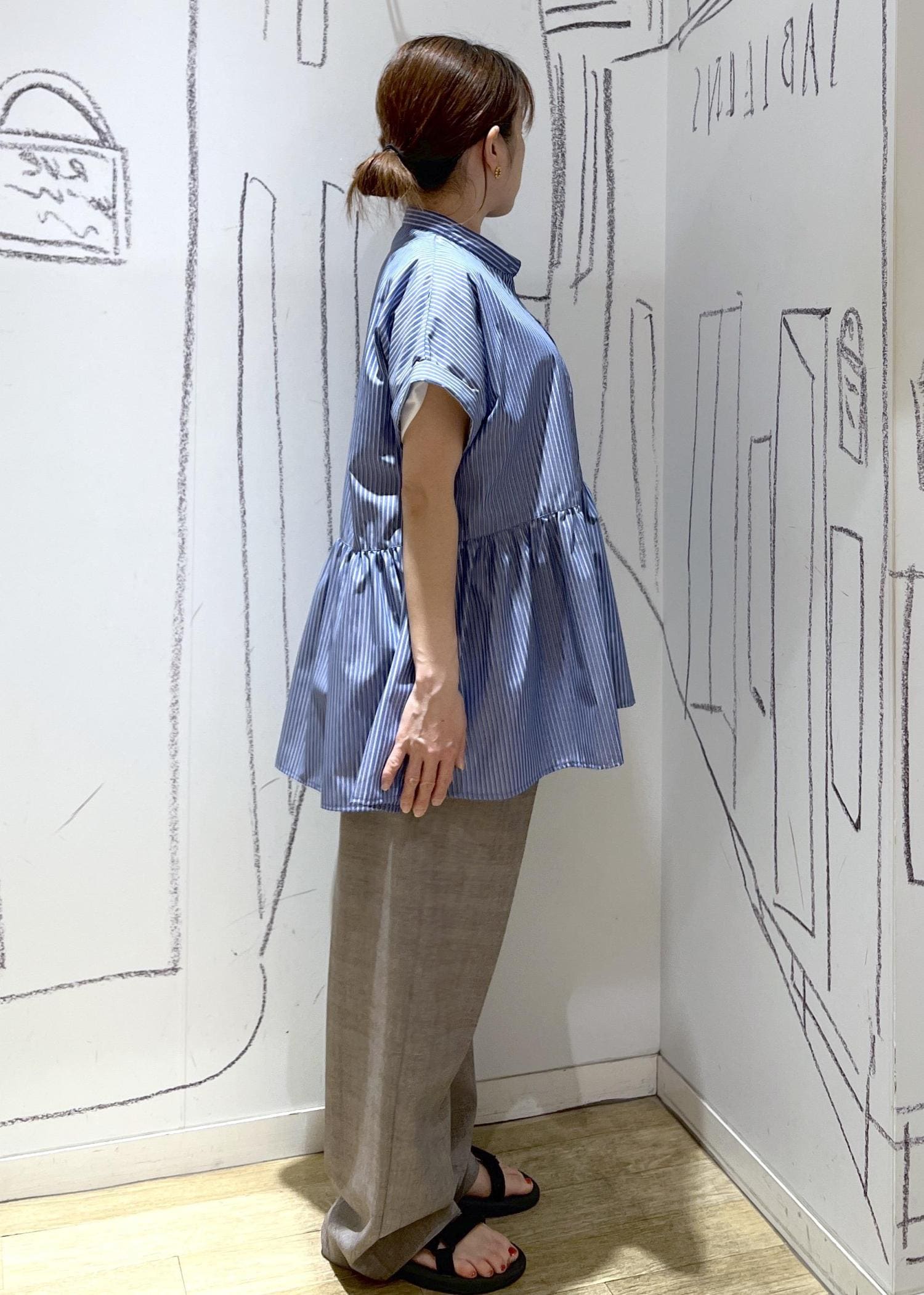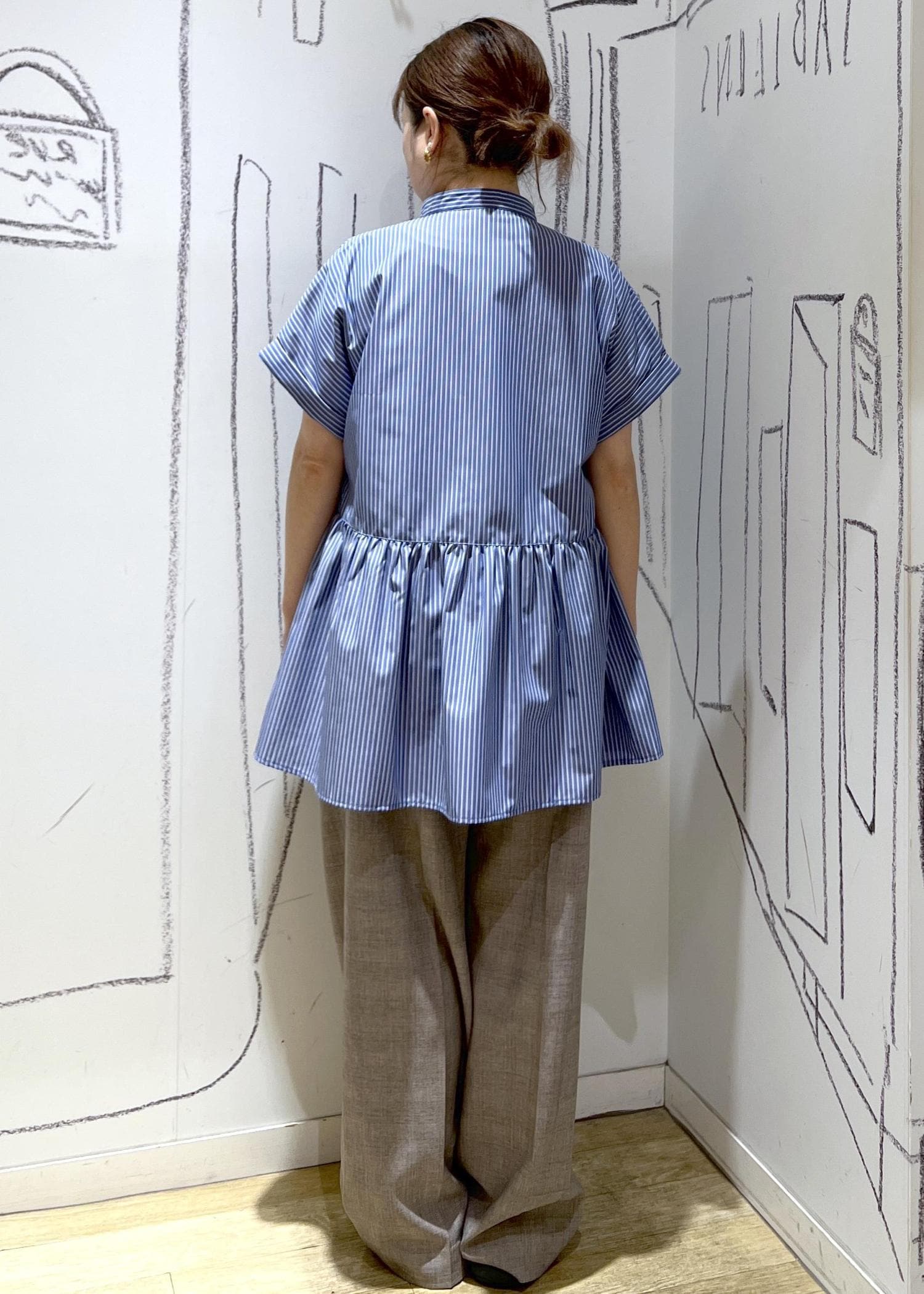 高い位置での切り替えでスッキリ着れるペプラムシャツのコーディネートです!