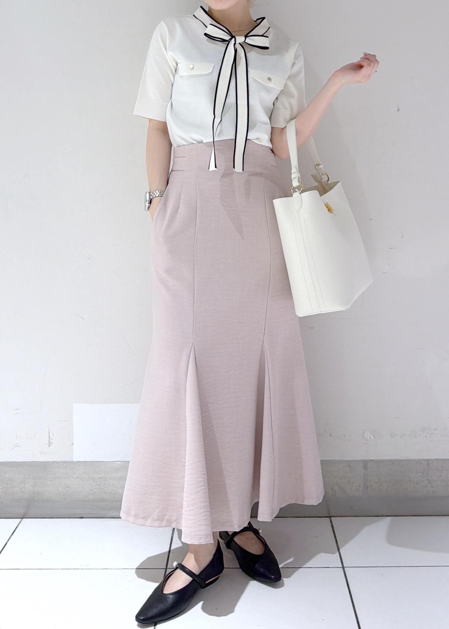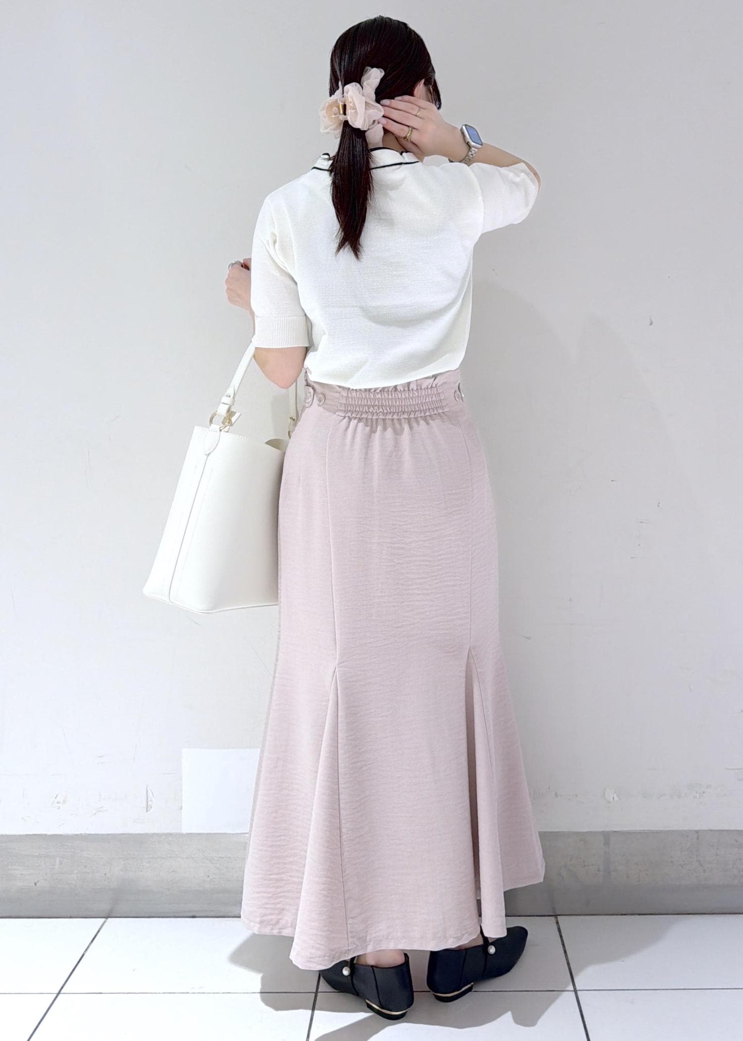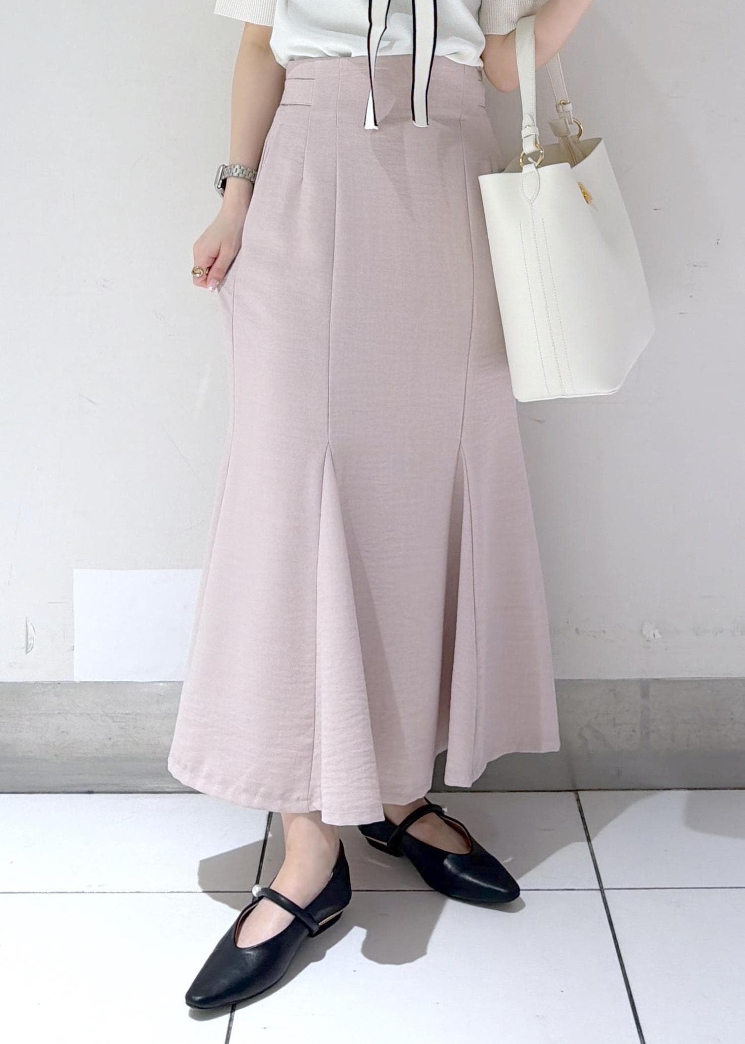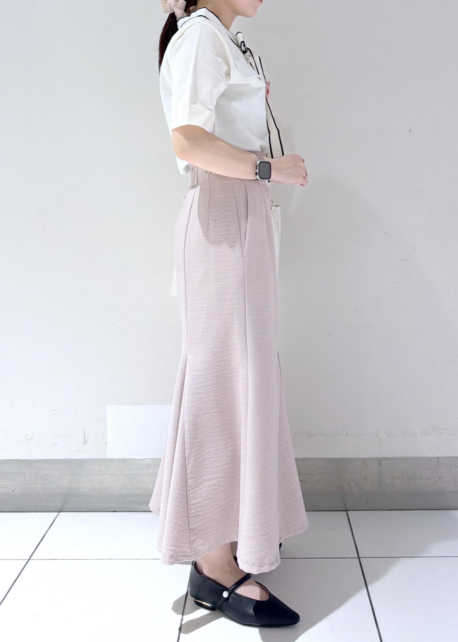 同じシリーズの『美easyリネンライクワイドパンツ』(BVS36100)はSS〜Sサイズを着用しているのですが、私は骨格ウェーブで腰周りの張りが気になるのでマーメイドスカートはSサイズにしました!