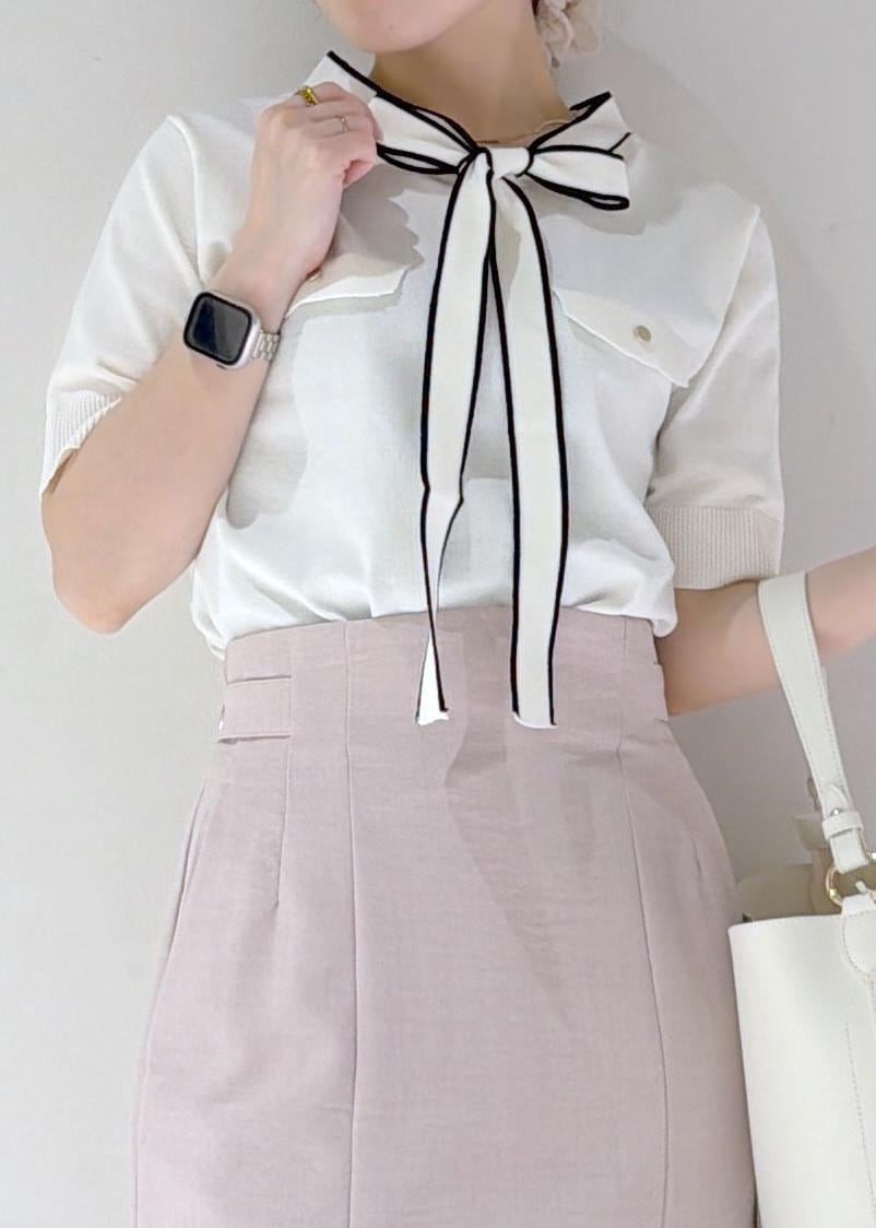 2BUY10%OFFVISリボン付き半袖ニットプルオーバー/イージーケアキナリ系 / F¥5,489レビュー肌あたりの柔らかいニットで、コンパクト感のあるデザインなのでキレイ見えするシルエットでした!