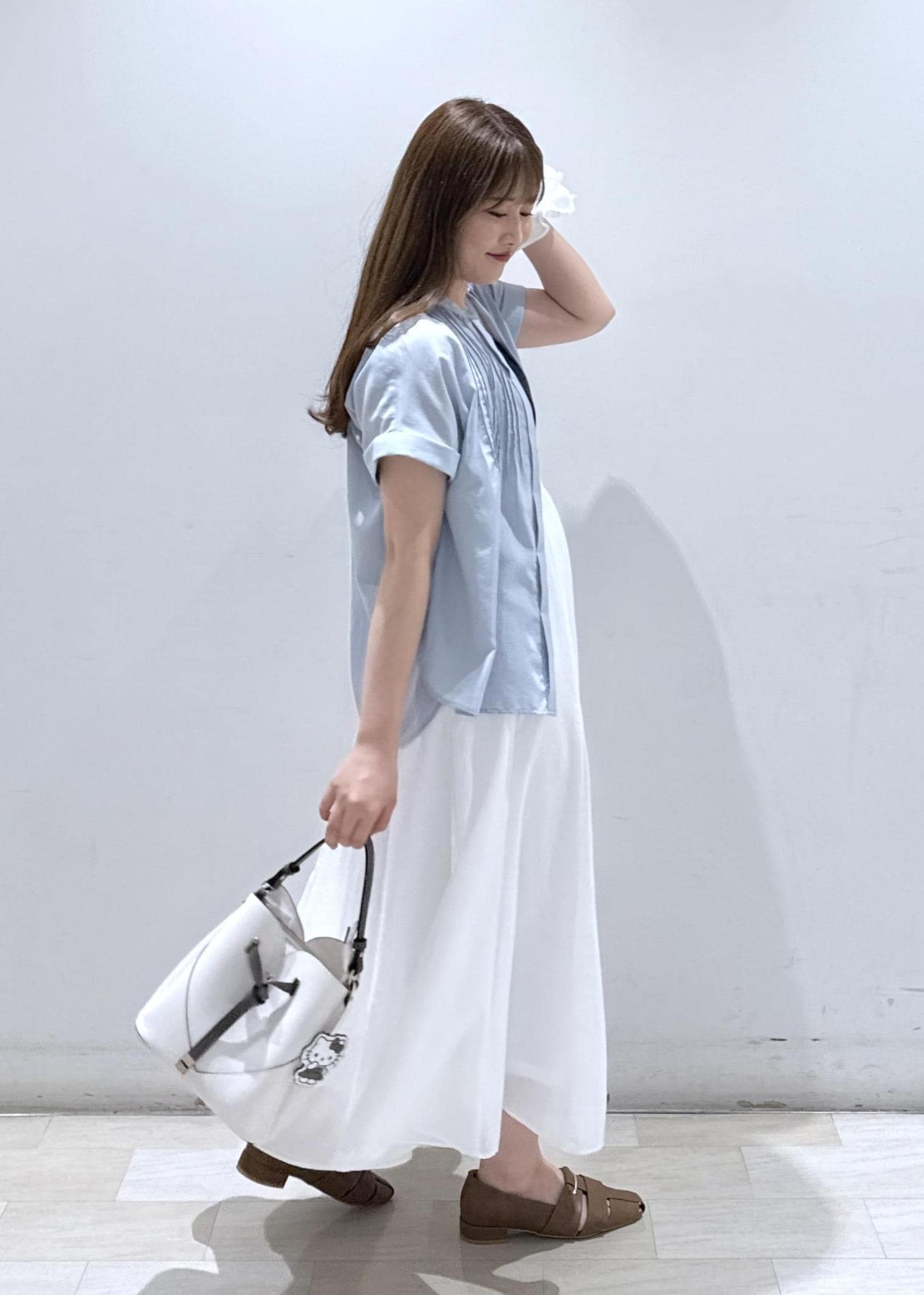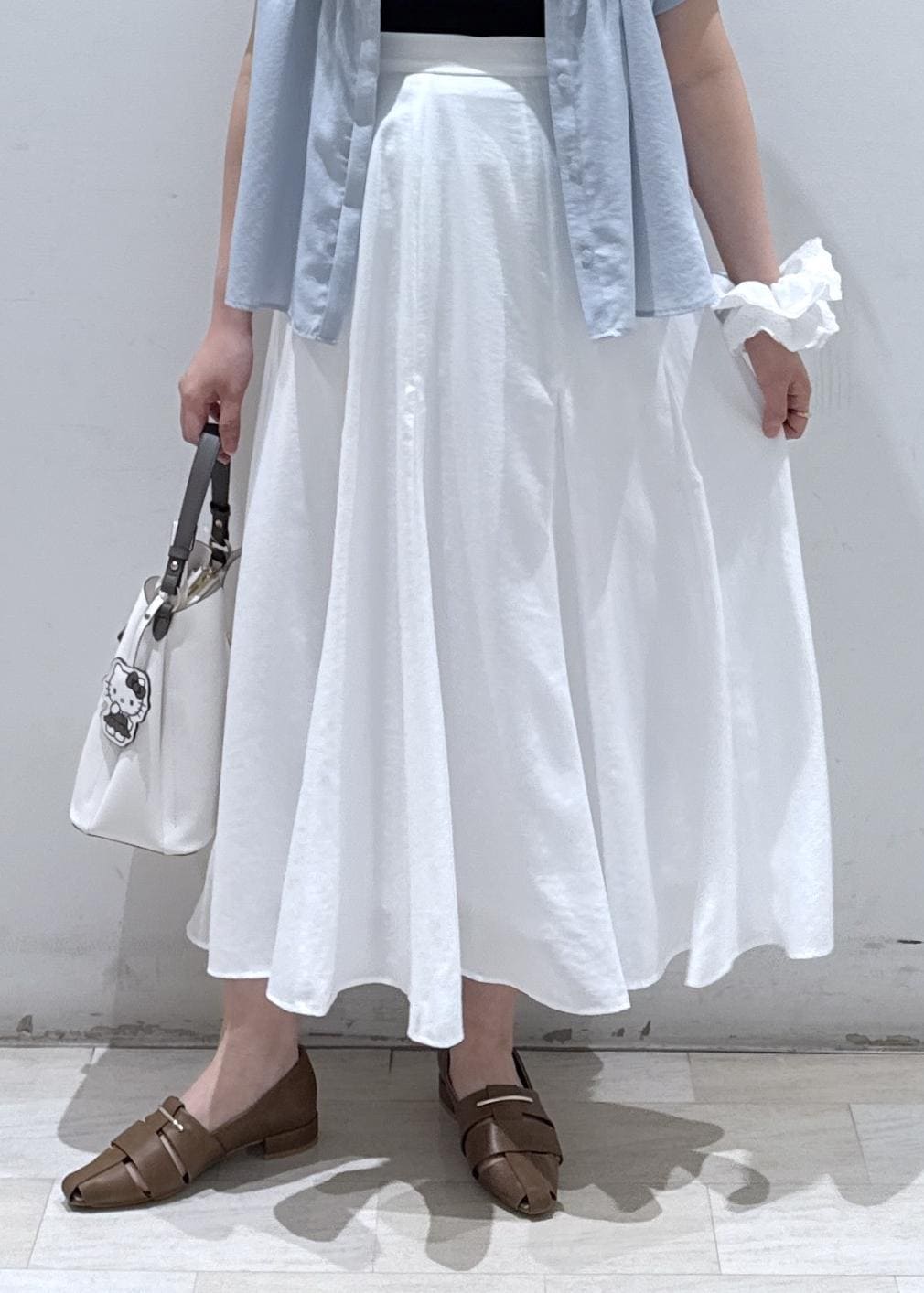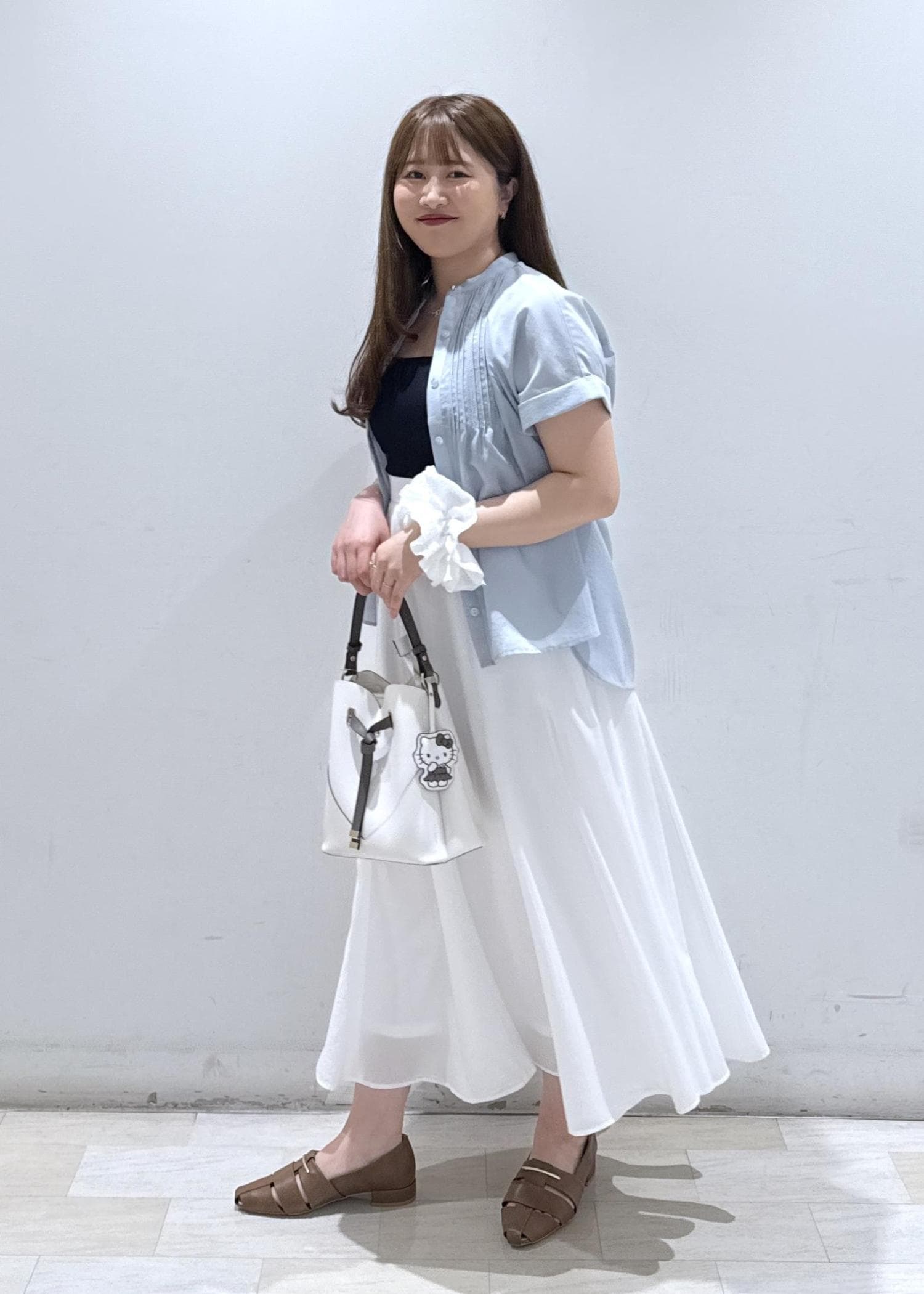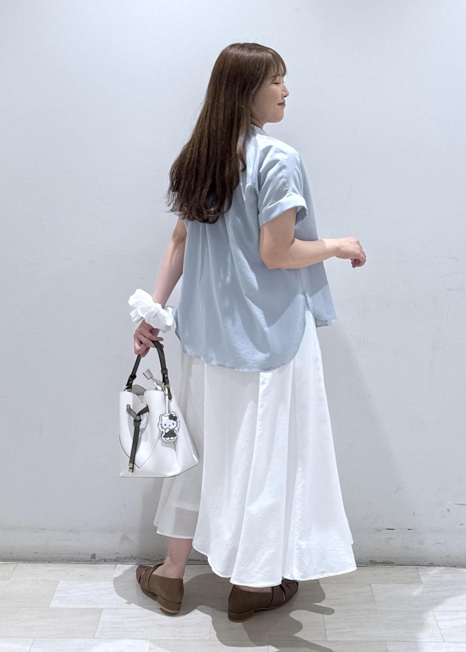 サックスブルーのカラーのシャツは、接触冷感付きなので冷たくひんやりとした涼しい素材感なのでこれからの夏にピッタリです!スカートは透け感はありませんが、フワッと女性らしい綺麗なシルエットなので着るだけでテンション上がりますよ♪
