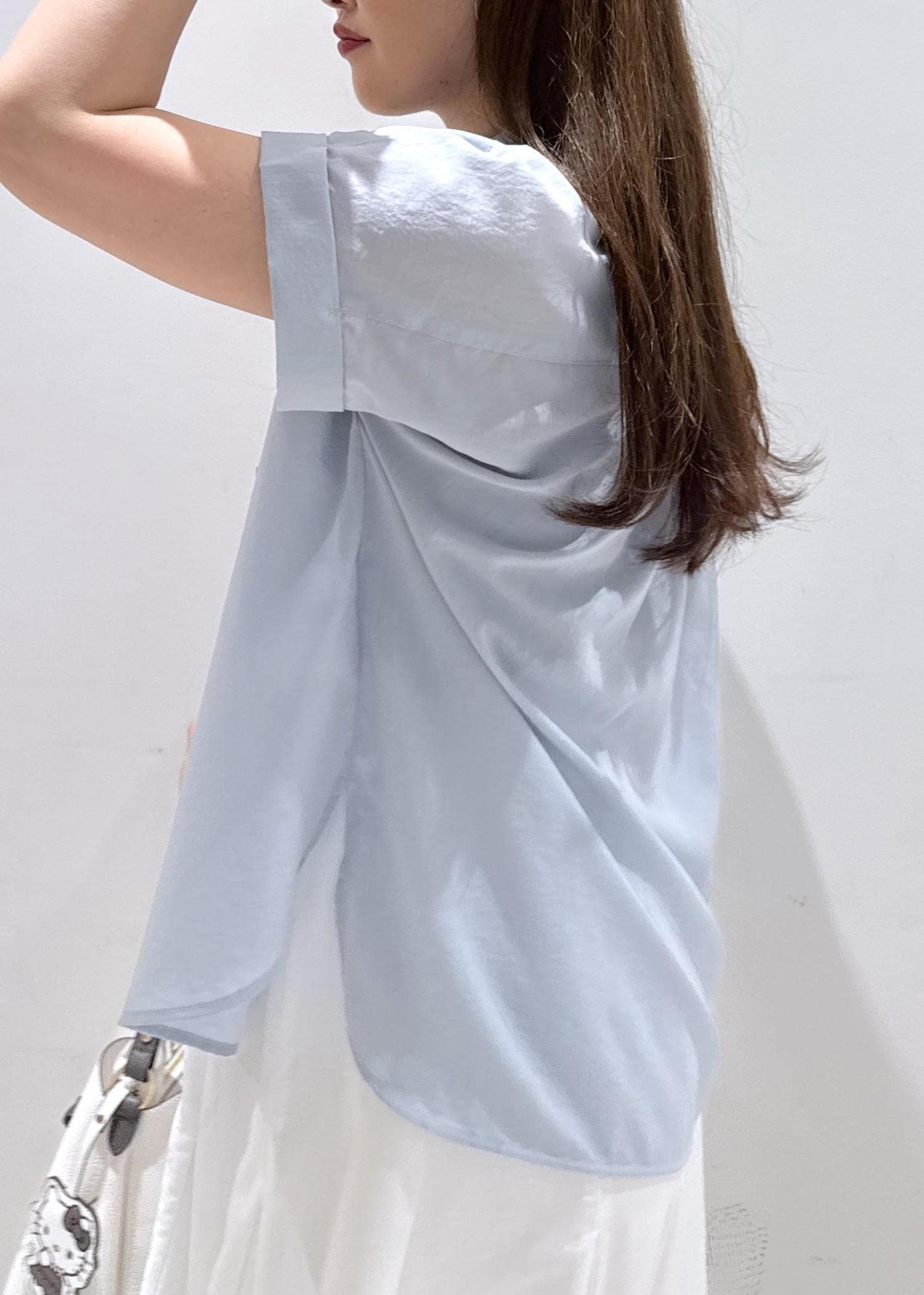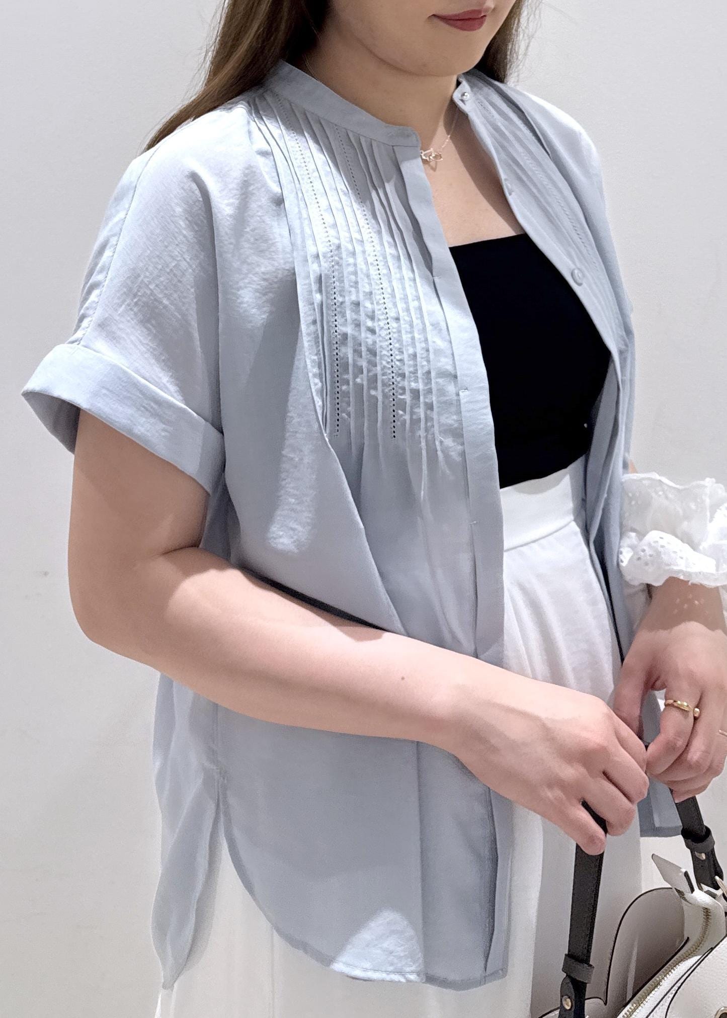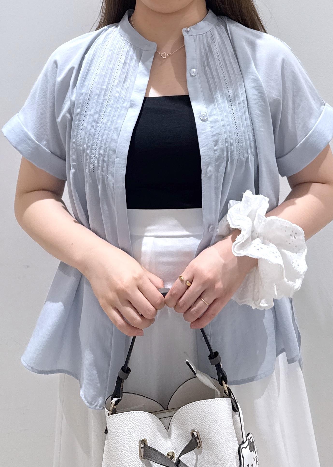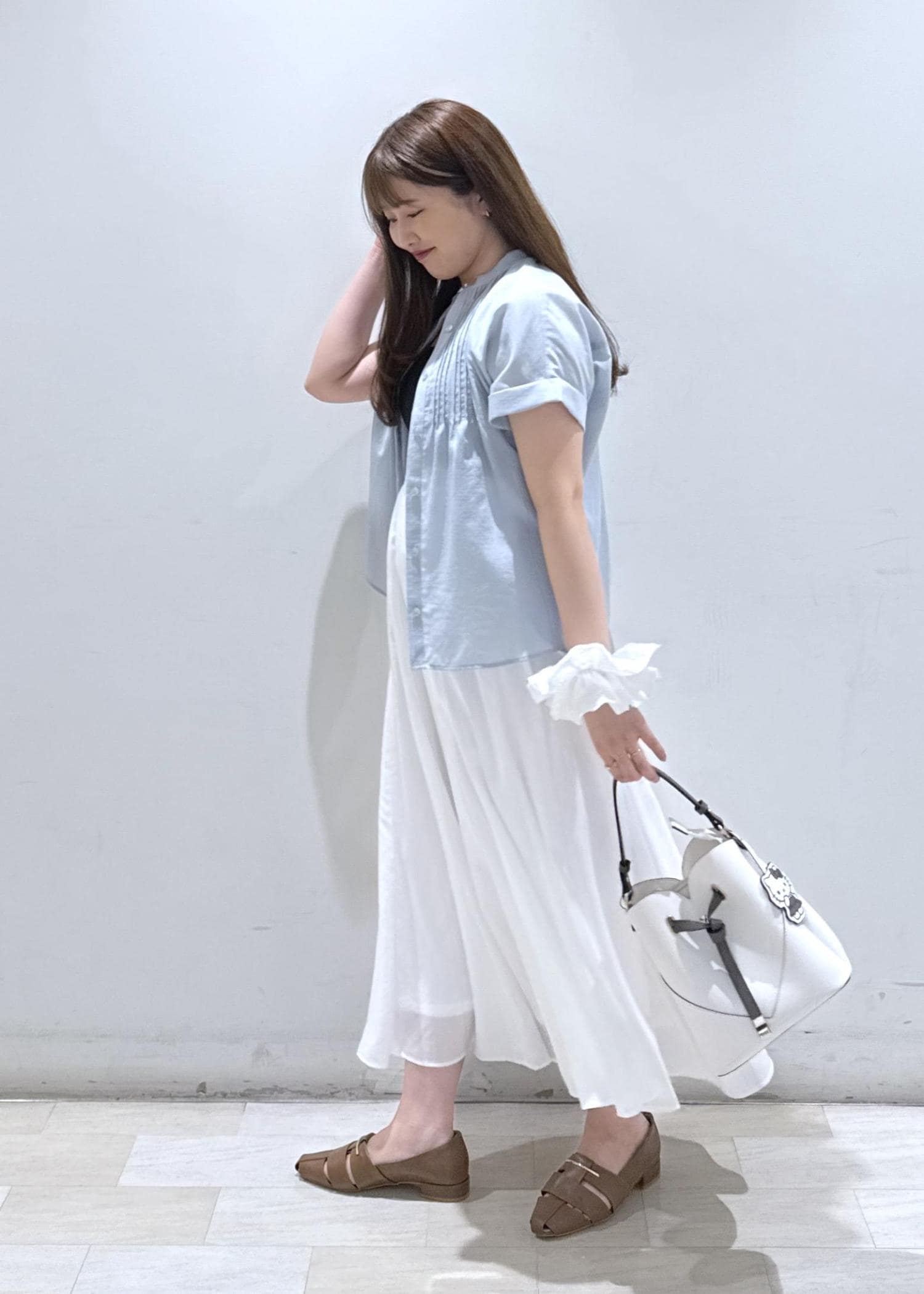 サックスブルーのカラーのシャツは、接触冷感付きなので冷たくひんやりとした涼しい素材感なのでこれからの夏にピッタリです!スカートは透け感はありませんが、フワッと女性らしい綺麗なシルエットなので着るだけでテンション上がりますよ♪