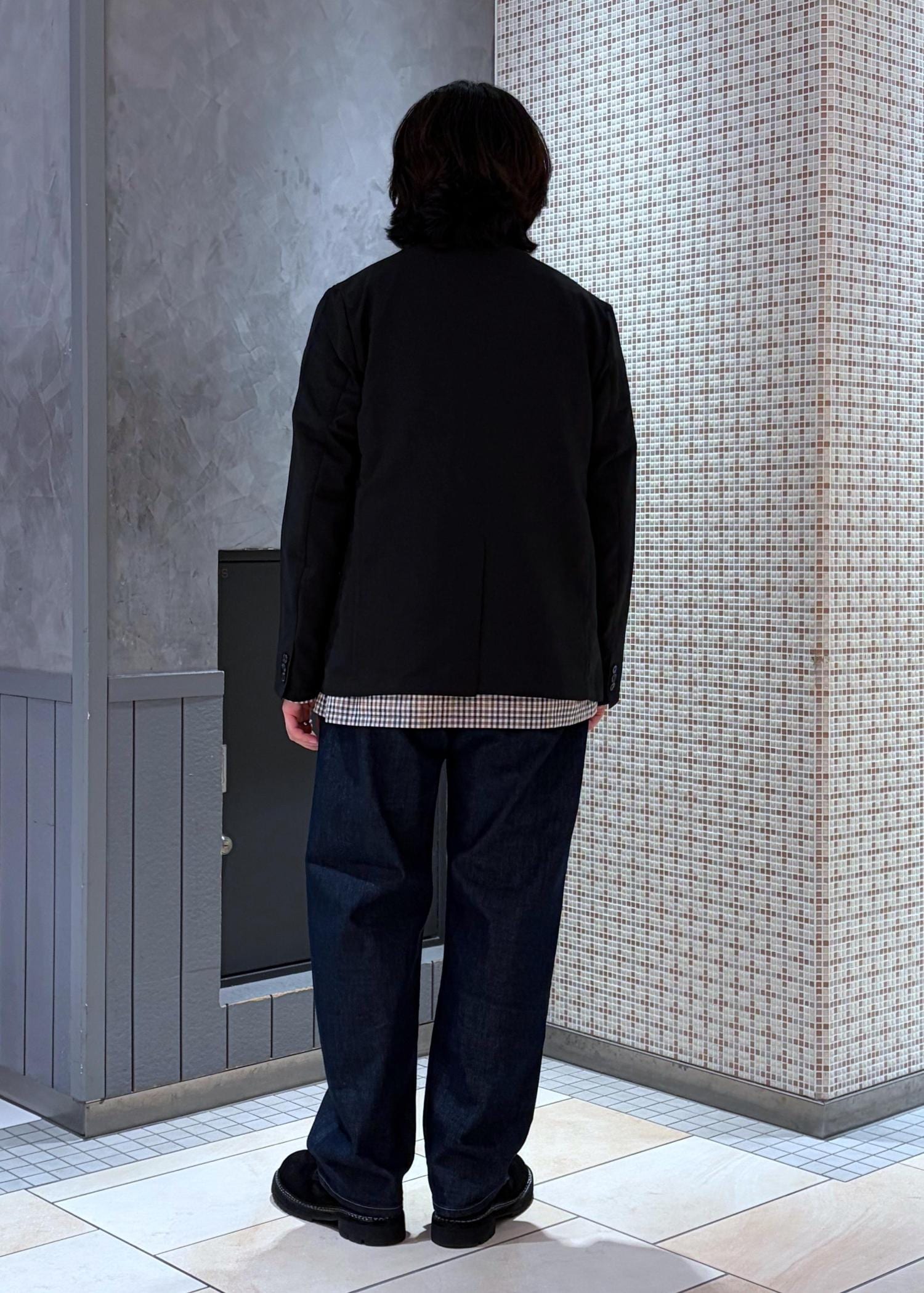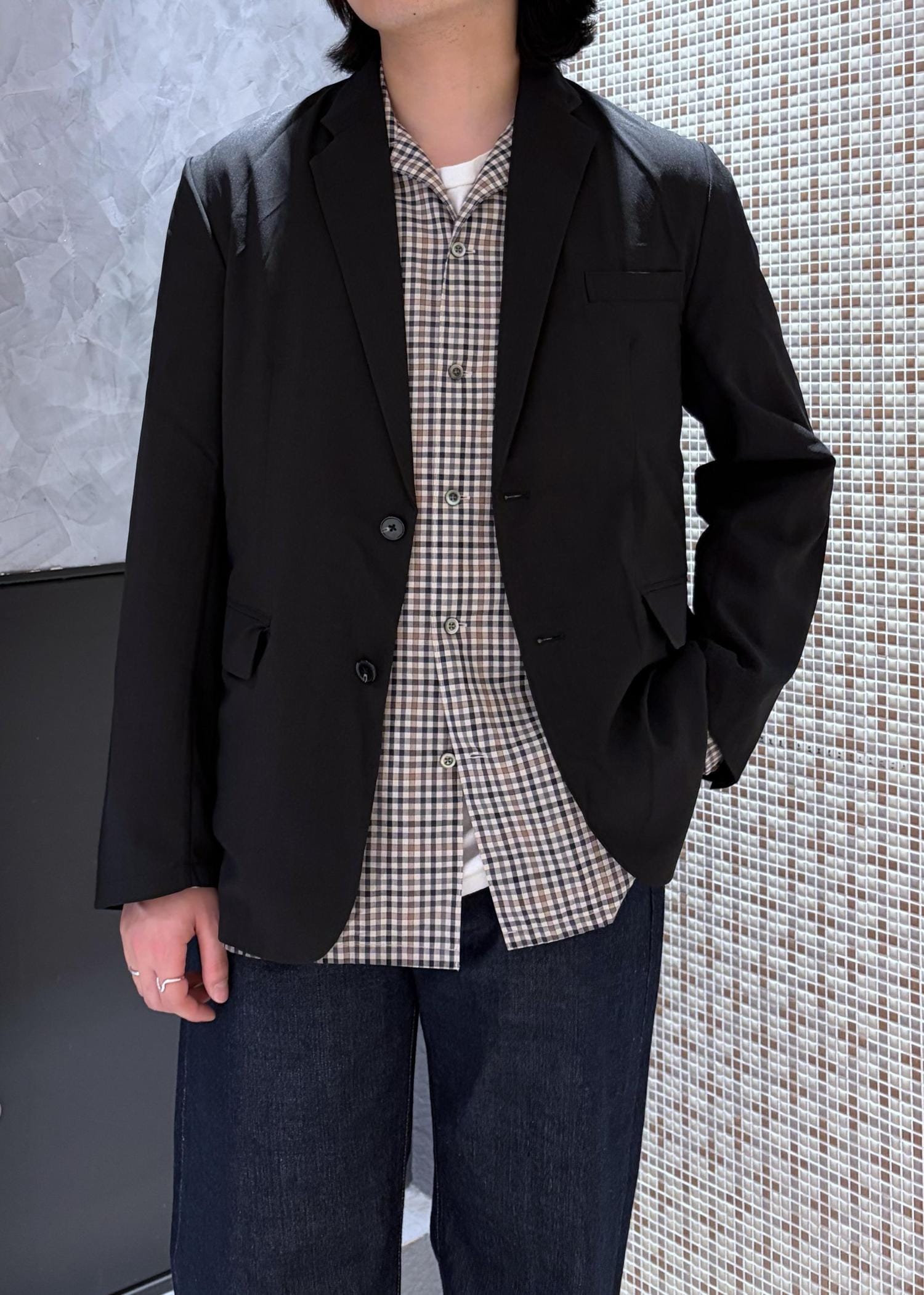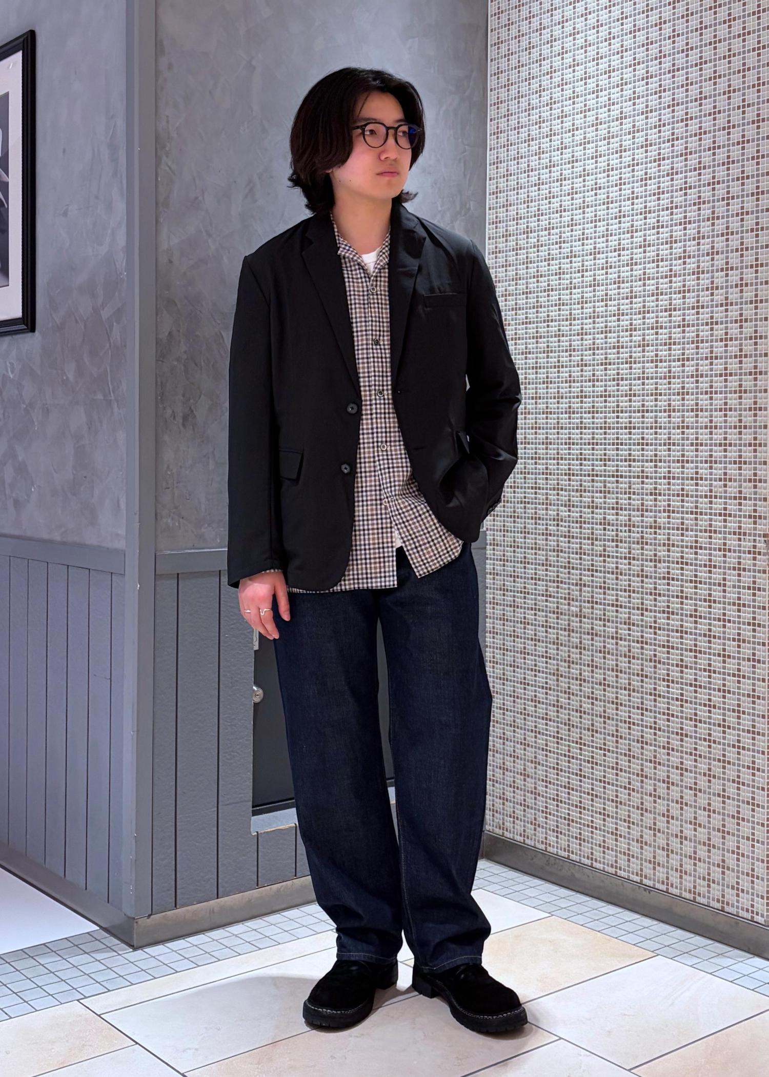 オンオフ兼用で使えるセットアップですが今回はチェックシャツにデニムとでオフのカジュアルスタイリングにしてみました。